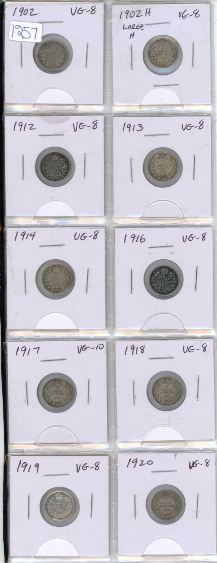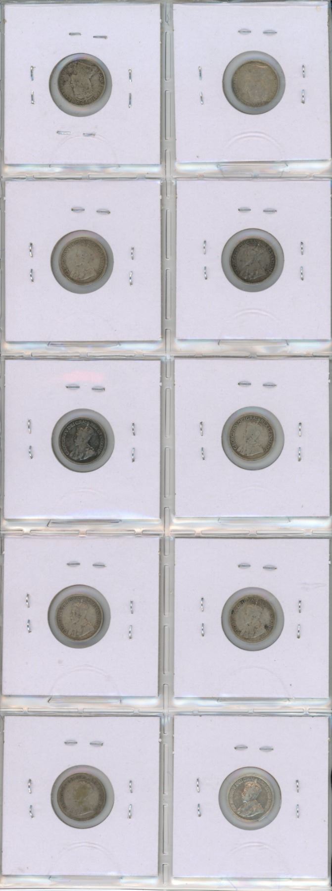 Set of 10 Canadian Silver 5 Cents. Includes 1902, 1902H Large H, 1912, 1913, 1914, 1916, 1917, 1918, 1919, 1920. Coins Grade VG-8 Or Higher