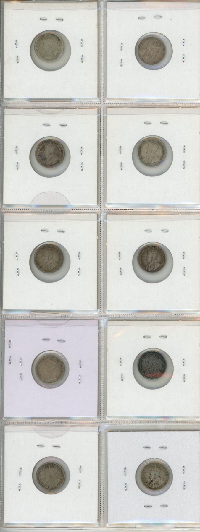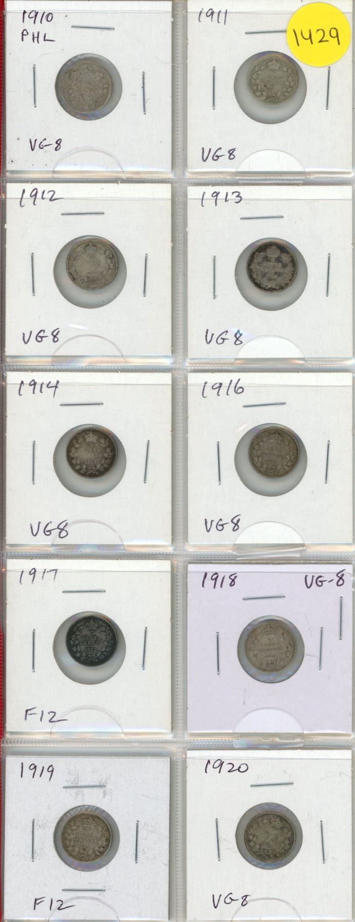 Set of 10 Canadian Silver 5 Cents from 1910 Pointed Holly Leaves to 1920. Coins grade VG8 to F12.