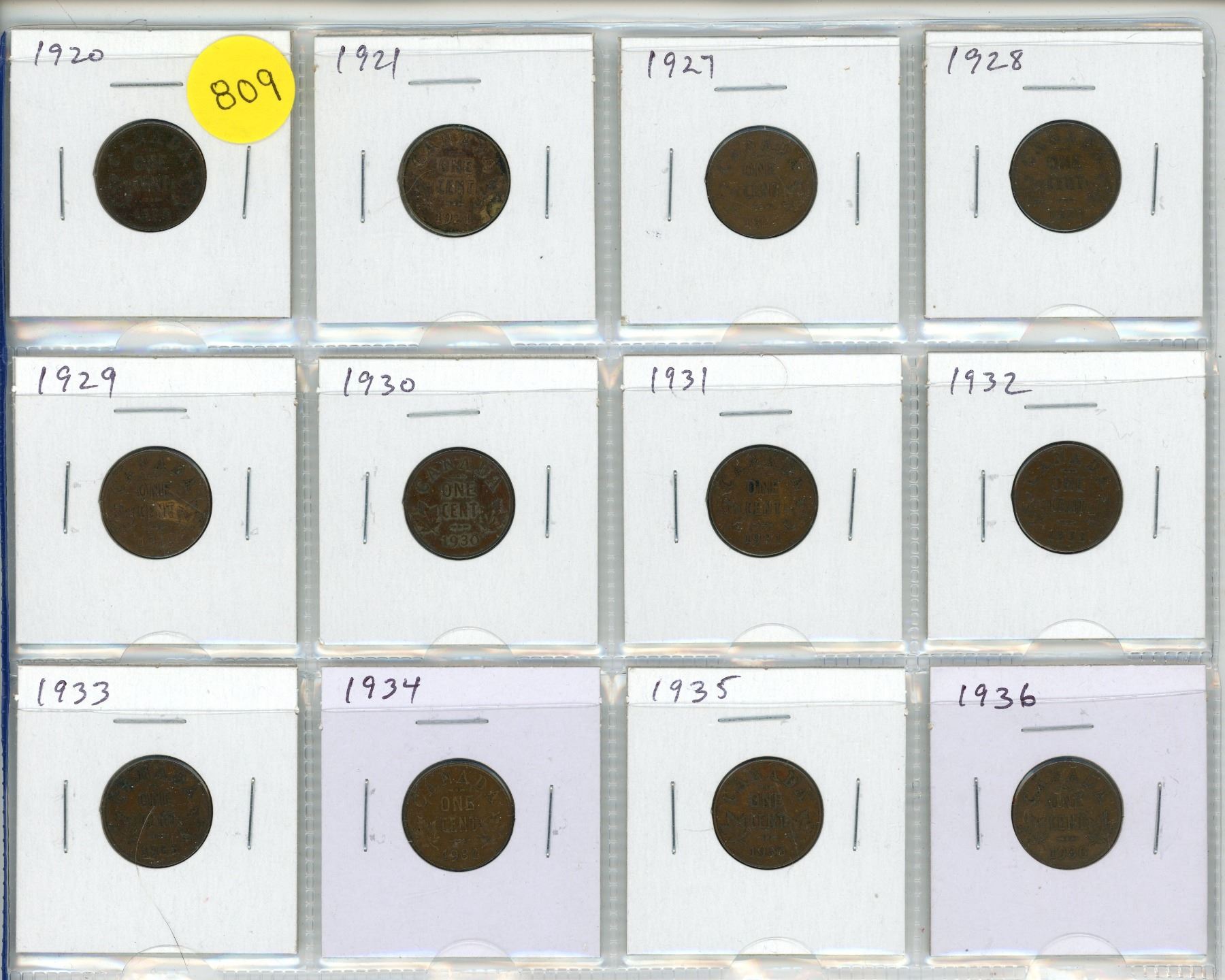 Set of 12 Canadian George V Small Cents. Includes 1920, 1921, 1927, 1928, 1929, 1930, 1931, 1932, 1933, 1934, 1935 & 1936. Average Grades.