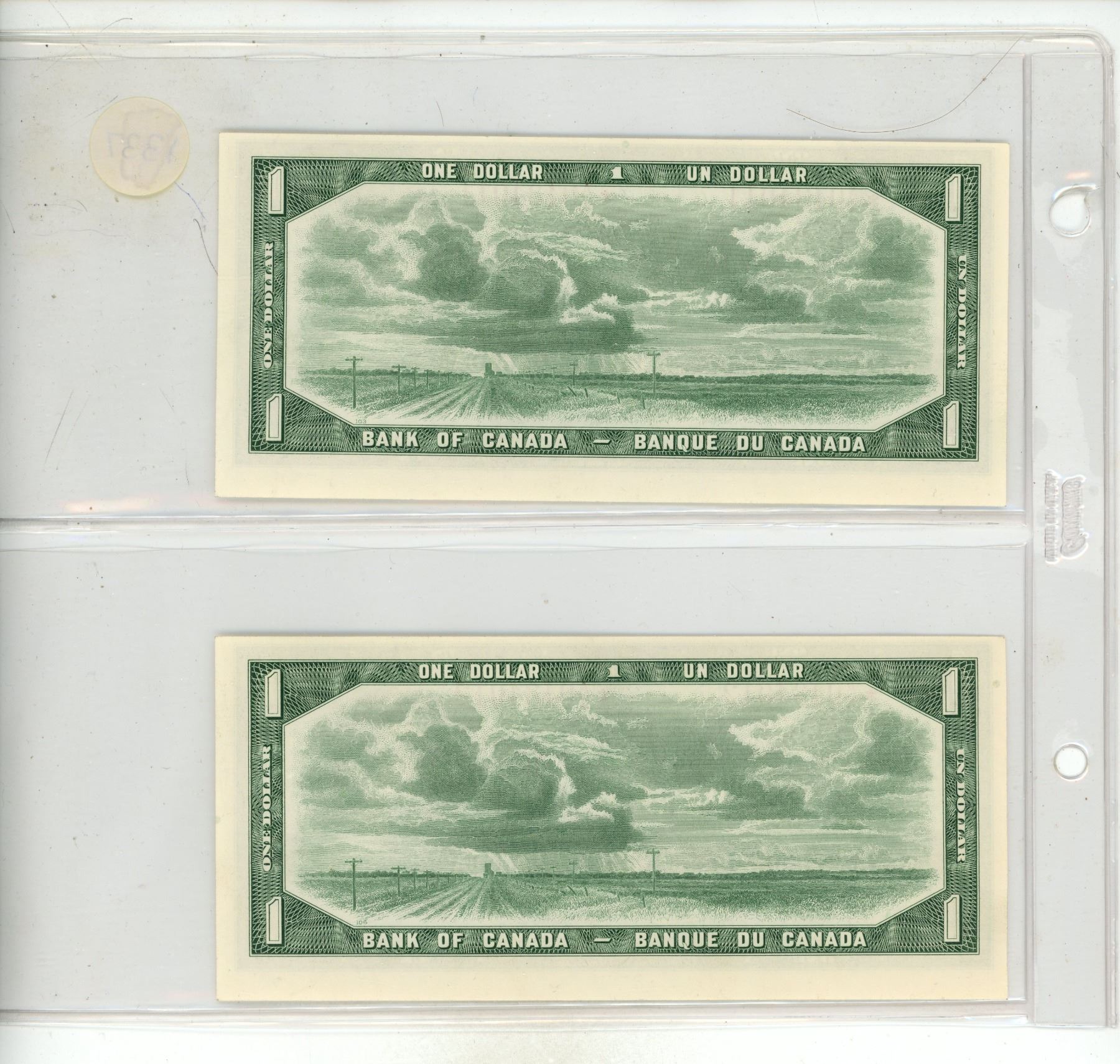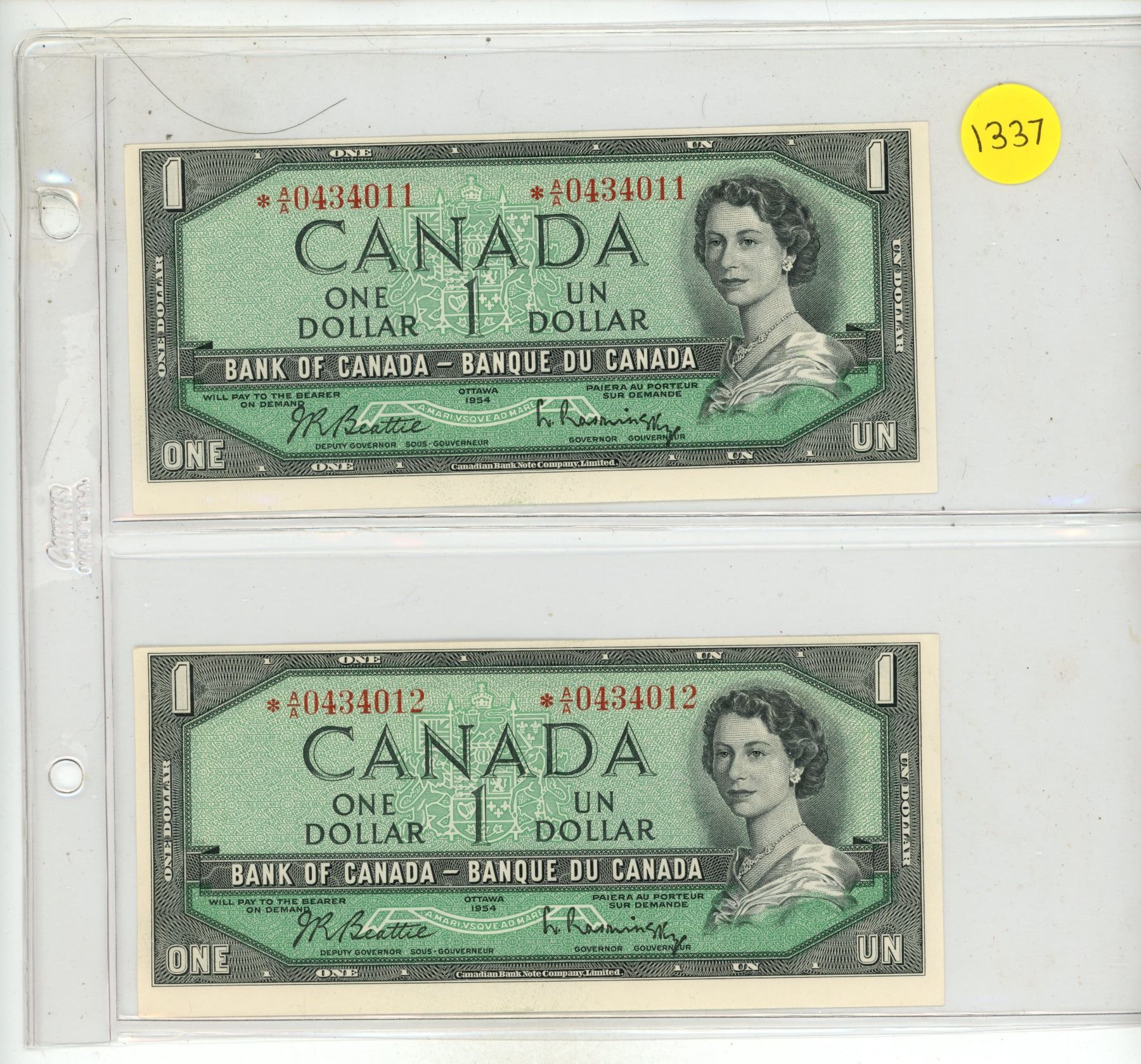 Set of 2 Consecutive Serial Number 1954 Modified Portrait $1 Replacement notes. Beattie-Rasminsky signatures. *A/A Replacement Prefix. Serial Numbers 0434011 and 0434012.