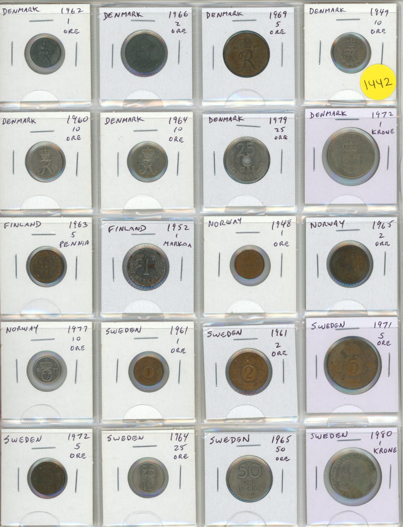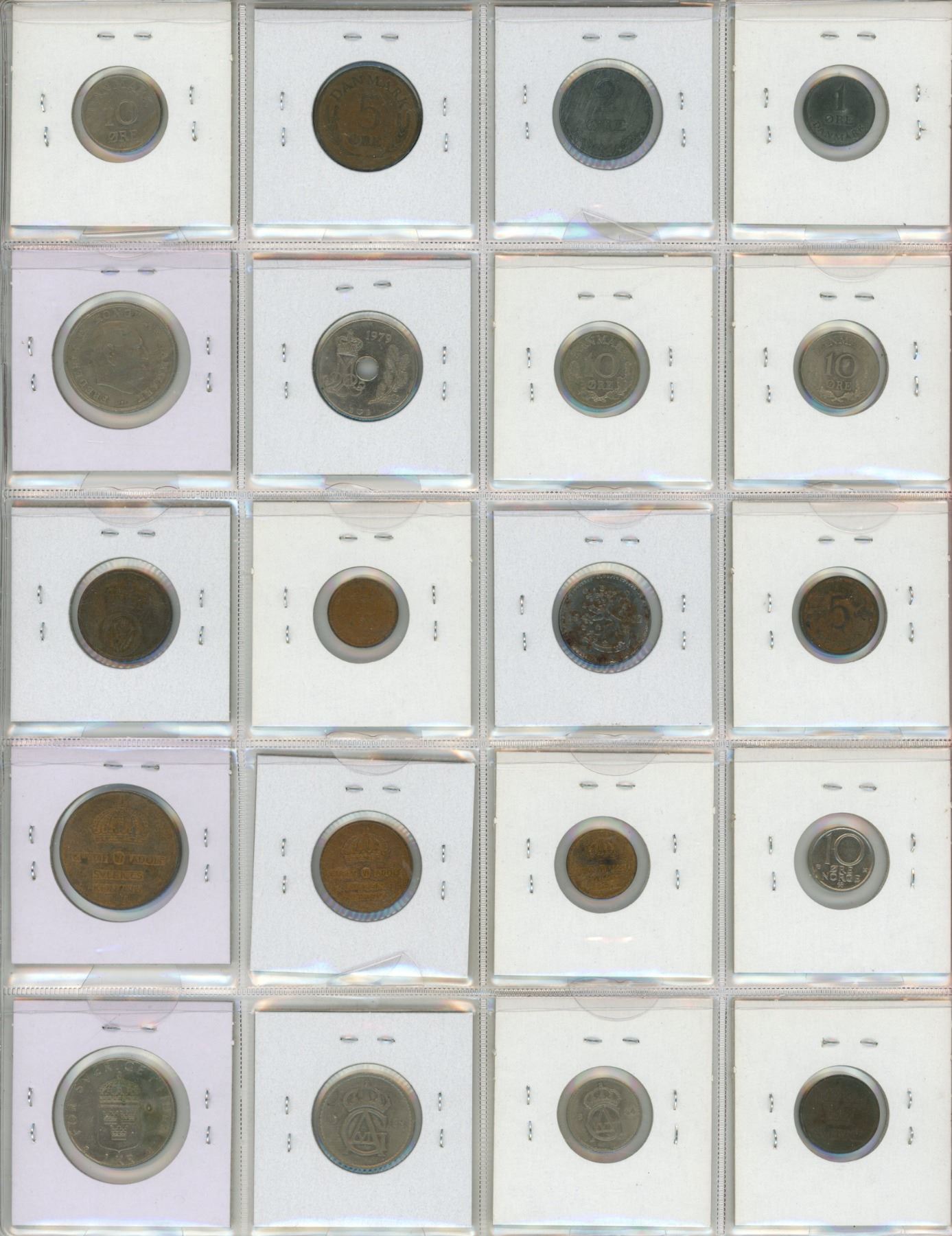 Set of 20 Scandinavian coins from Denmark, Finland, Norway and Sweden.