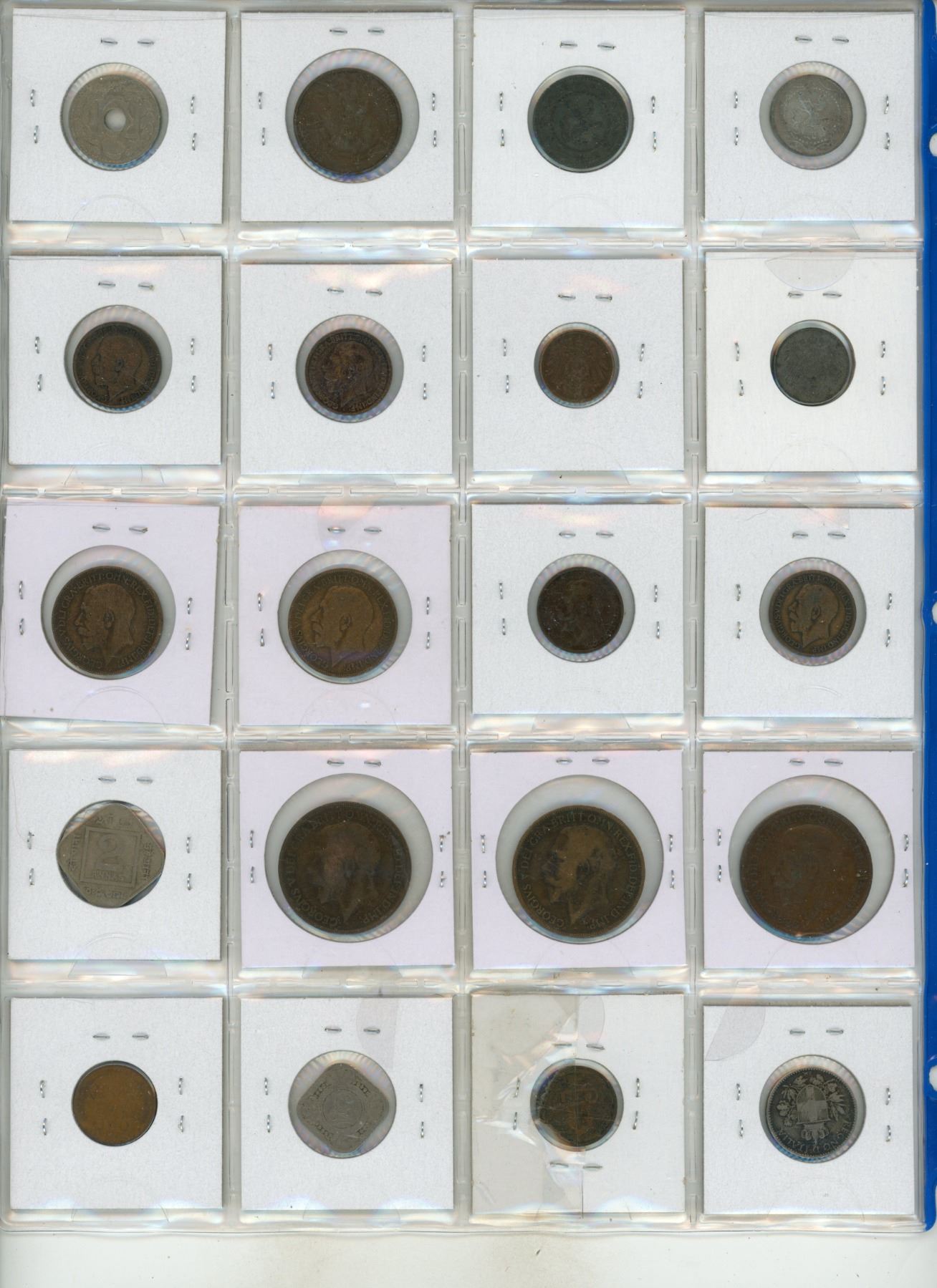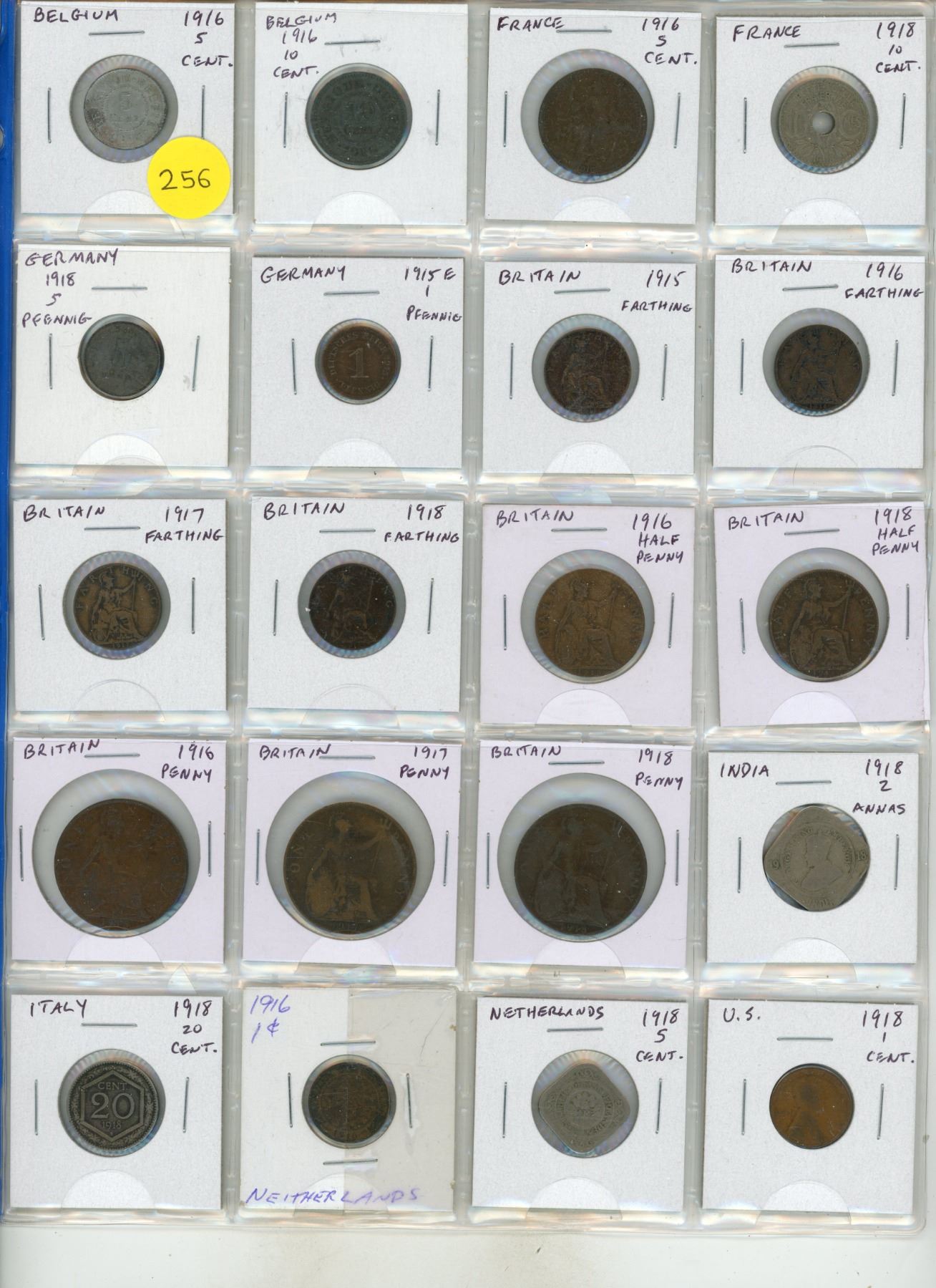 Set of 20 World War I coins from Belgium, France, Germany, Britain, India, Italy, Netherlands and US