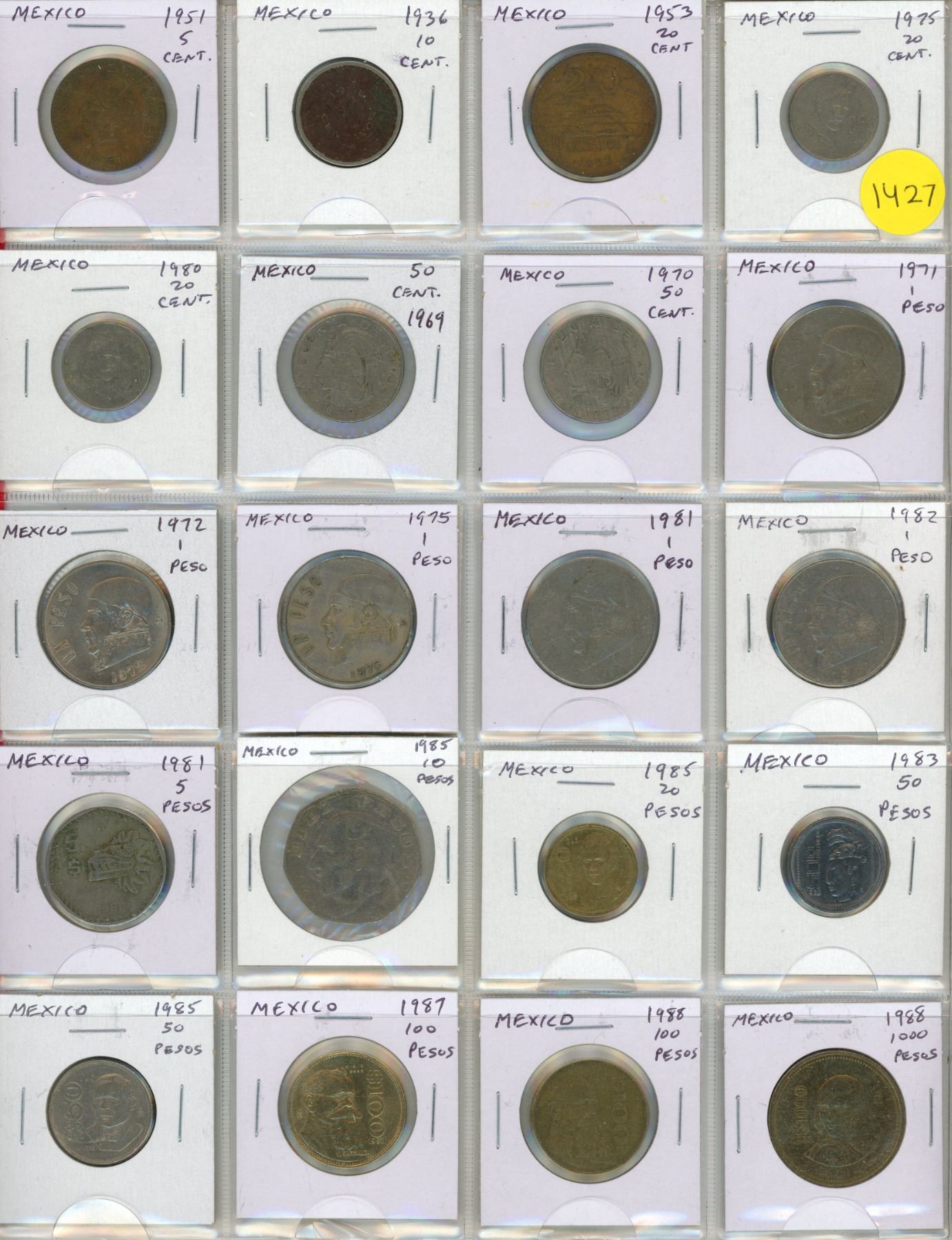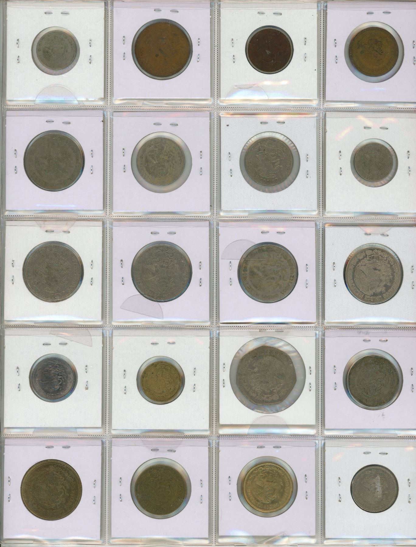 Set of 20 old Mexican coins up to 1000 pesos.