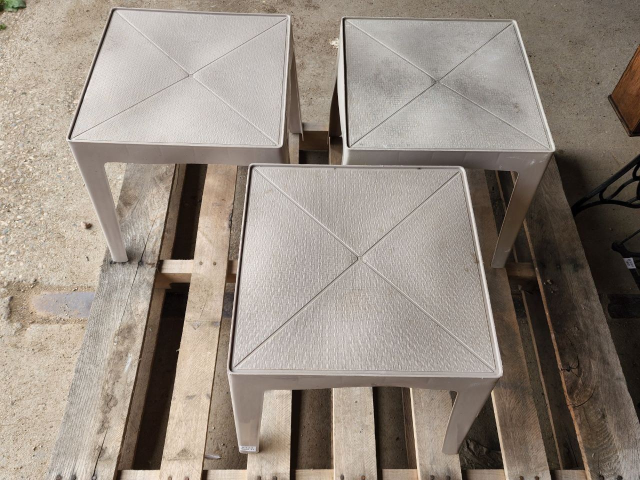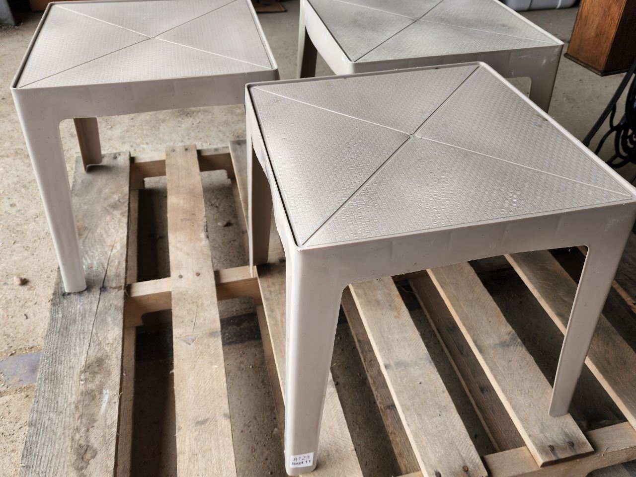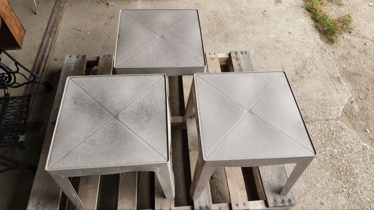 Set of 3, Beige Plastic Square Lawn End Tables. H-1Ft 4" W-1Ft 4" D-1ft 4"