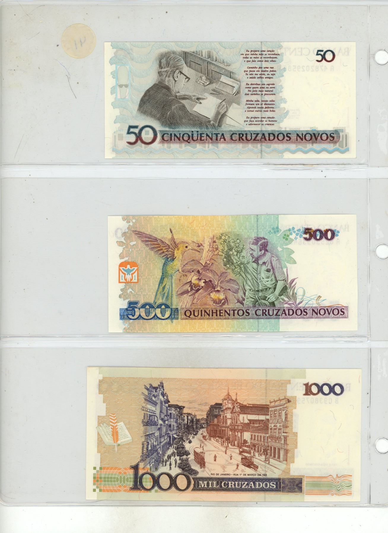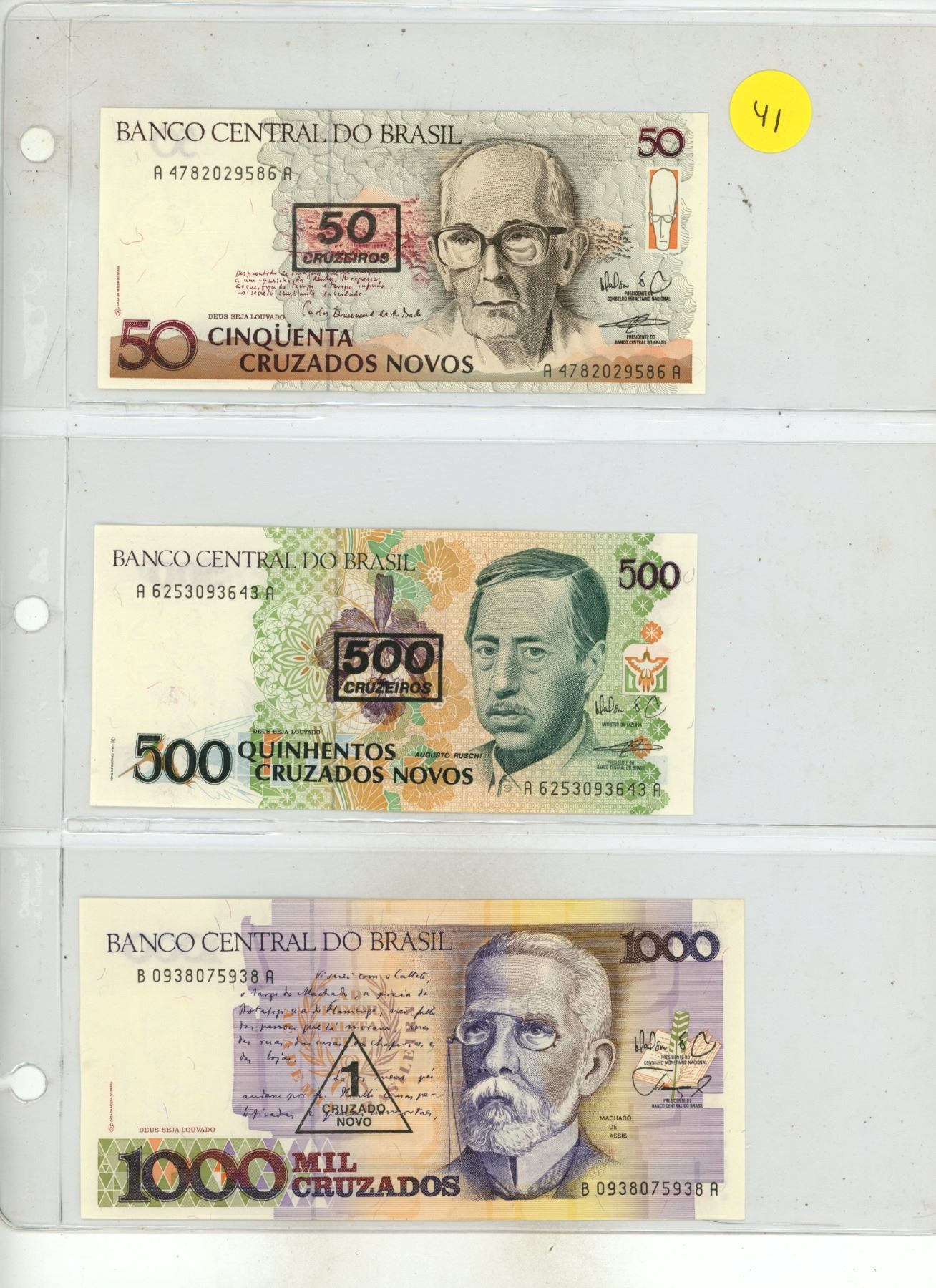 Set of 3 Central Bank of Brazil Overprinted notes. Includes 50 Cruzeiros, 500 Cruzeiros and 1 Cruzado Novo. Uncirculated.