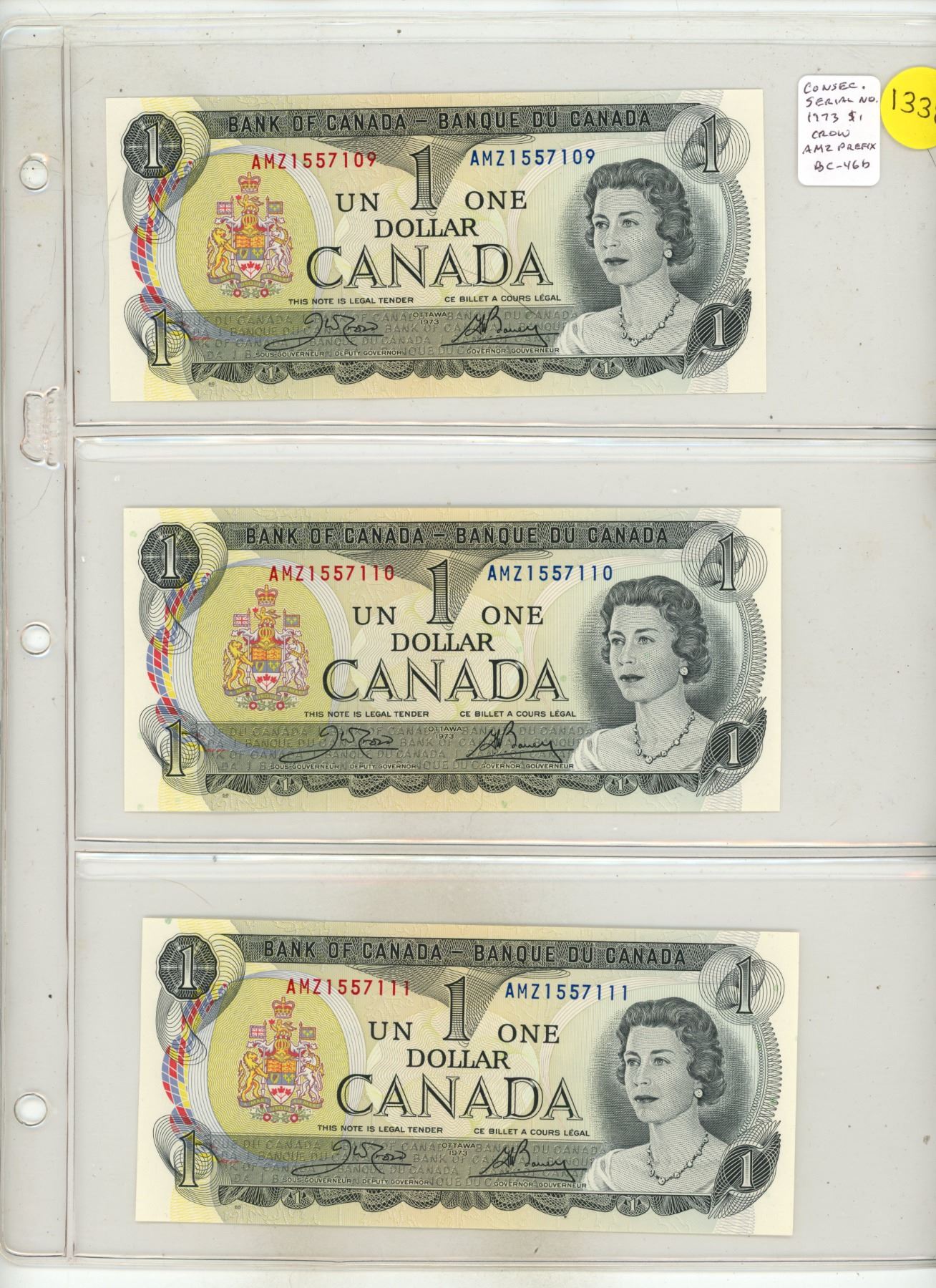 Set of 3 Consecutive Serial Number 1973 $1. Notes. Crow-Bouey signatures. AMZ Prefix. BC-46b. Serial Numbers 1557109, 1557110 and 1557111.