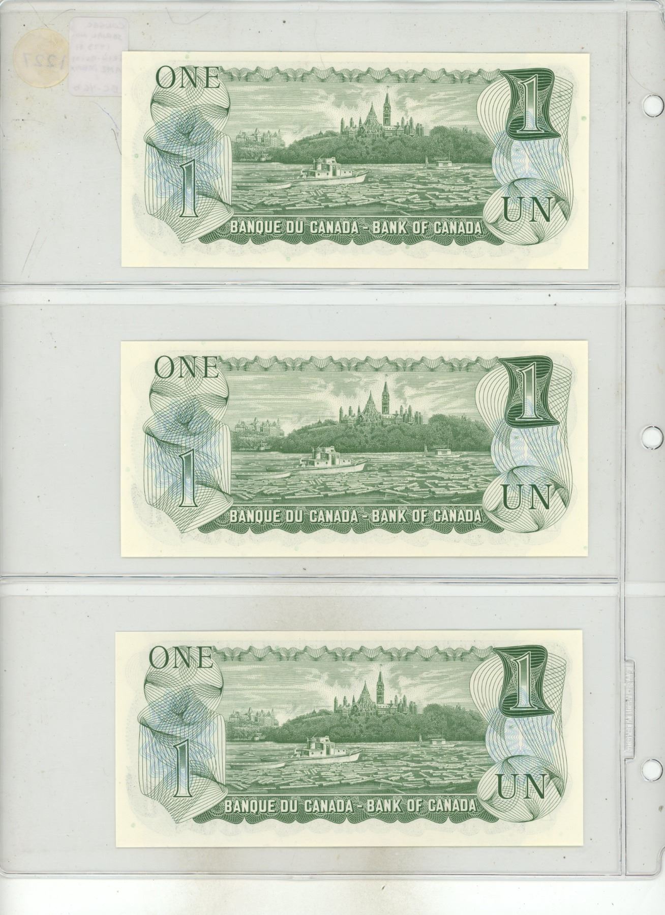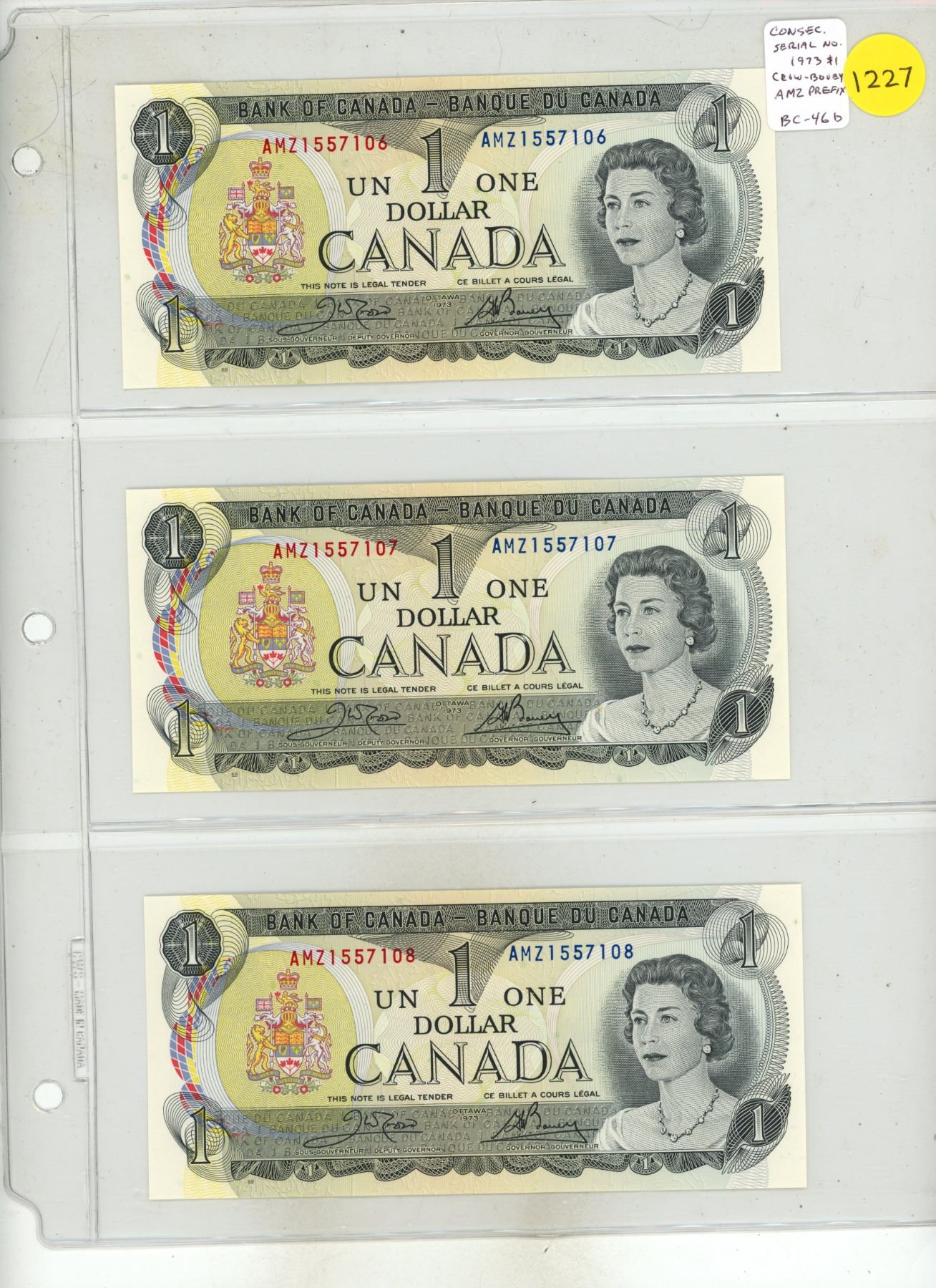 Set of 3 Consecutive Serial Number Canadian 1973 $1 notes. Crow-Bouey signatures. AMZ Prefix. BC-46b. Serial Numbers 1557106, 1557107, 1557108.