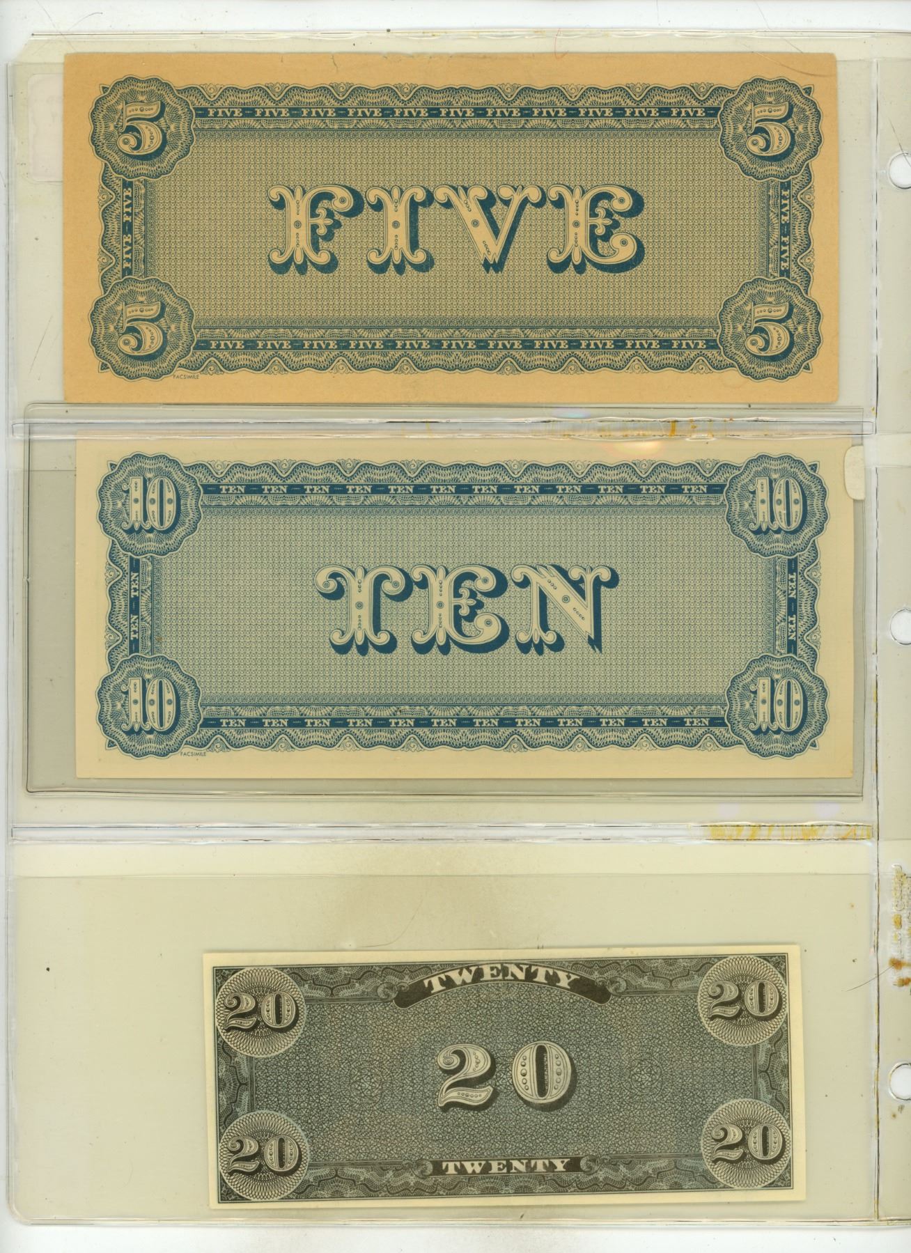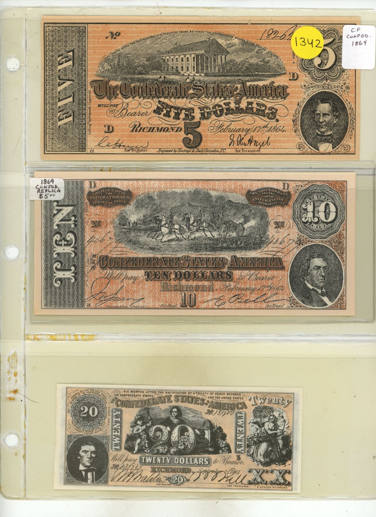 Set of 3 Counterfeit Confederate States of America notes. 1864 $5, $10 and $20. None of these are real notes.