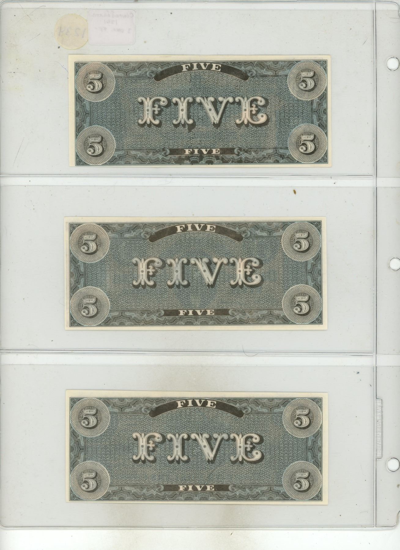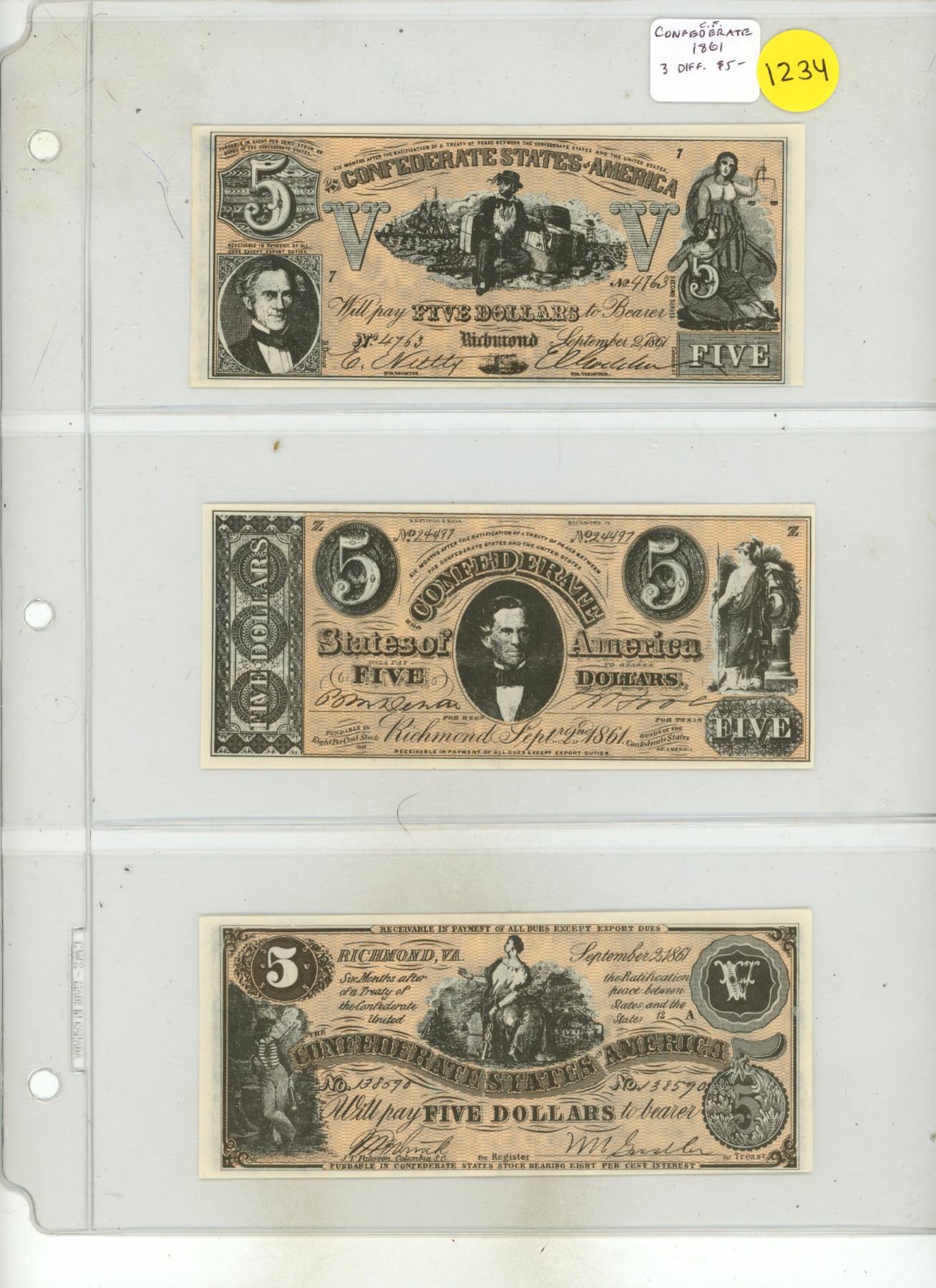Set of 3 Counterfeit Confederate States of America notes All are dated 1861 with 3 different types of $5 notes. None are real.