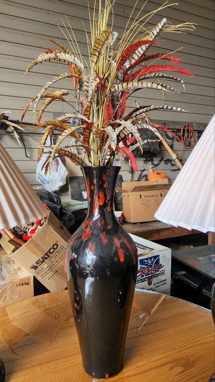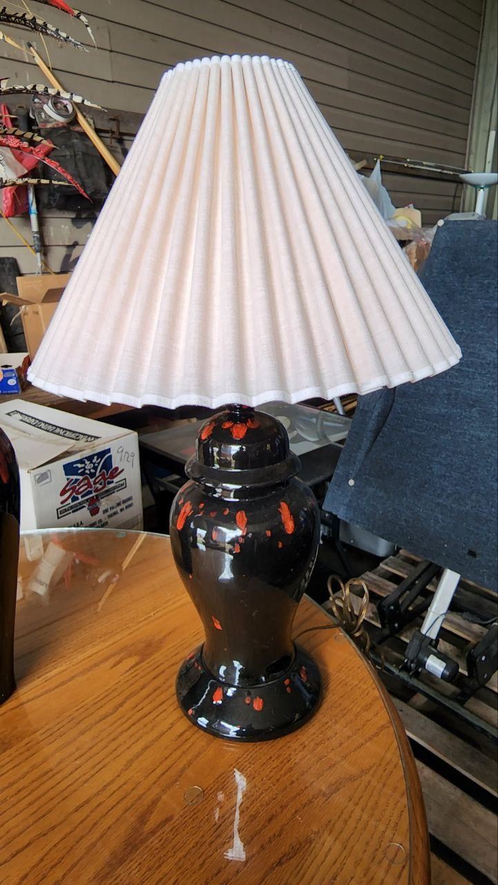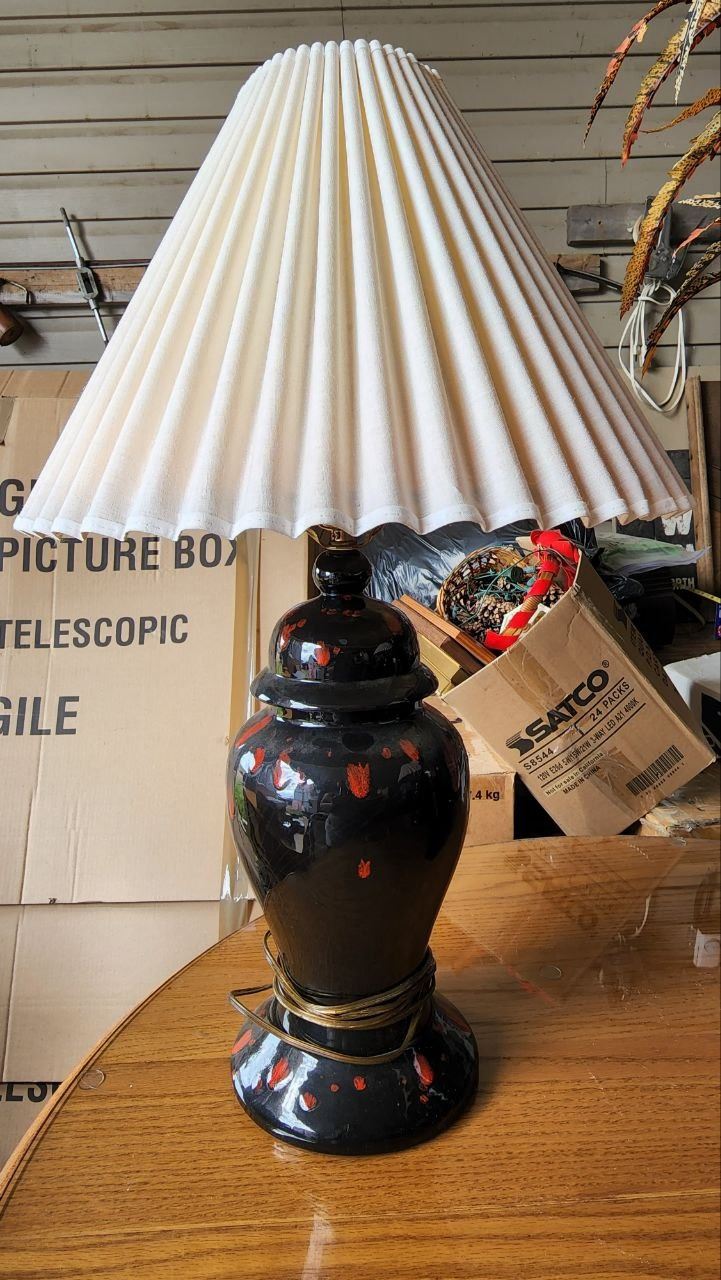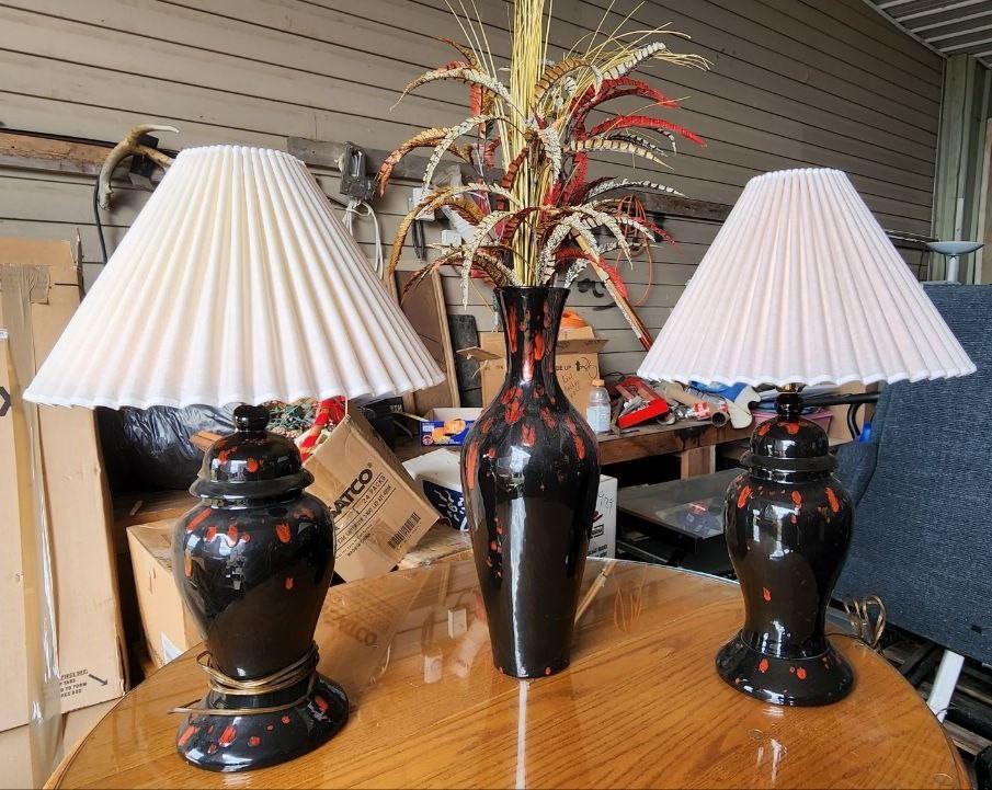Set of 3, Matching Black/Red Lamps and Vase with décor