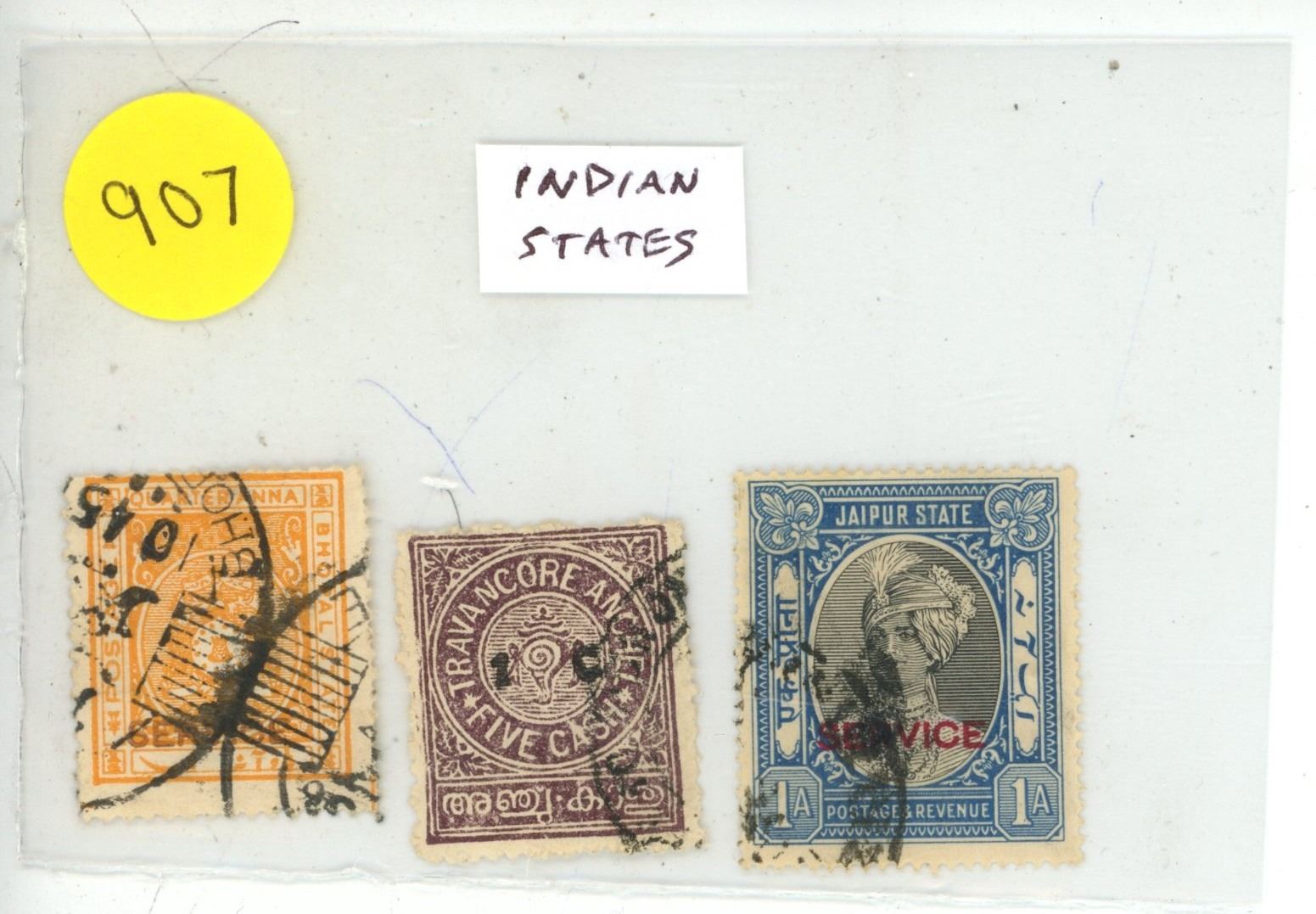 Set of 3 old Stamps from Indian States including Bhopal, Travancore & Jaipur. Used.