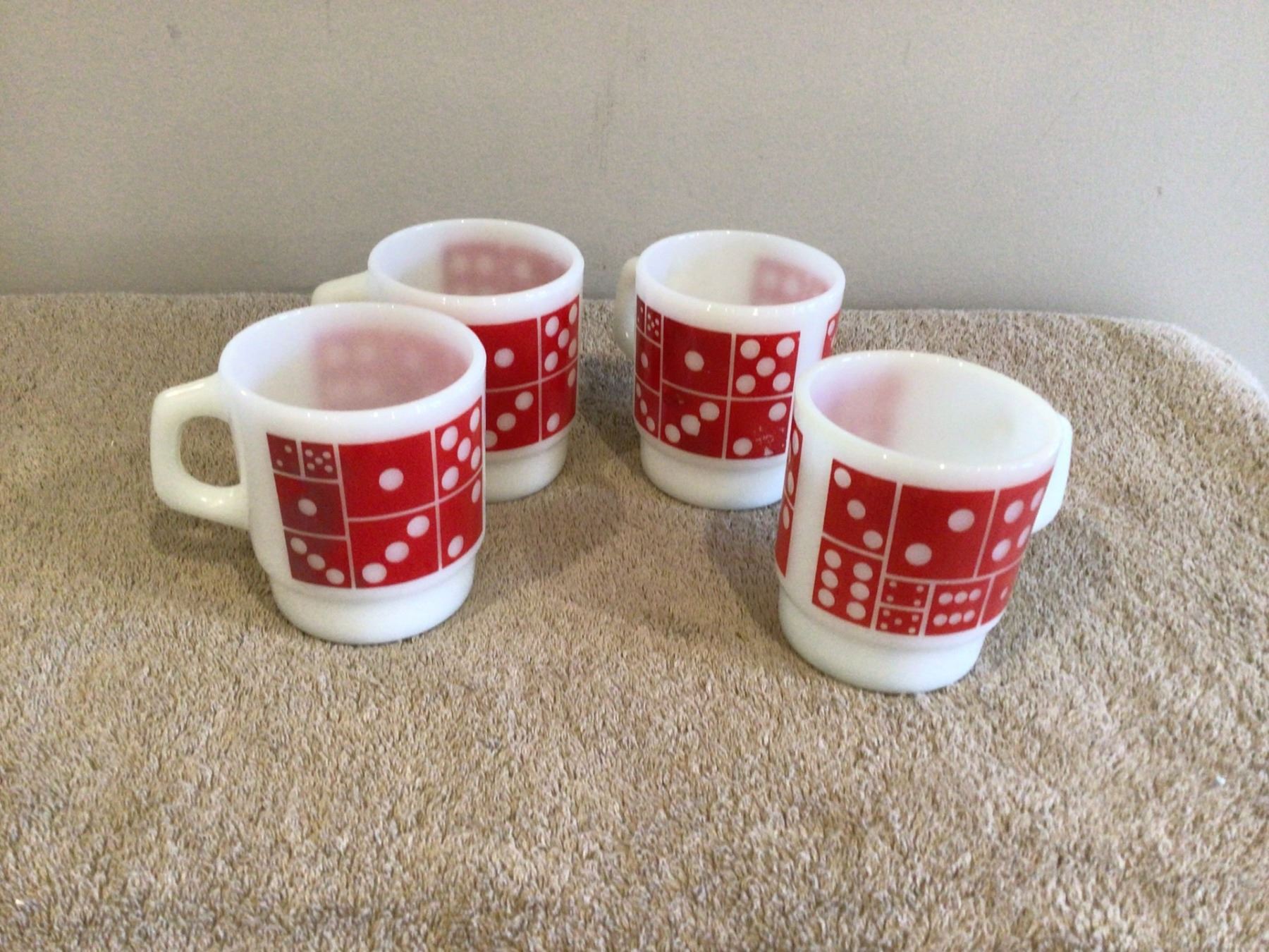 Set of 4 Anchor Hocking red dice milk glass coffee mugs. No chips, cracks or stains.