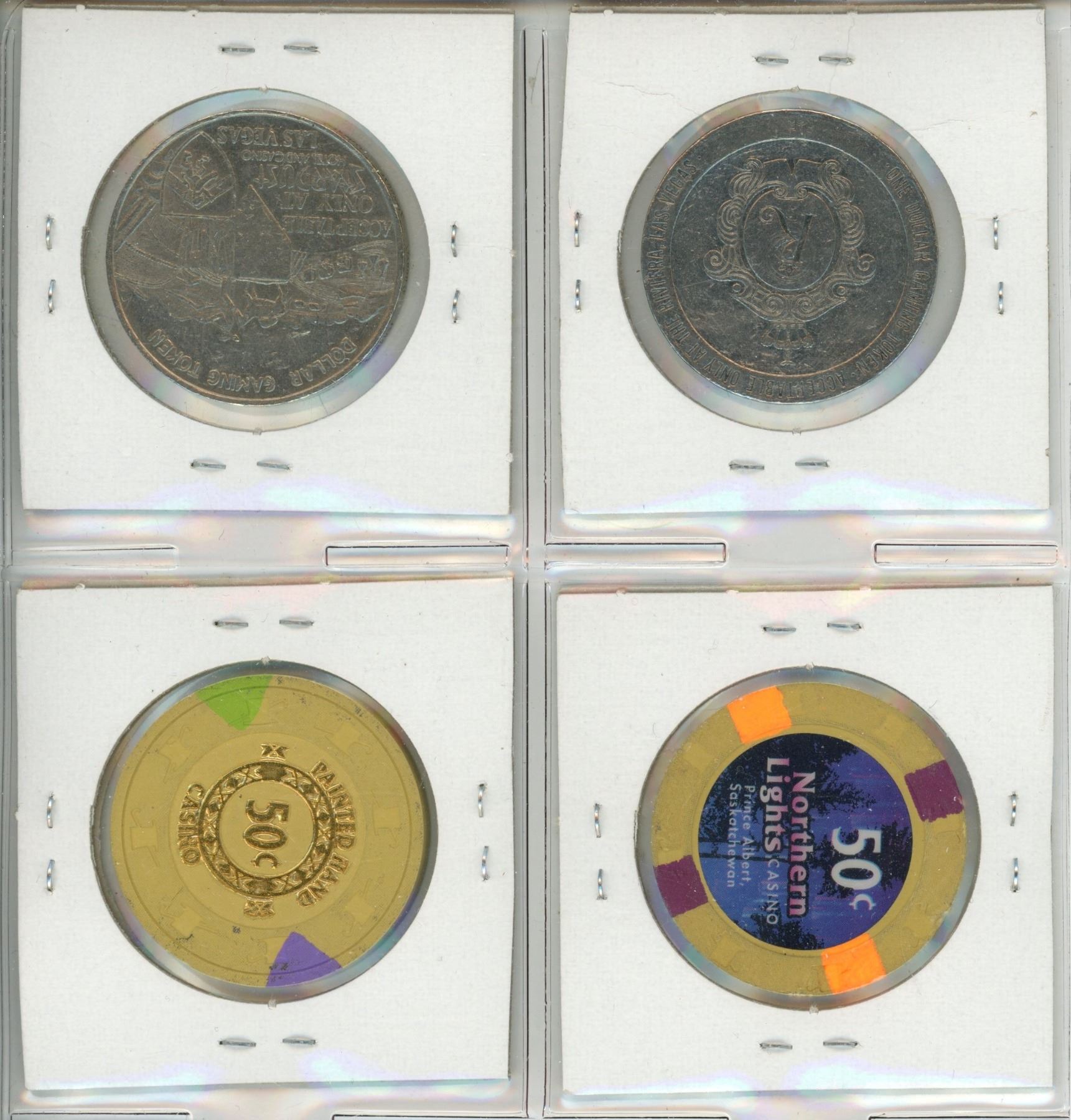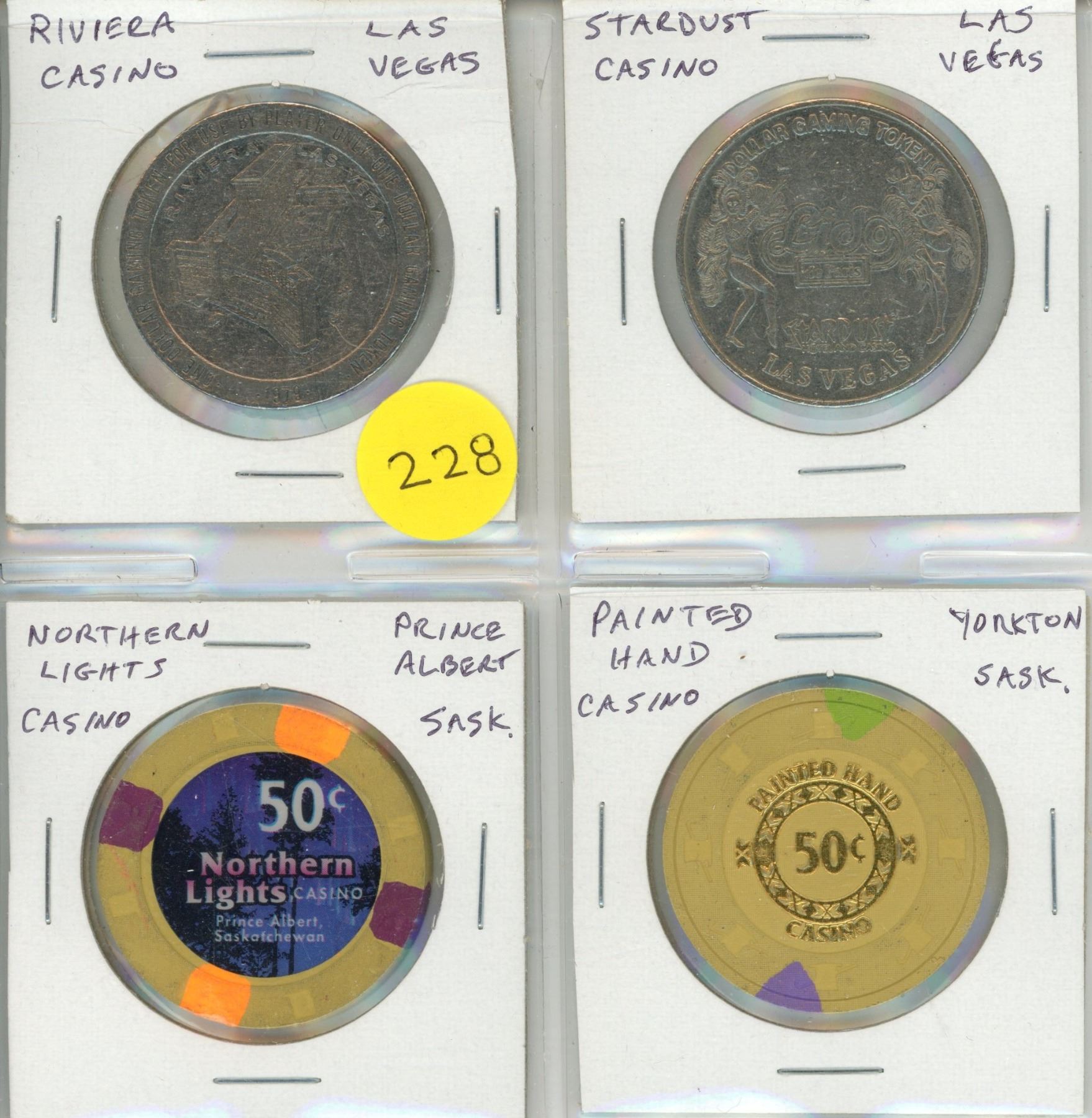 Set of 4 Casino Tokens. From Las Vegas plus Northern Lights & Painted Hand.