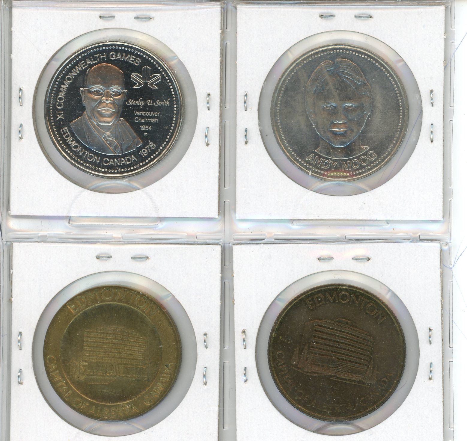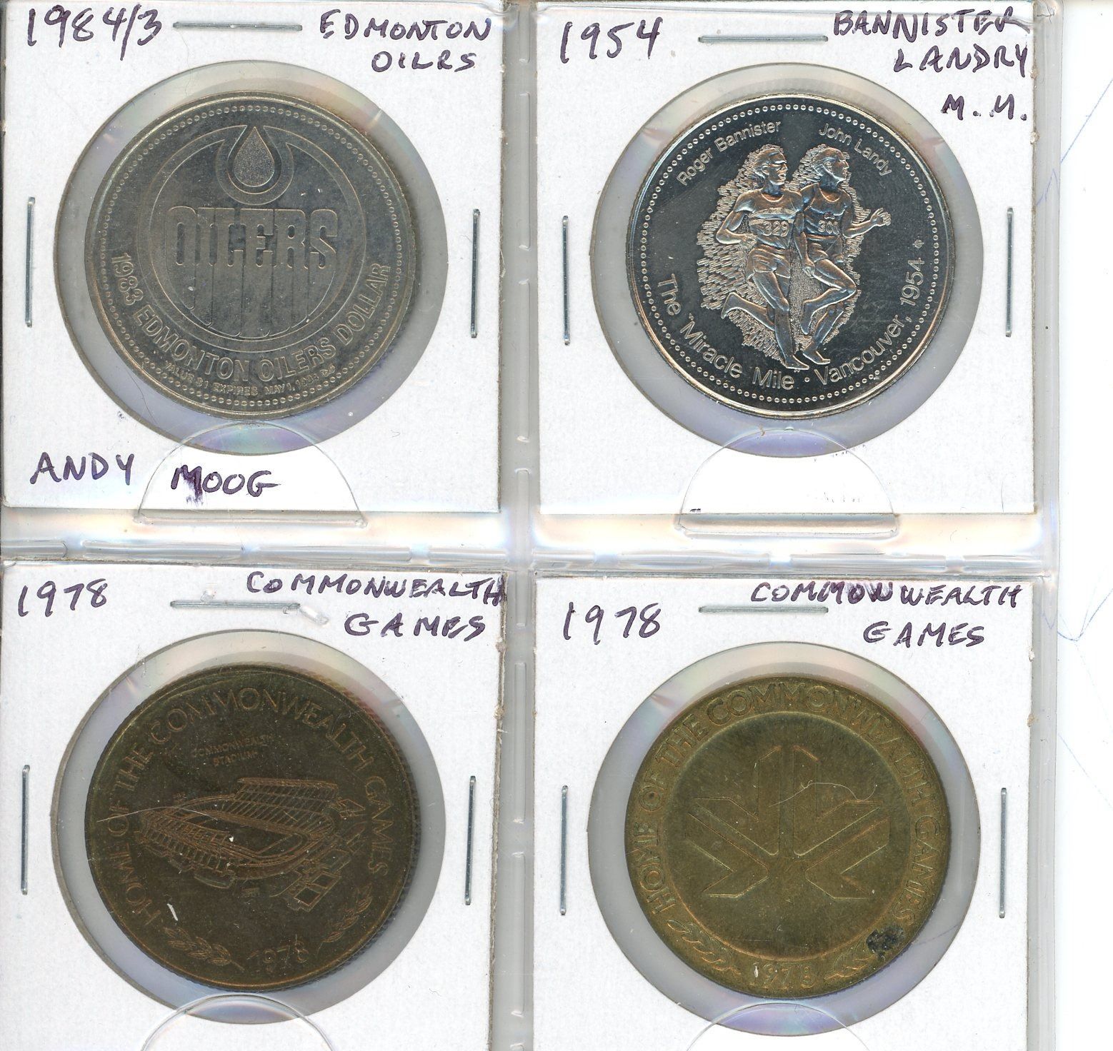Set of 4 Sports medals and trade dollars from Edmonton including Edmonton Oilers, Bannister/Landry Miracle Mile, and Commonwealth Games.
