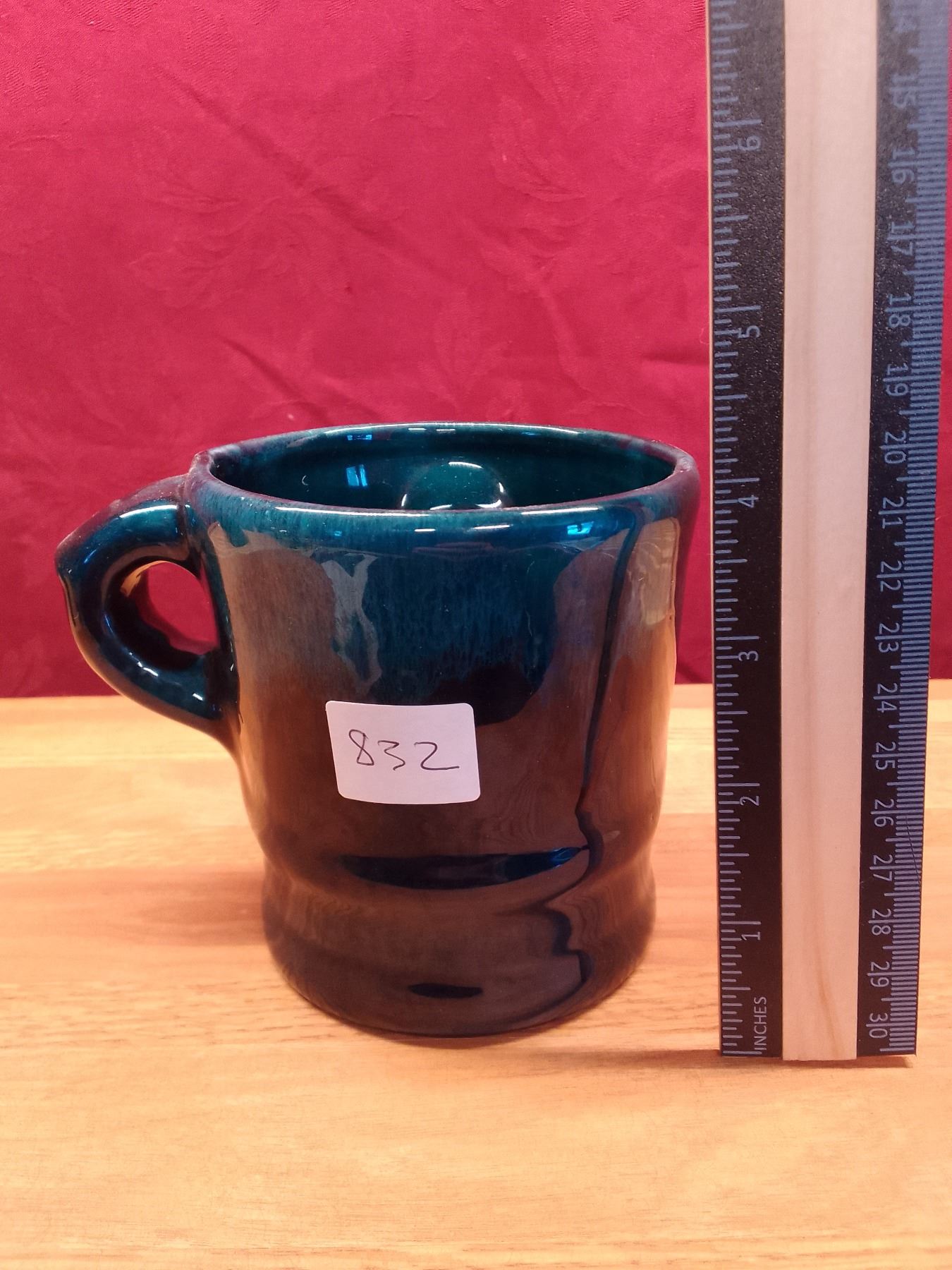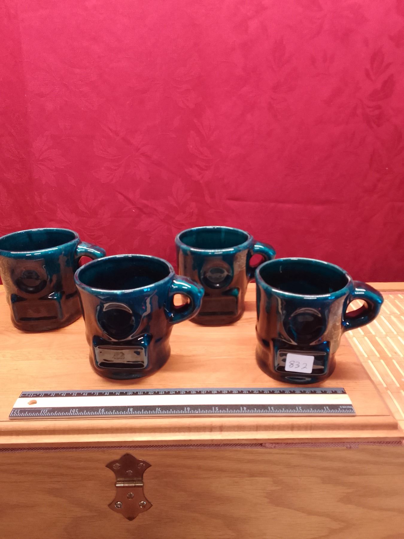 Set of 4 Vintage Dark Blue Ceramic Mugs - Four matching vintage dark blue glazed ceramic mugs with embossed face designs and loop handles. Classic retro style, perfect for coffee lovers, collectors, or rustic kitchen decor. Good vintage condition.
