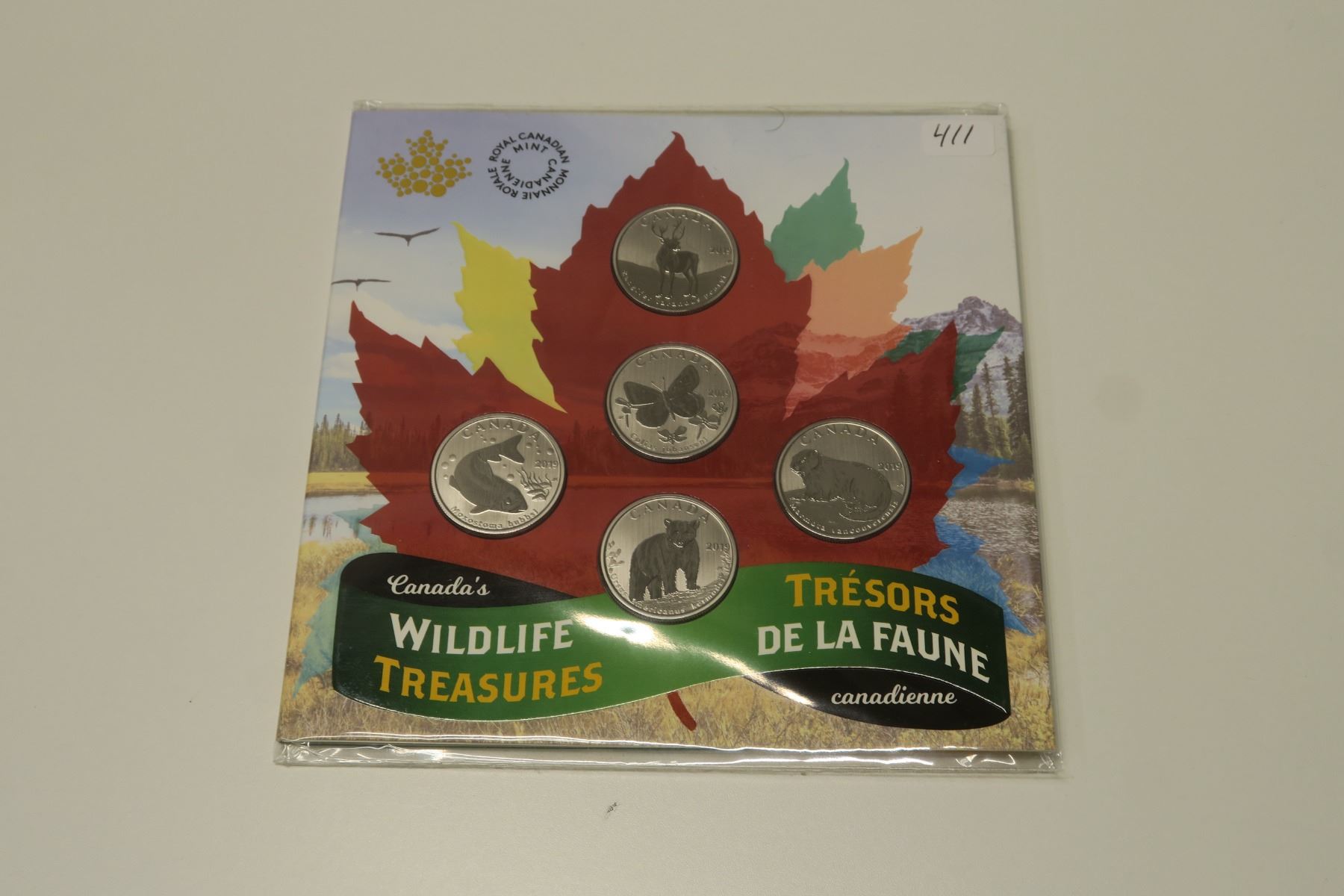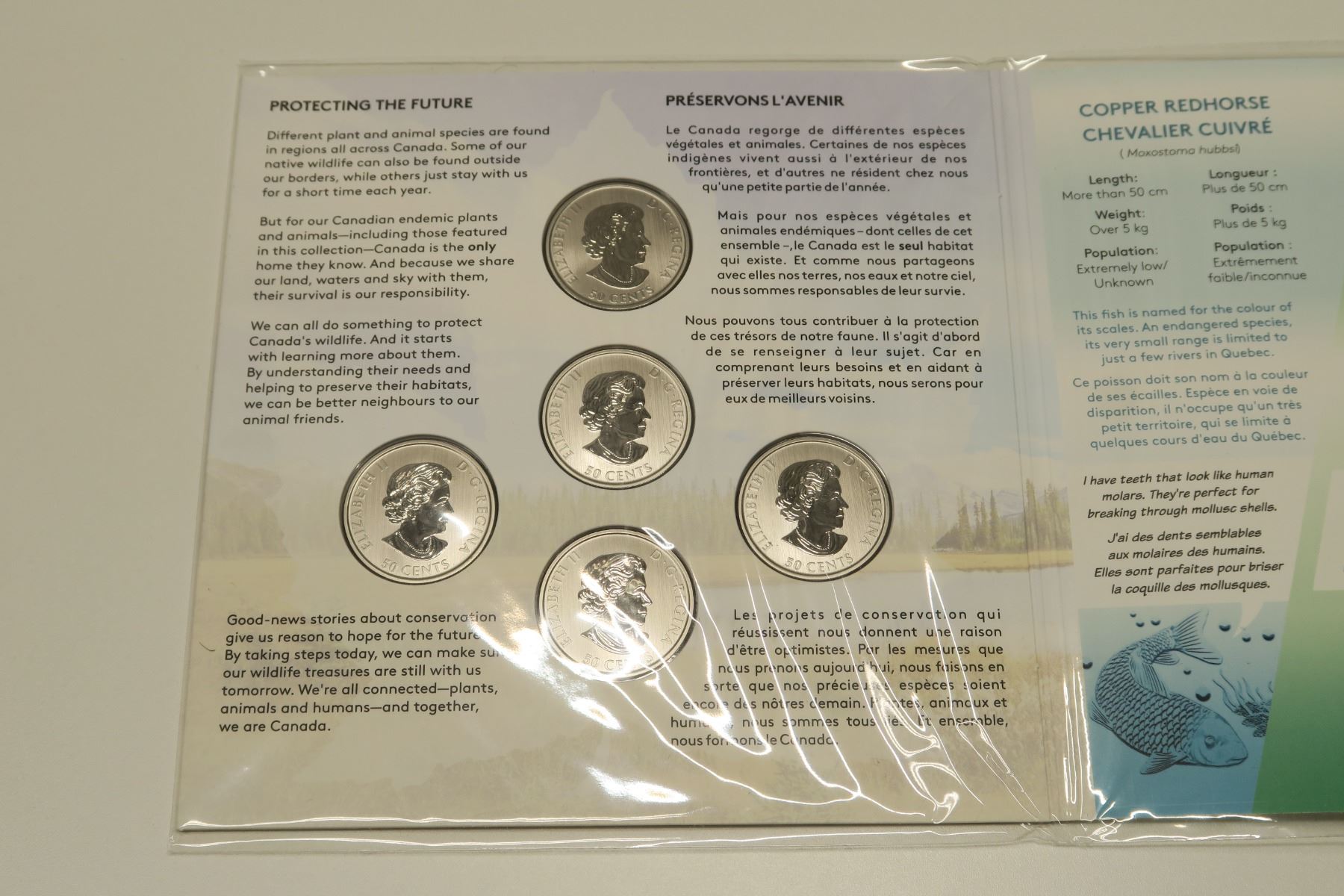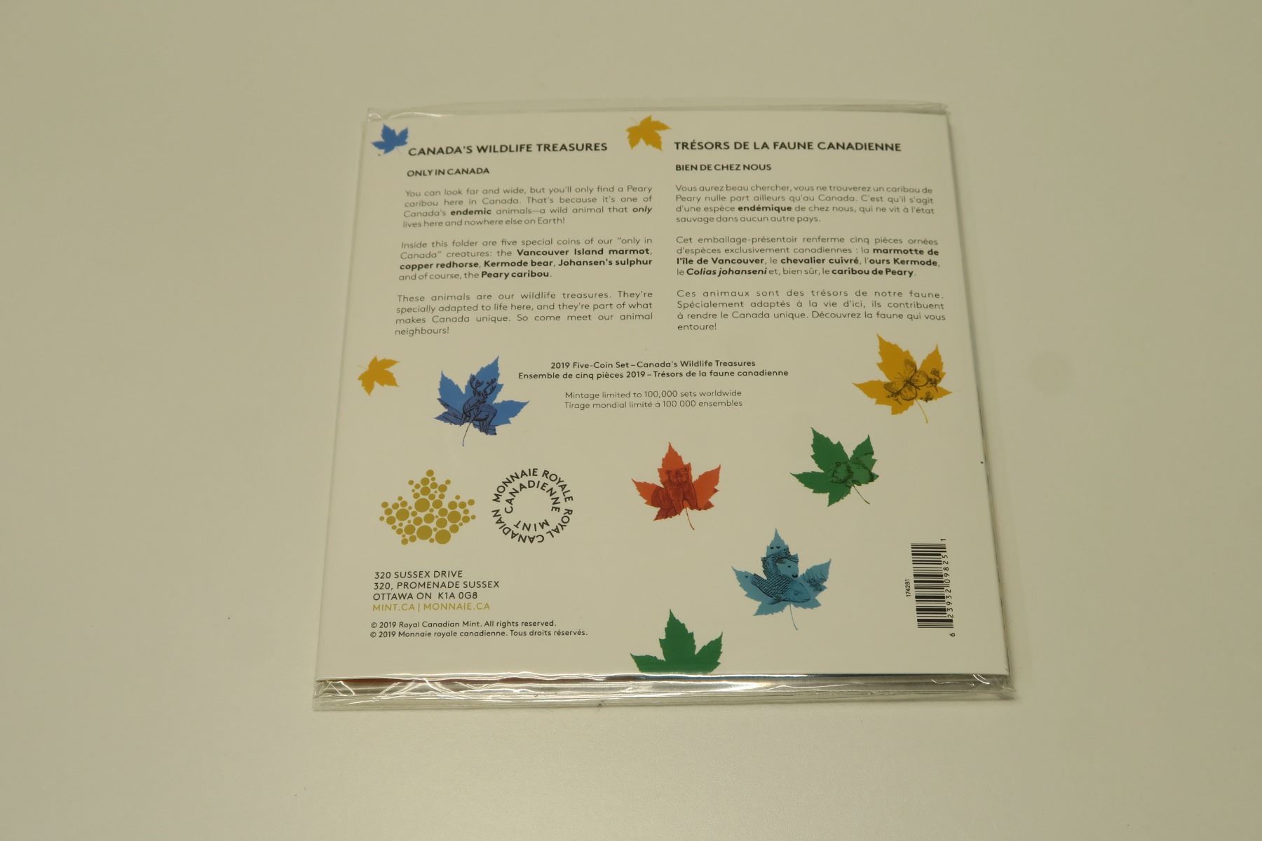 Set of 5 2019 Canada’s Wildlife Treasures 50 Cents. Includes Peary Caribou, Johansen’s Sulphur Butterfly, Copper Redhorse, Kermode Bear & Vancouver Island Marmot. Specimen. In original unopened RCM folder.