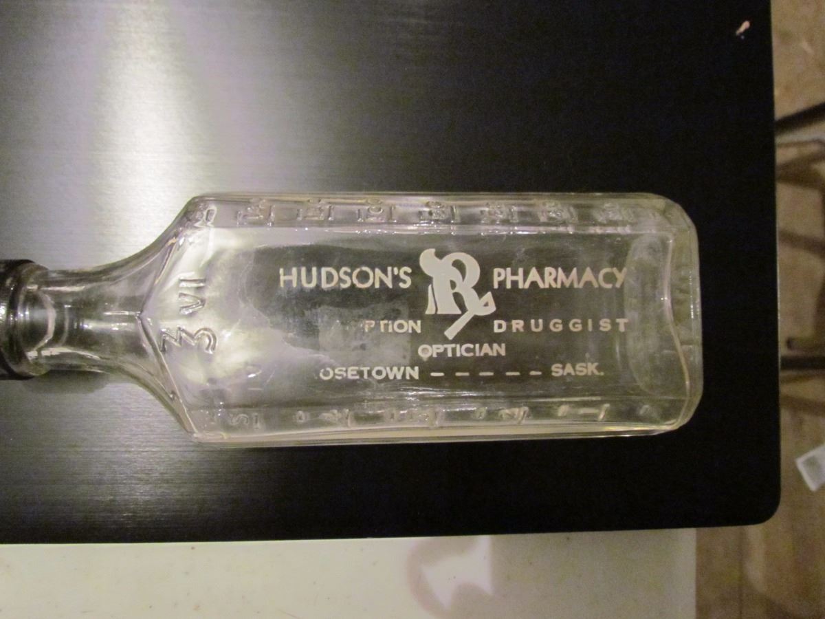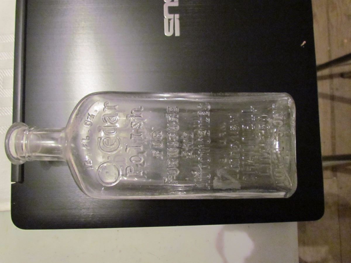 1. O'Cedar polish for furniture and automobiles. MFD by Channell Limited. Toronto, On Canada 12 FL OZ 2. Caley Branded 3. Blue Glass unknown brand 4. Hudsons Pharmacy. Rosetown, SK. 150cc 5. Dr. S.N. Thomas No. 5520 Eclectric Oil. Northrop & Lyman Co. Ltd. Toronto, ON Canada 2 FL OZ