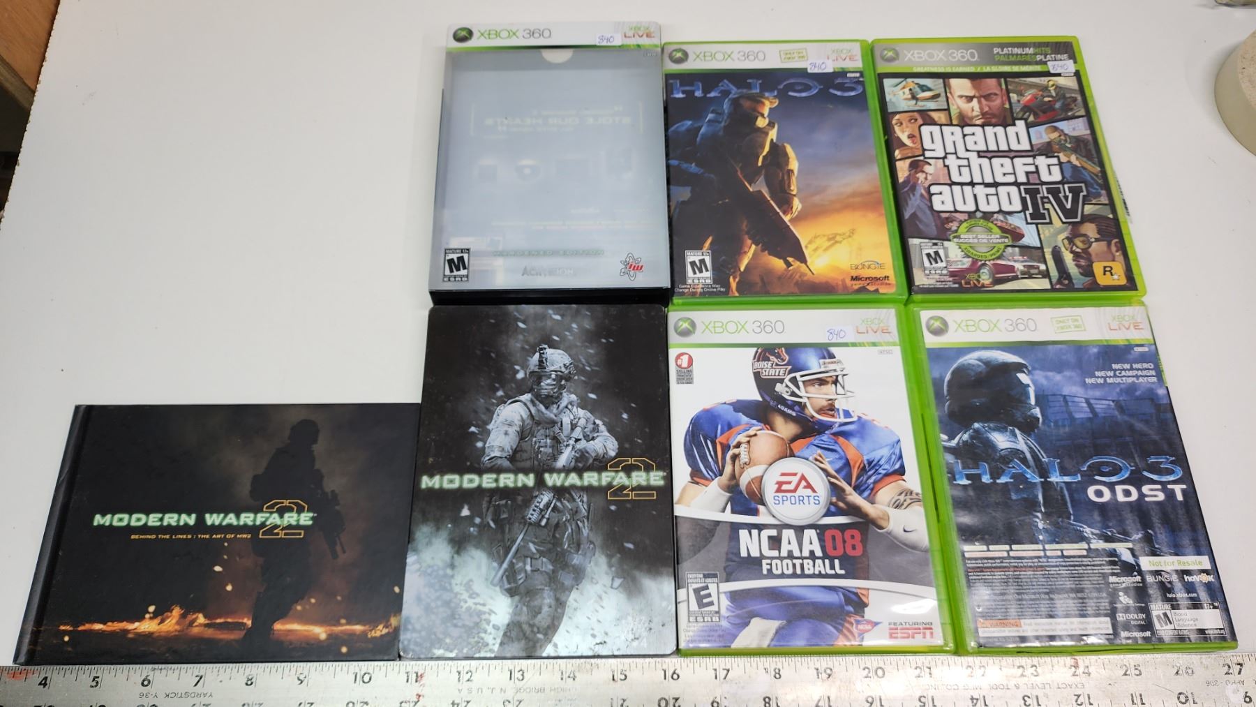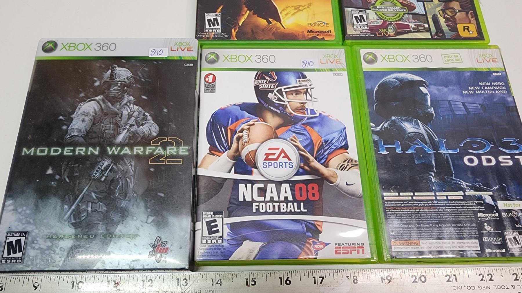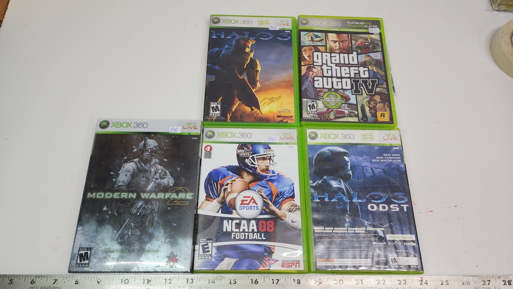 Set of 5, Xbox 360 games - Modern warfare 2: Hardened Edition in steel case, Halo 3, Halo 3 ODST, GTA 4 & NCAA 08 football - game discs are scratched