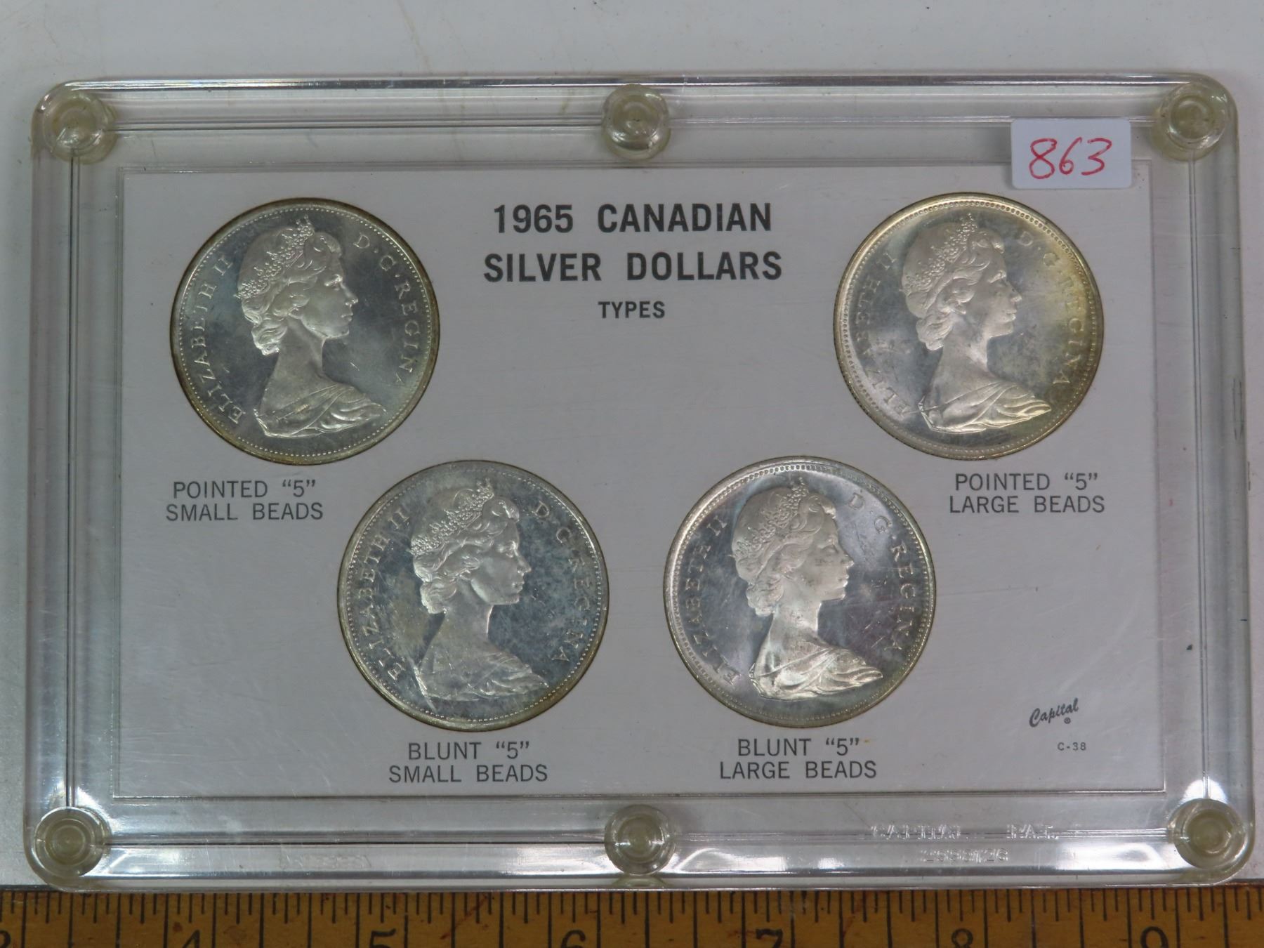 Set of 6 1965 Canadian Silver Dollar Varieties. Includes Pointed 5 Small Beads, Blunt 5 Small Beads, Pointed 5 Large Beads & Blunt 5 Large Beads. Some coins have Cameos. Housed in a Capital Plastics holder.