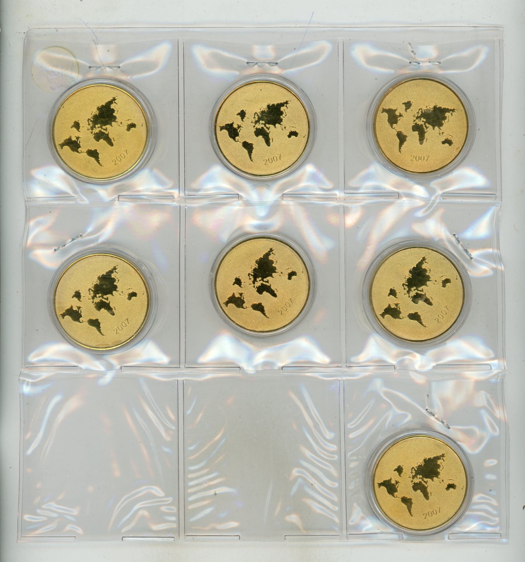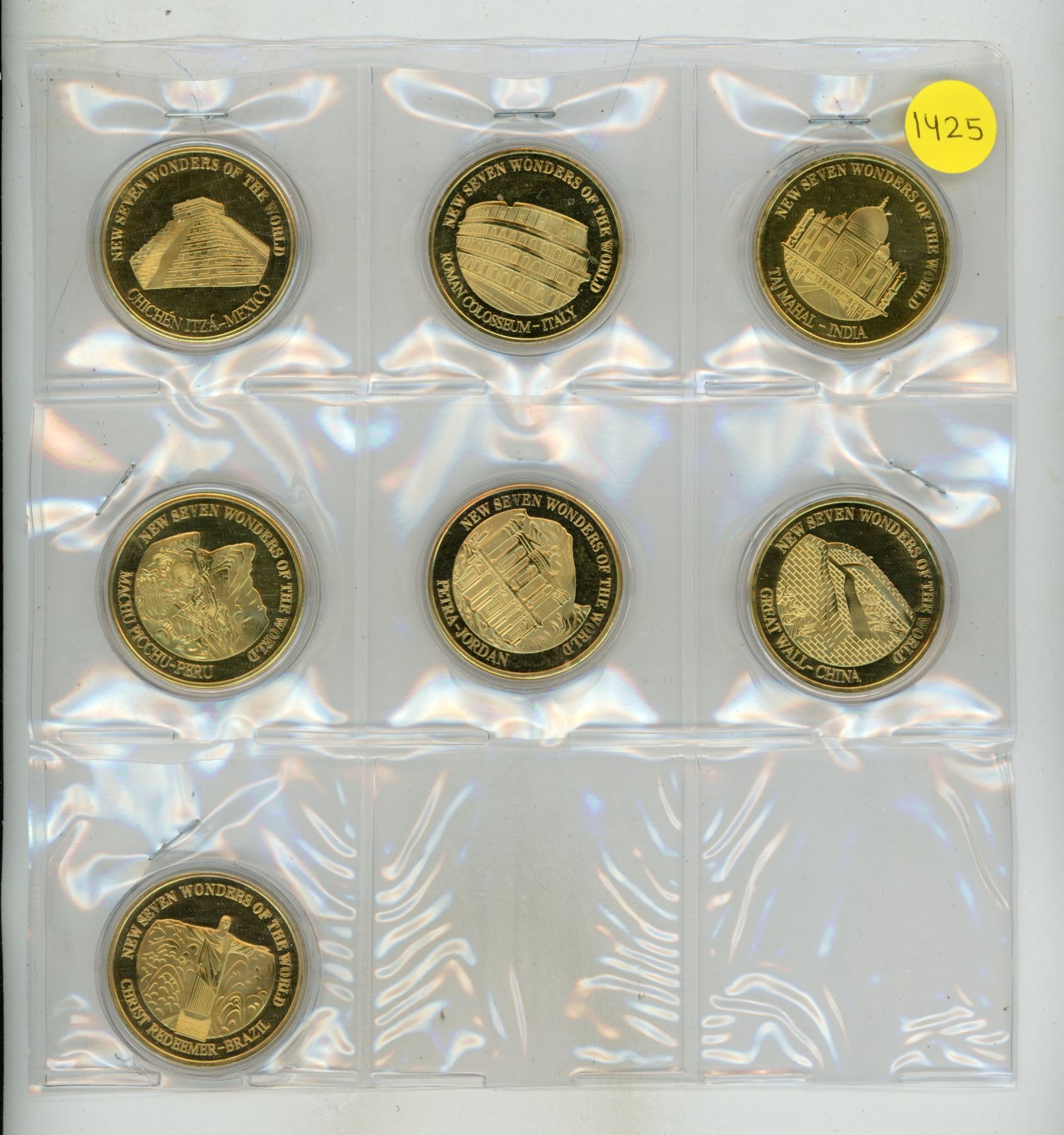Set of 7 Wonders of the World medals. Kukulcan Pyramid, Roman Colosseum, Taj Mahal, Machu Pichu, Pet