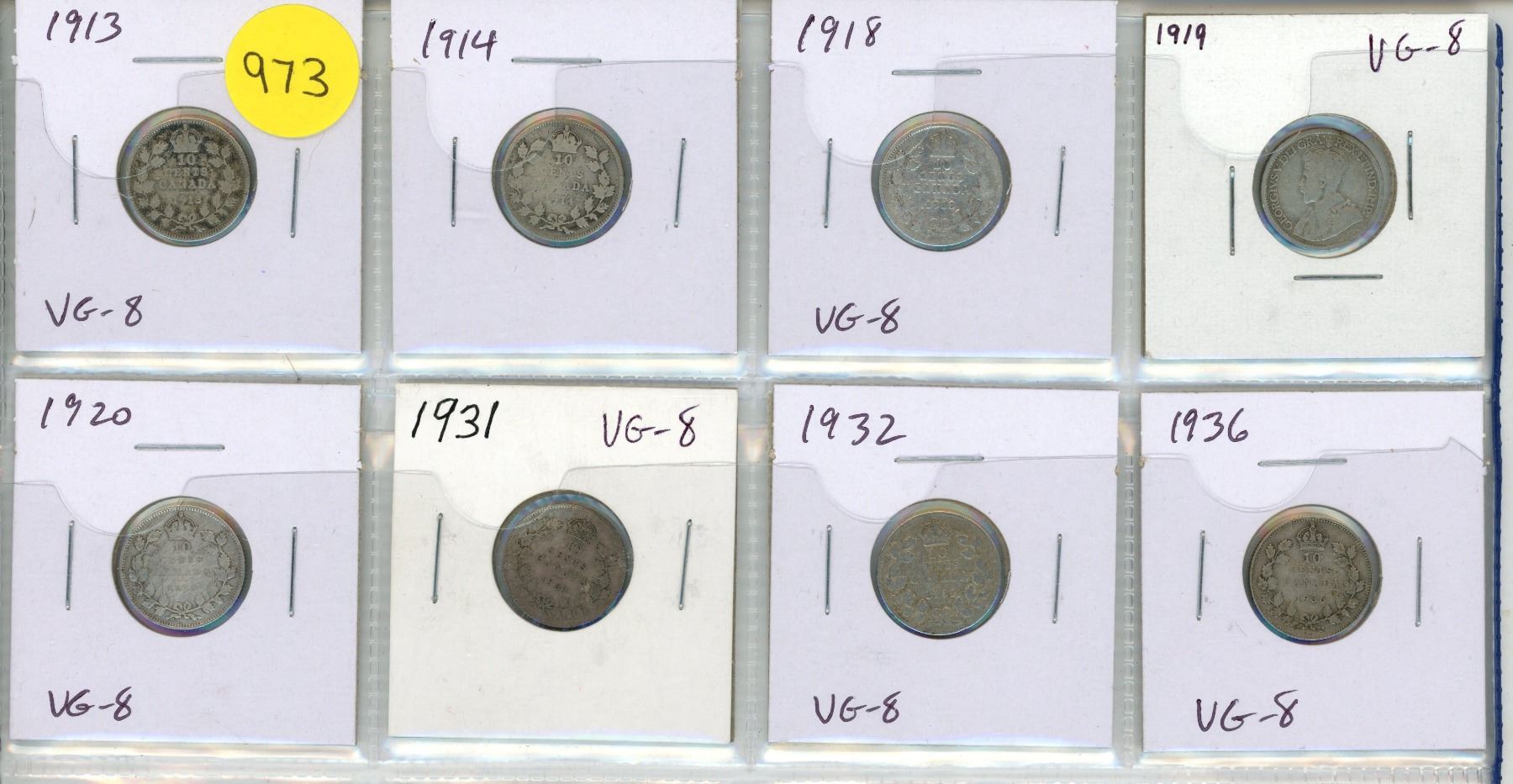 Set of 8 Canadian King George V 80% Silver 10 Cents. Includes 1913, 1914, 1918, 1919, 1920, 1931, 1932 & 1936. VG.