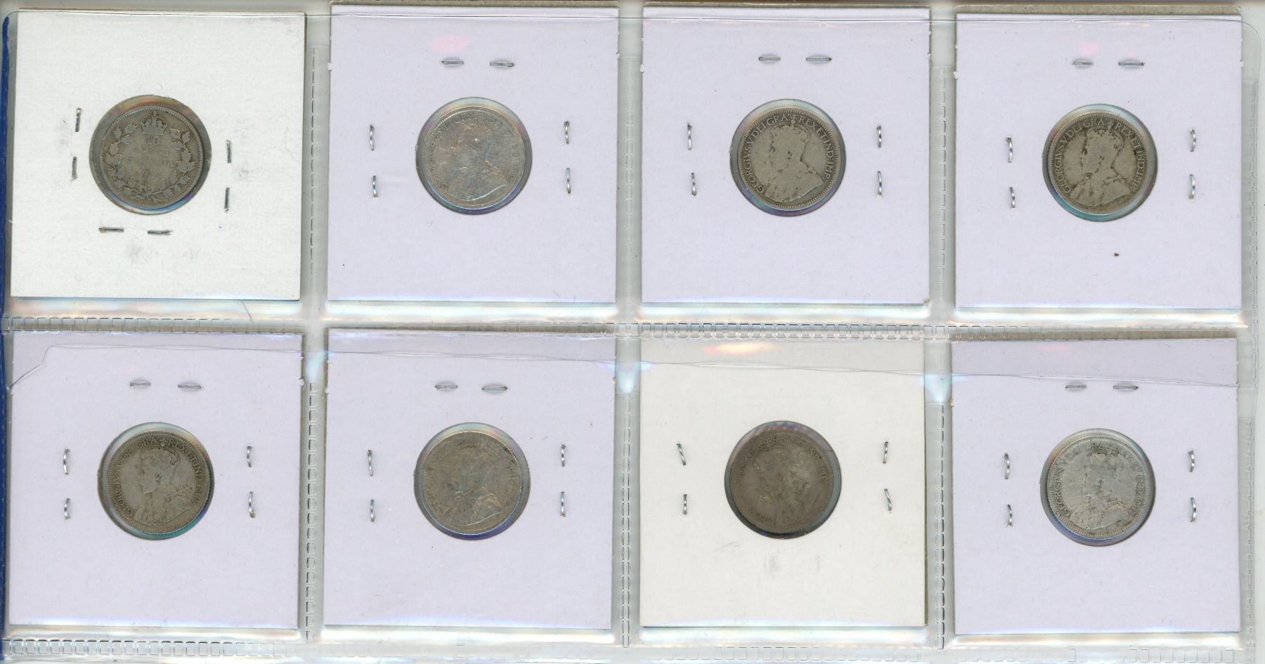 Set of 8 Canadian King George V 80% Silver 10 Cents. Includes 1913, 1914, 1918, 1919, 1920, 1931, 19