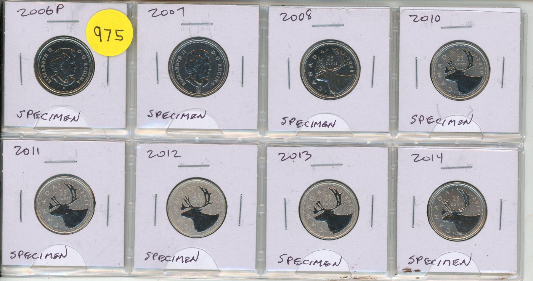 Set of 8 Canadian Specimen 25 Cents. Includes 2006P, 2007, 2008, 2010, 2011, 2012, 2013 & 2014. All
