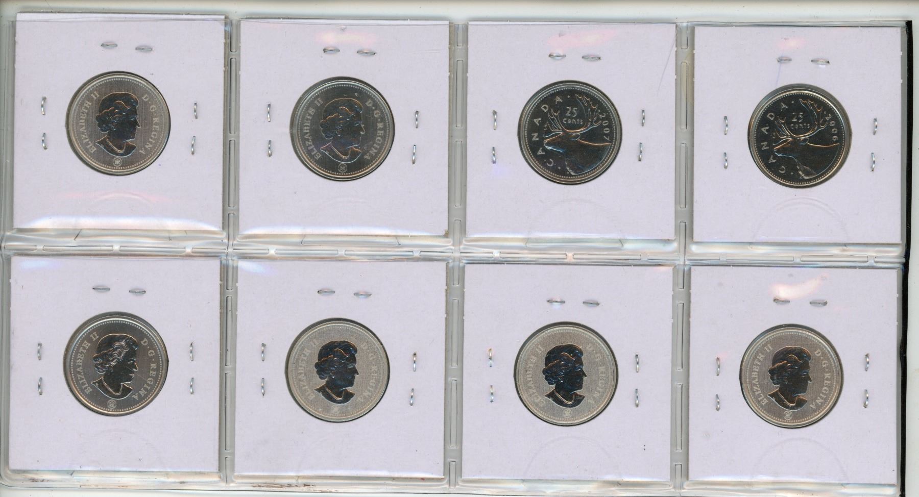 Set of 8 Canadian Specimen 25 Cents. Includes 2006P, 2007, 2008, 2010, 2011, 2012, 2013 & 2014. All from Specimen sets.
