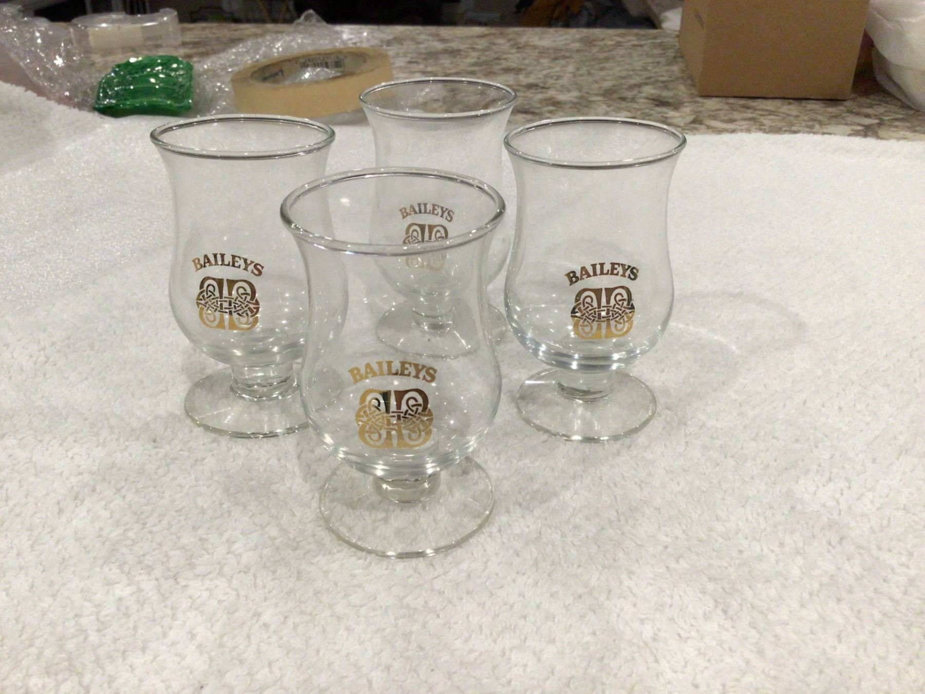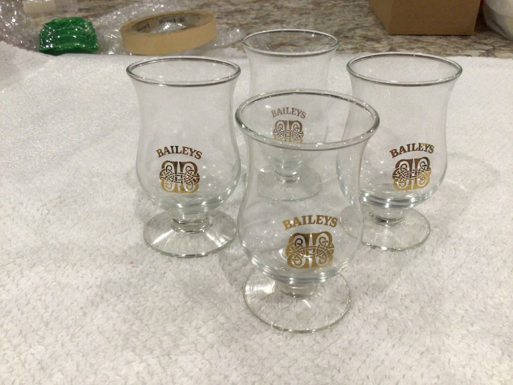 Set of four Bailey's Irish Cream tulip shaped snifter glasses. Gold Celtic Knot.
