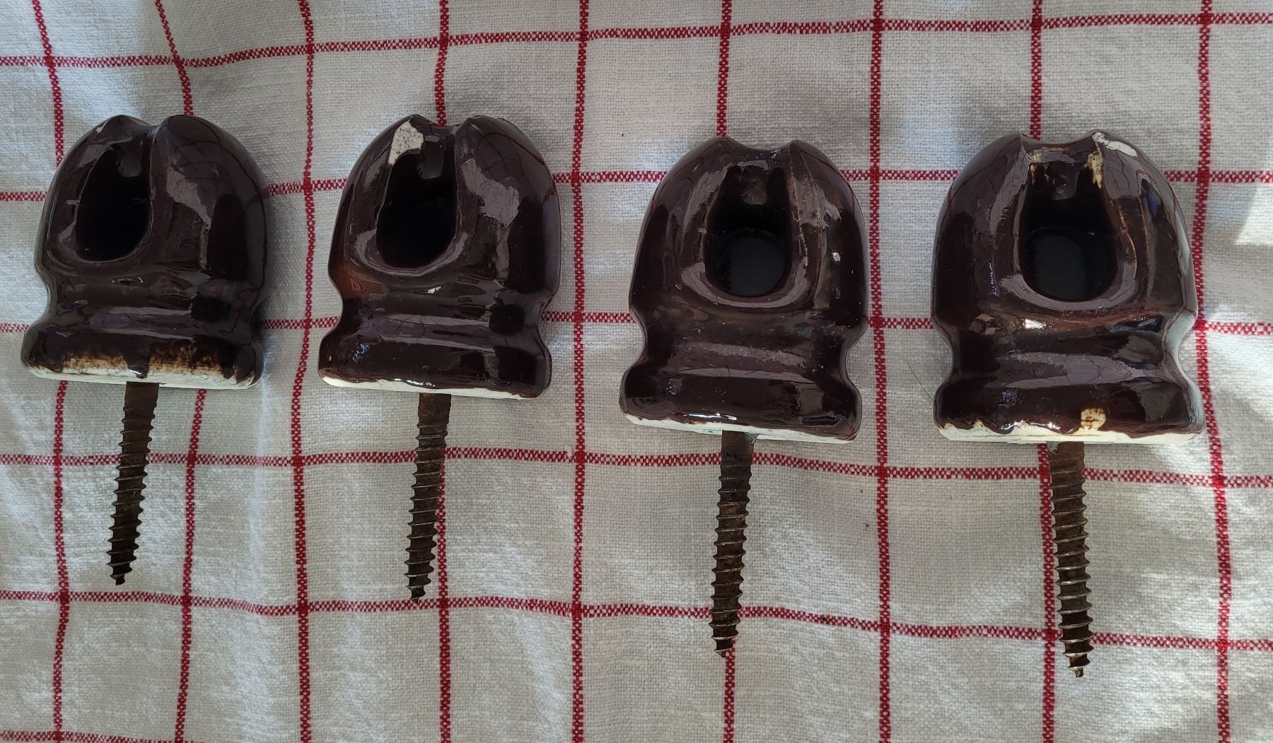Set of four vintage brown ceramic insulators with lag screw - 3" tall