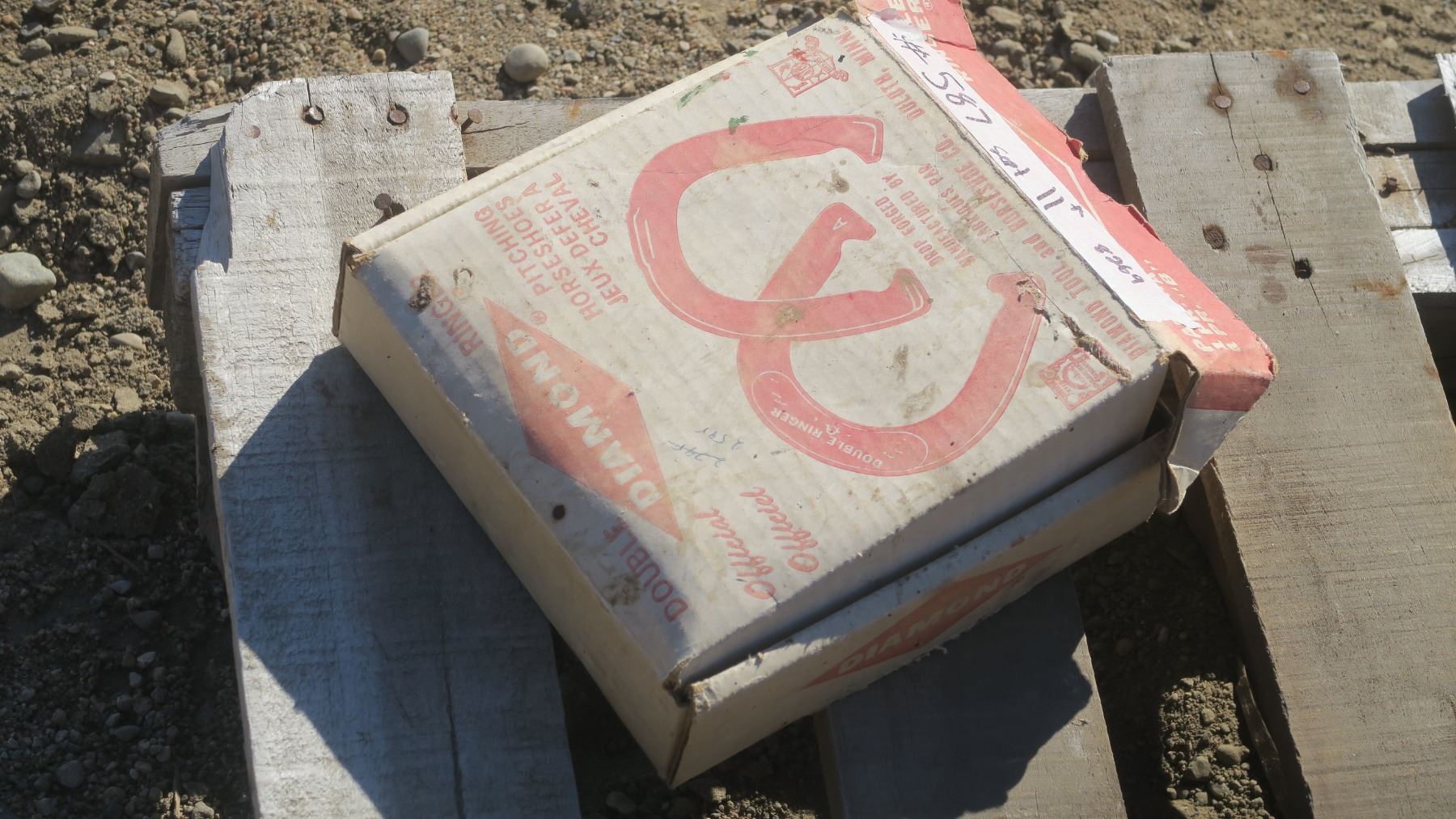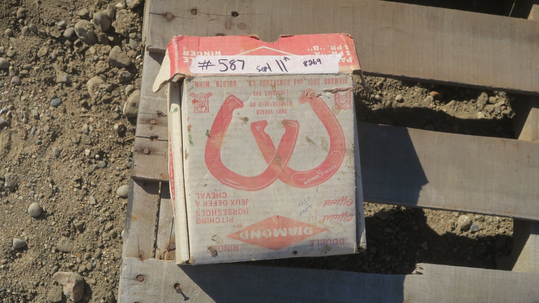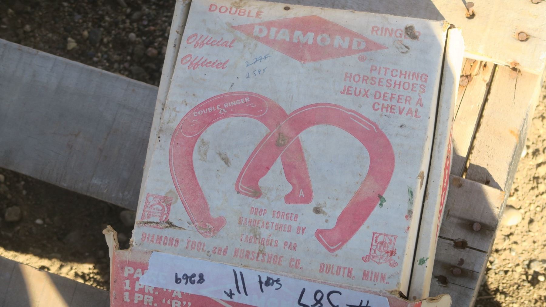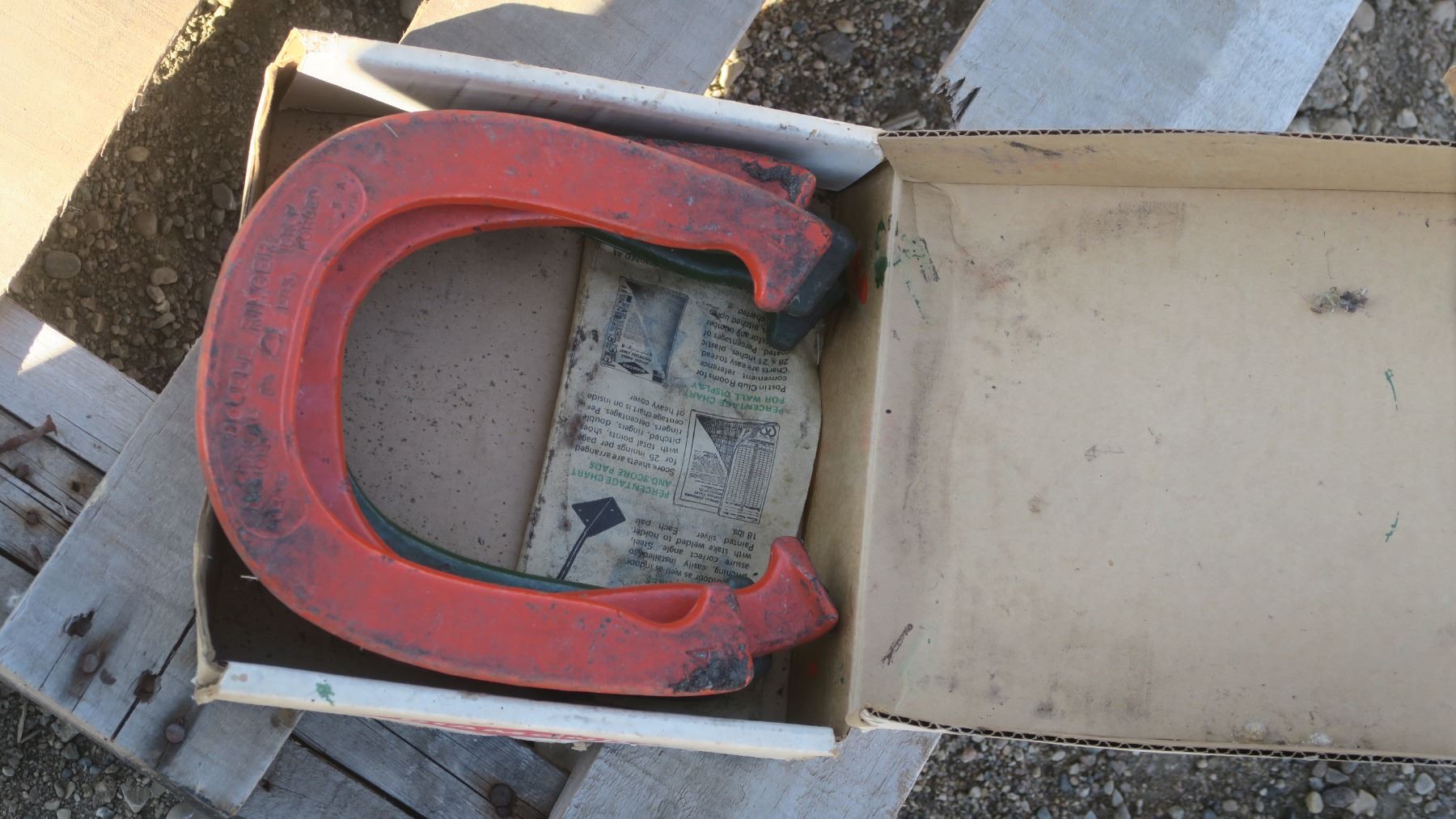 Set of pitching horse shoes in box