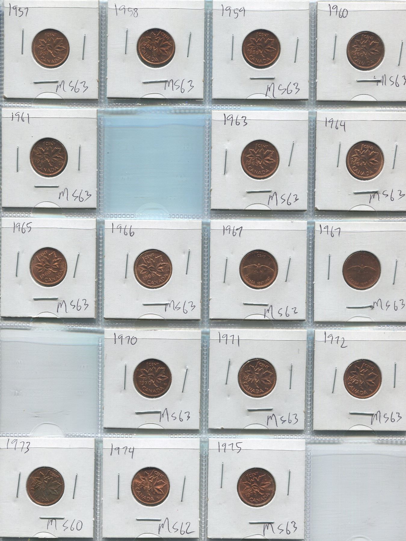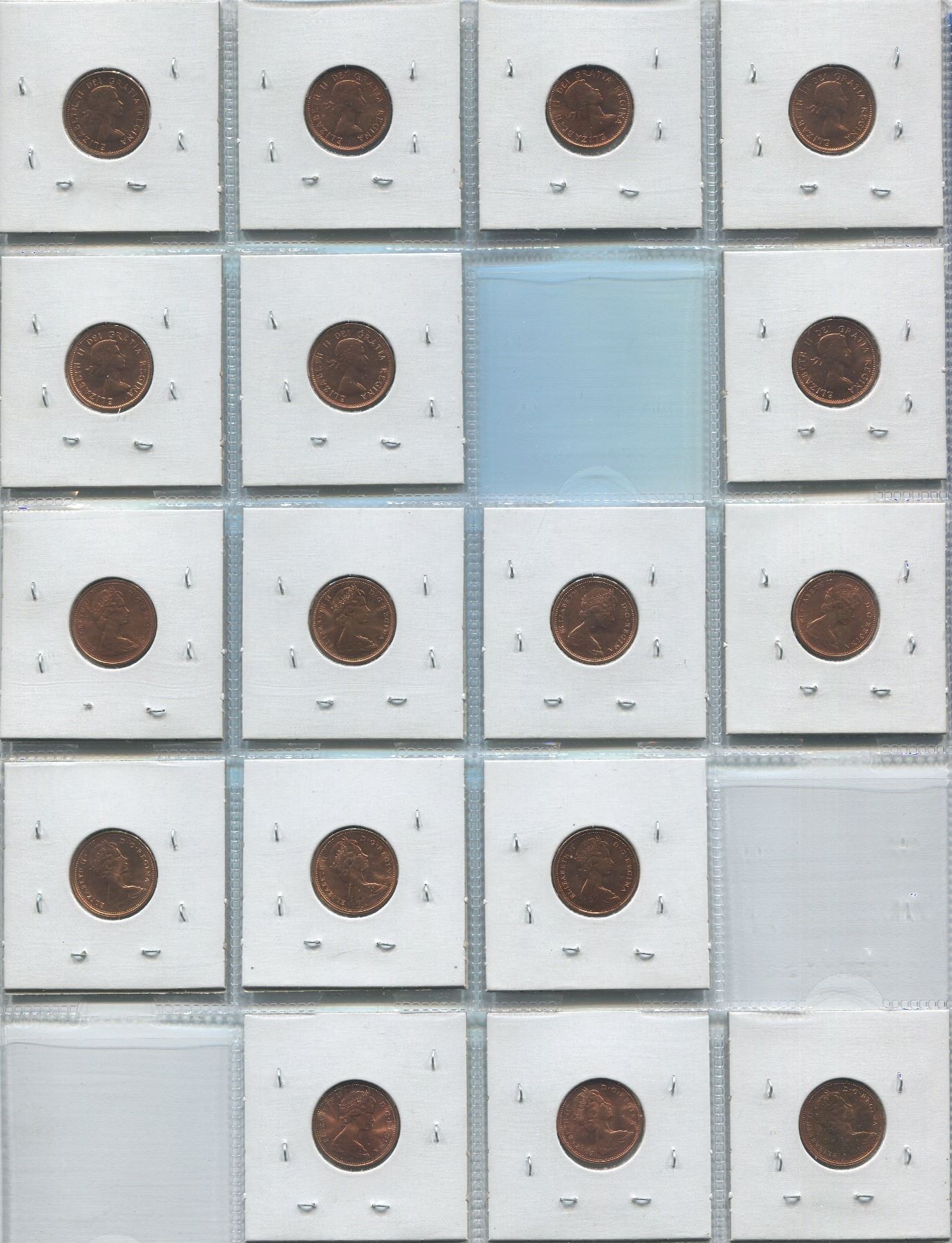 Sheet Of Canadian One Cent Coins 1957-1975 (17)