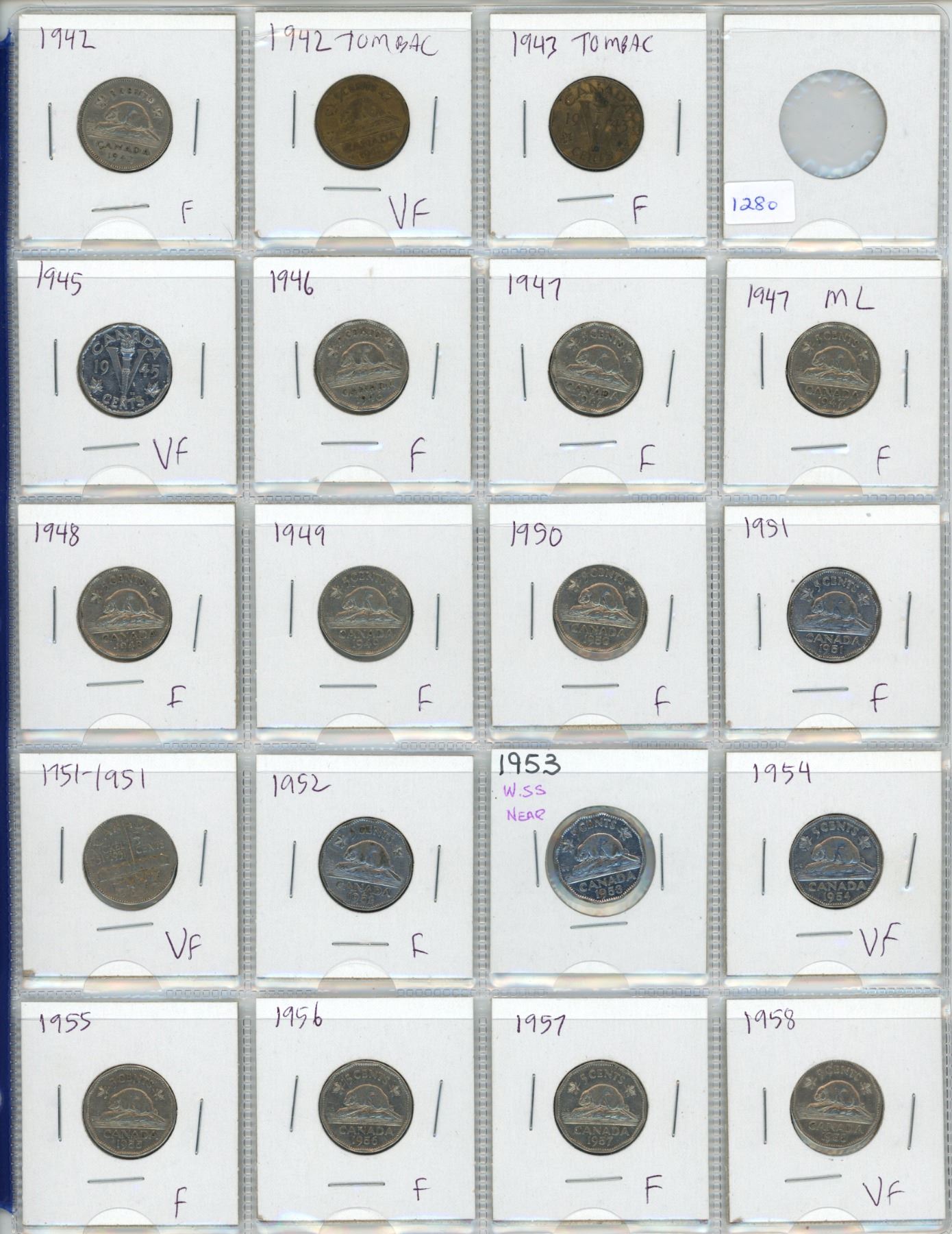 Sheet of 19 Canadian Nickels - 1942-1958 - missing 1944