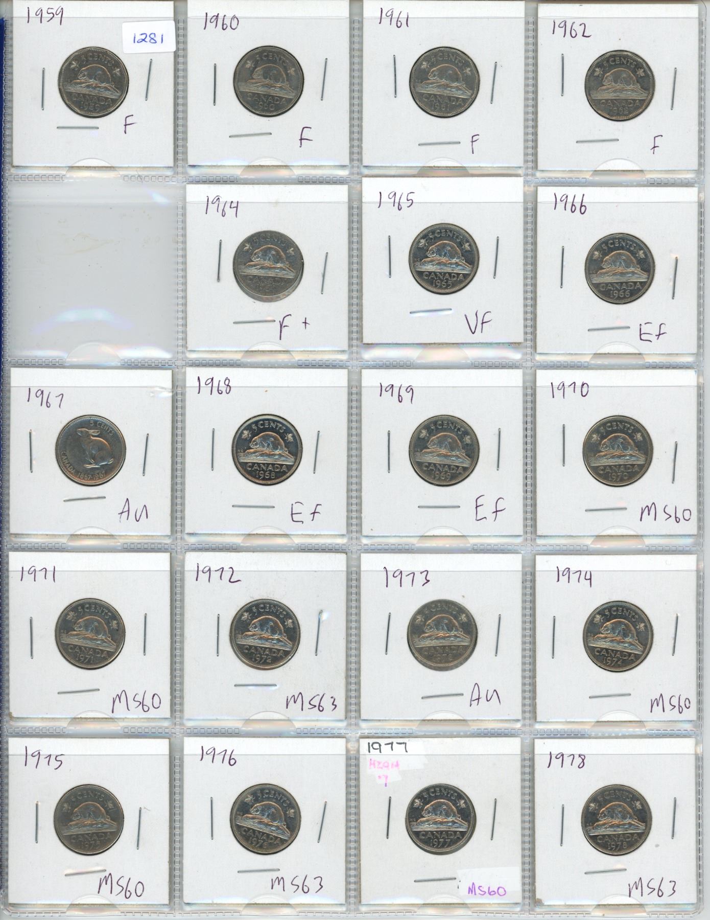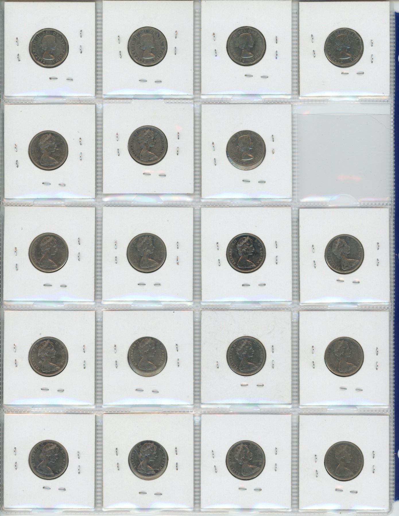 Sheet of 19 Canadian Nickels - 1959-1978 - missing 1963