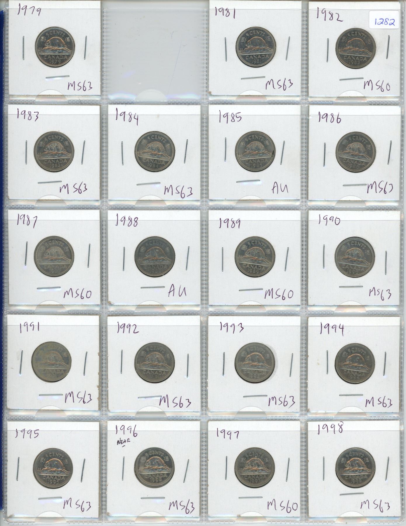 Sheet of 19 Canadian Nickels - 1979-1998 - missing 1980