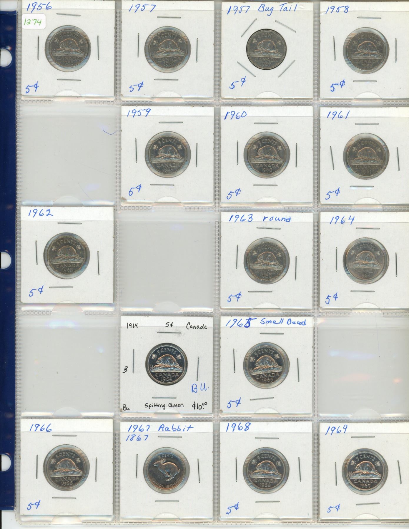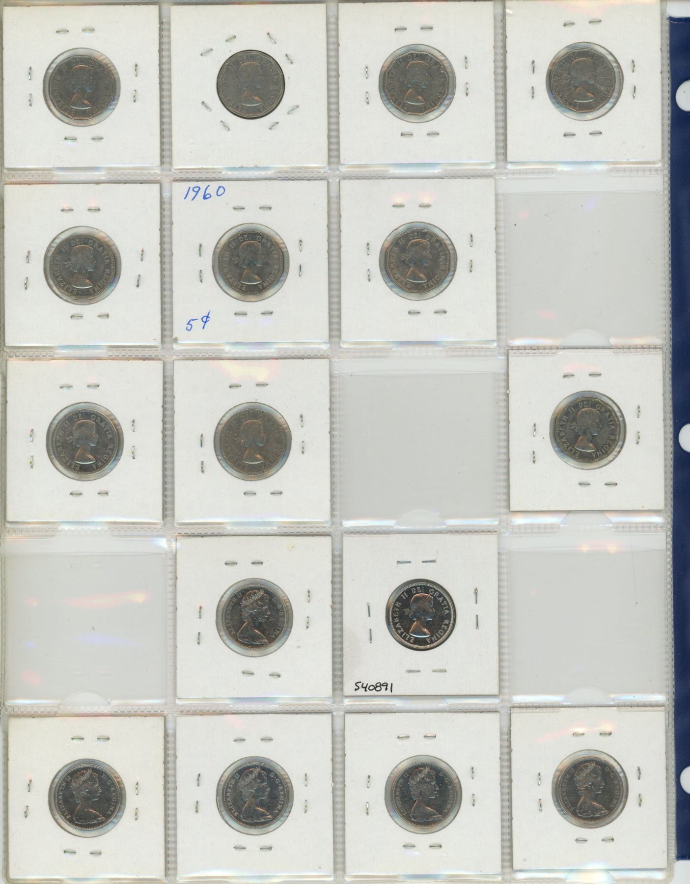 Sheet of Canadian 5 Cent Coins; 1956-69