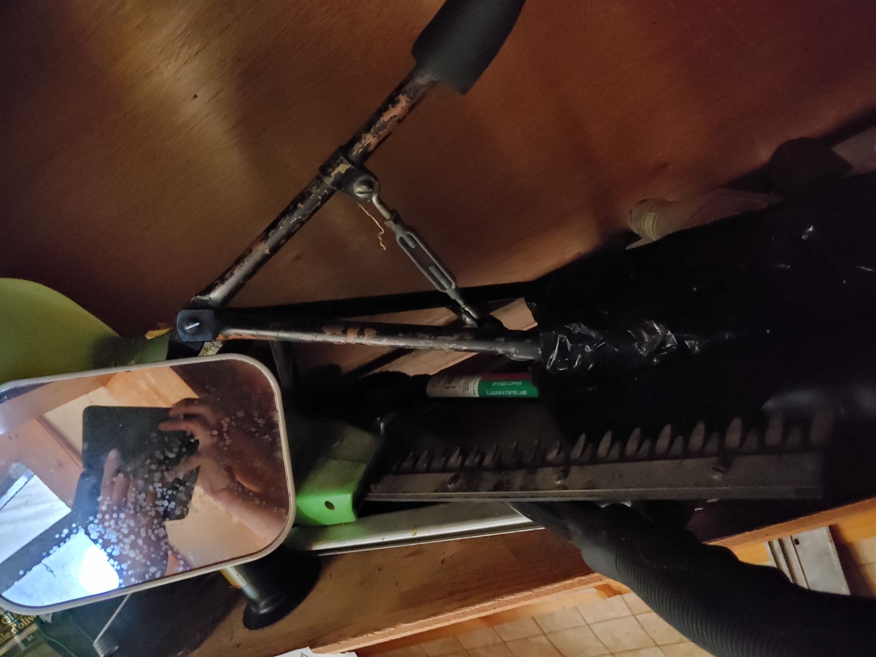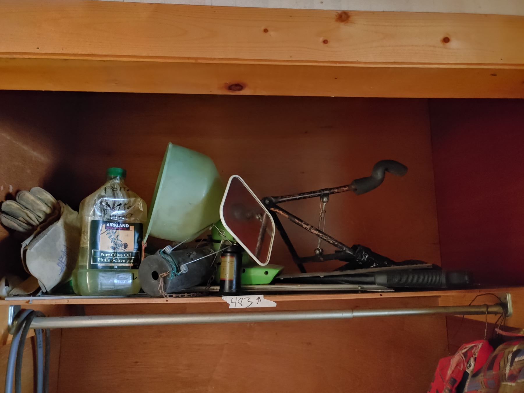 Shelf Contents Including Welding Gloves, Mole Trap, and Hedge Trimmer