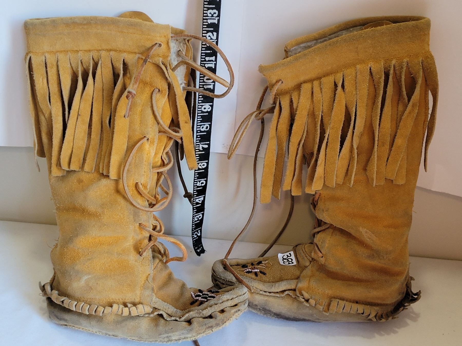 Sherpa fleece lined, leather moccasin boots. Needs bead repair & rubber soles.