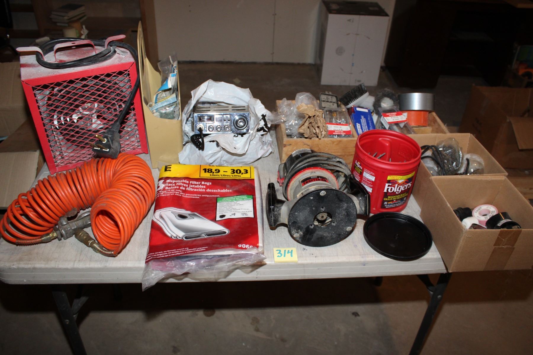 Shop heater, airline, CB radio, router and assorted fasteners.