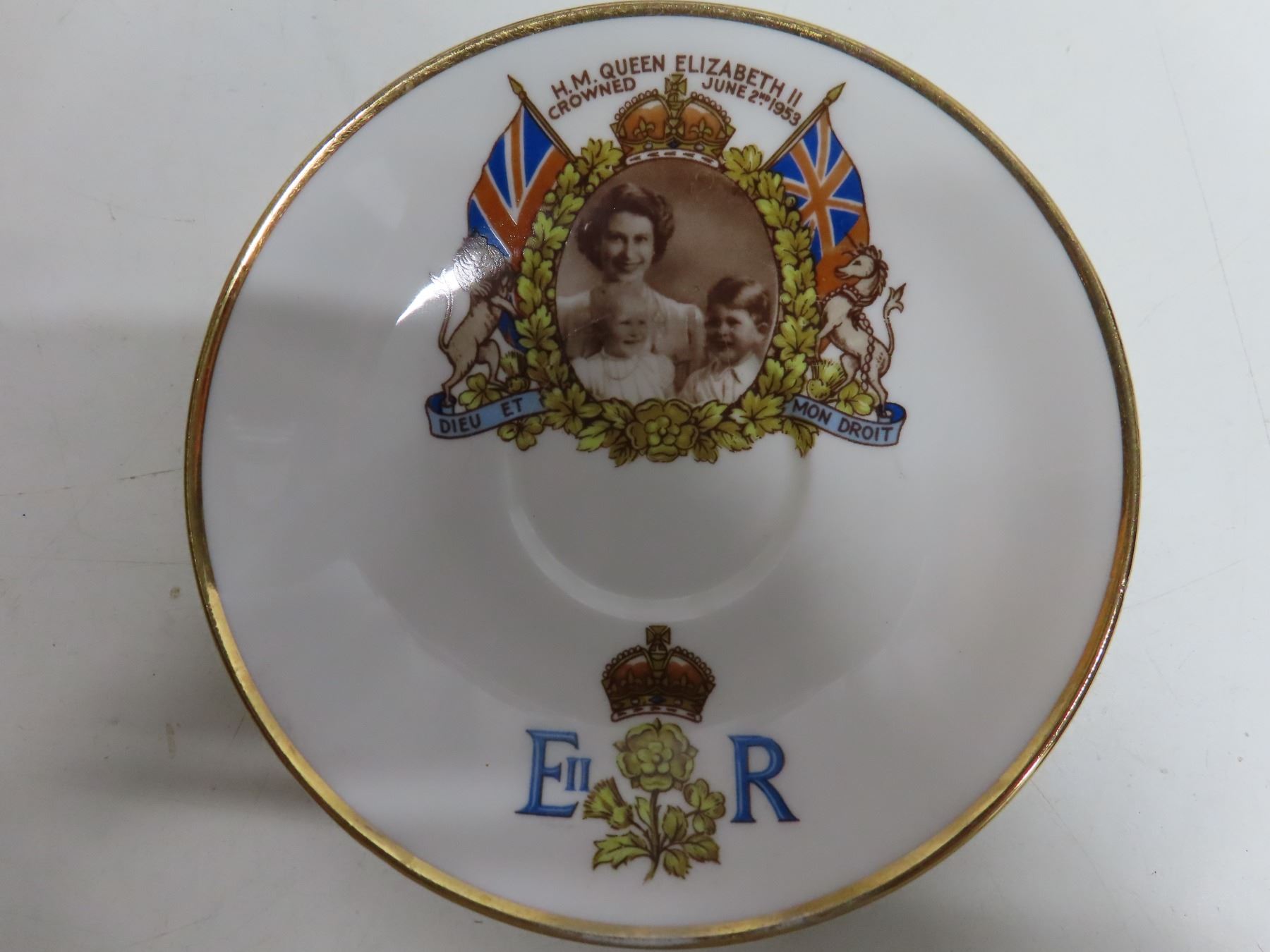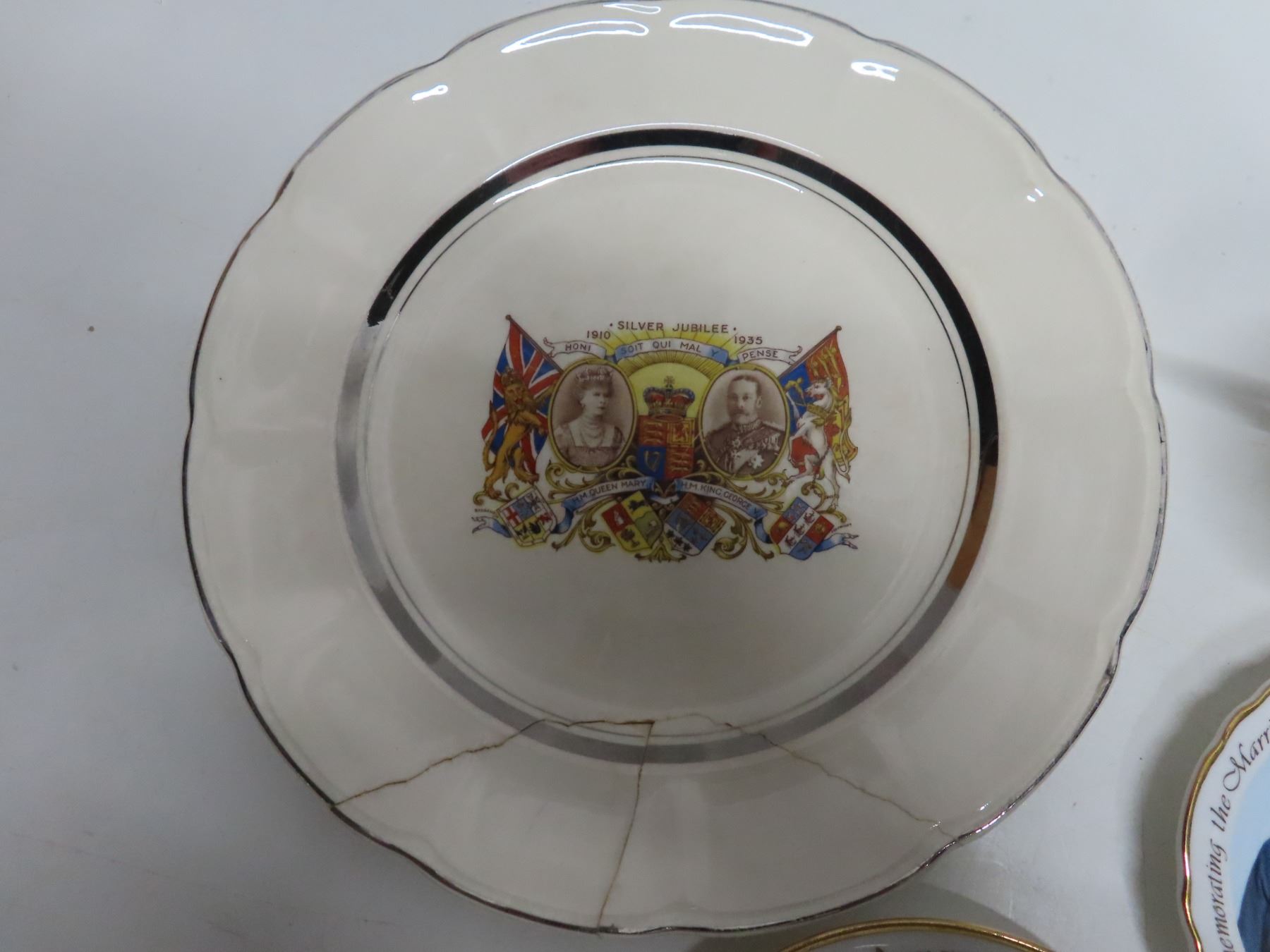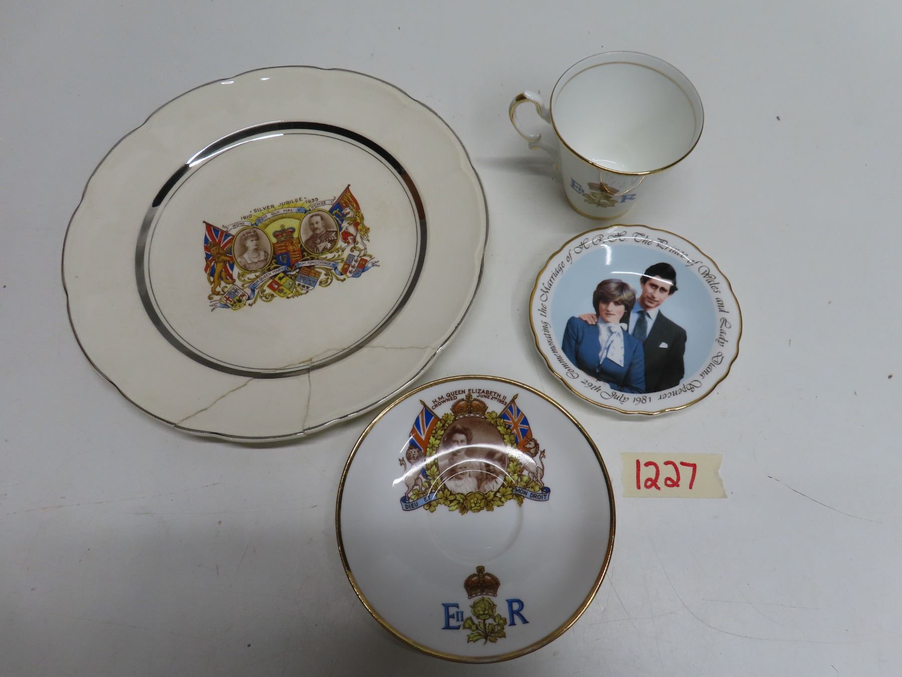 Silver Jubilee 1935 King George V/Queen Mary plate, broken, glued + Queen Elizabeth II Coronation 1953 matching cup/saucer + Prince Charles/Lady Diana 1981 wedding candy dish. Latter two excellent condition.