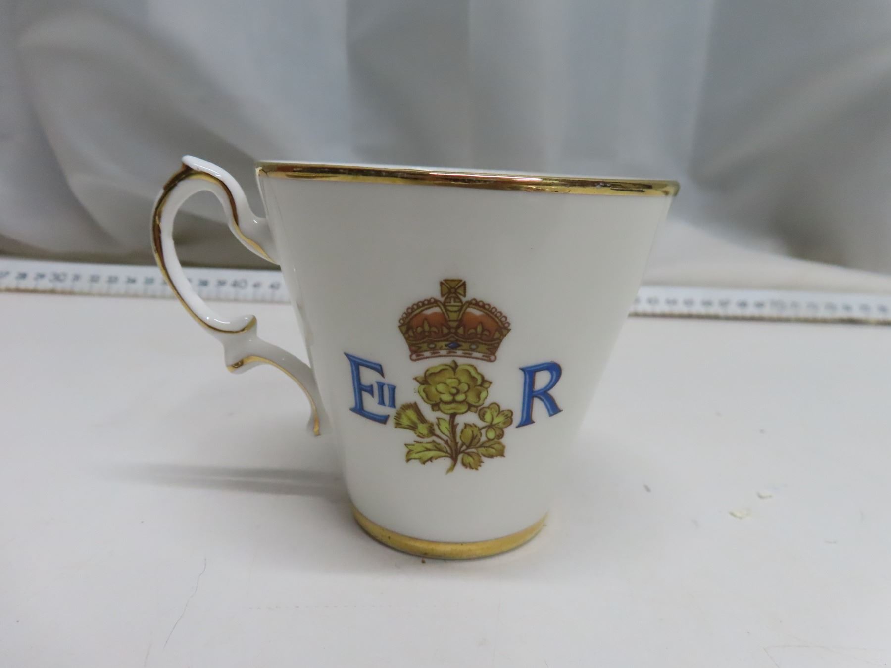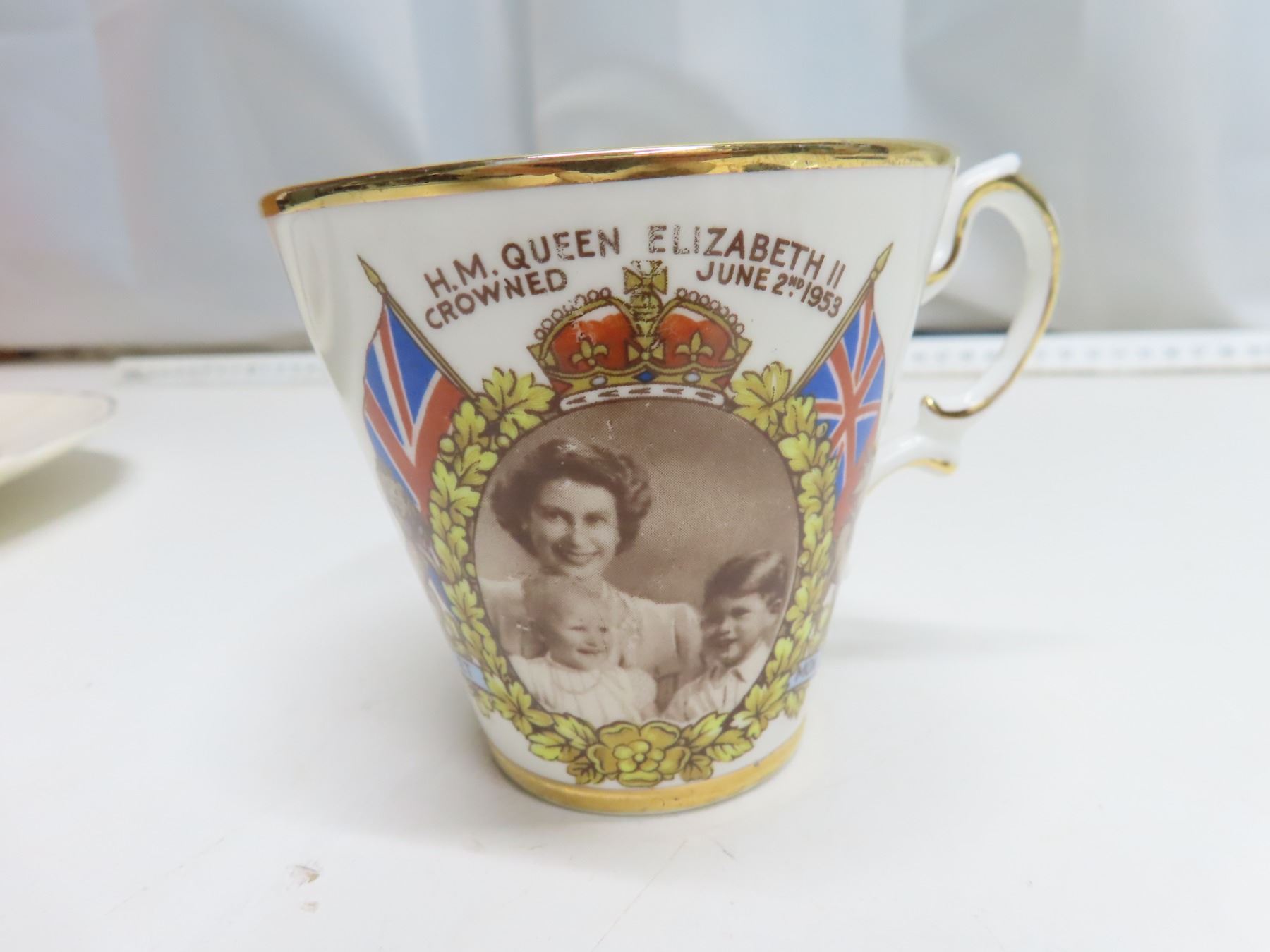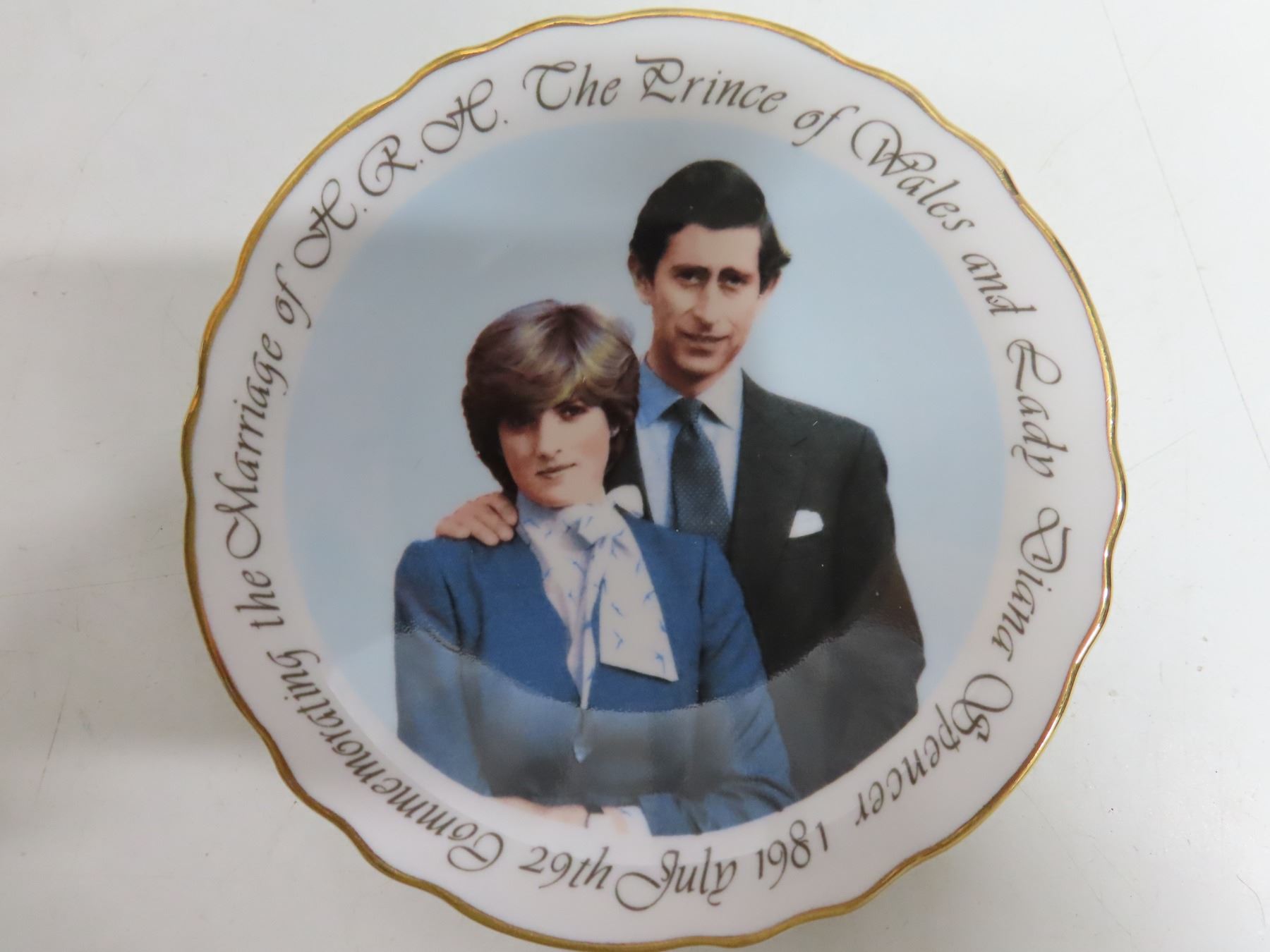 Silver Jubilee 1935 King George V/Queen Mary plate, broken, glued + Queen Elizabeth II Coronation 1953 matching cup/saucer + Prince Charles/Lady Diana 1981 wedding candy dish. Latter two excellent condition.