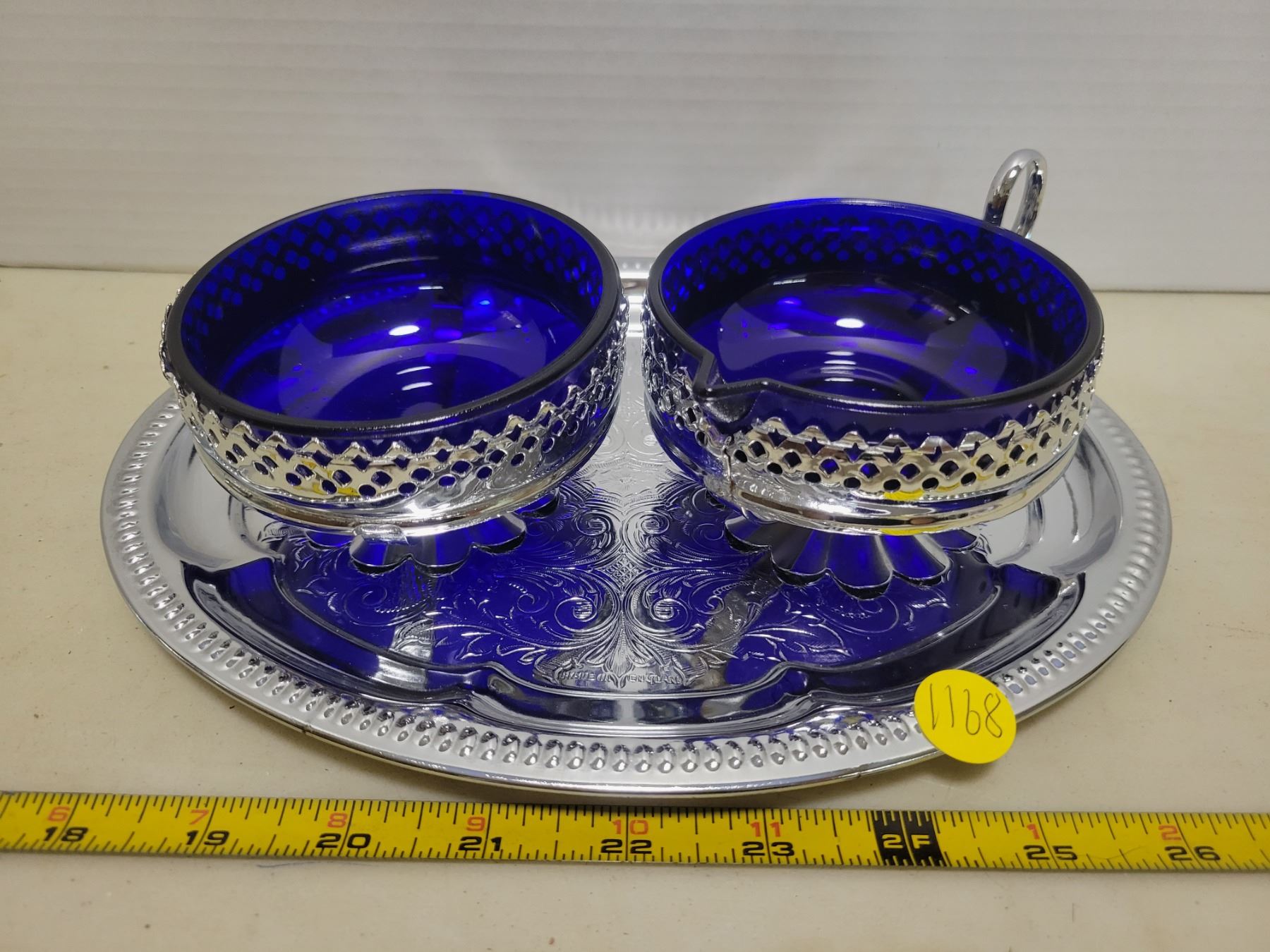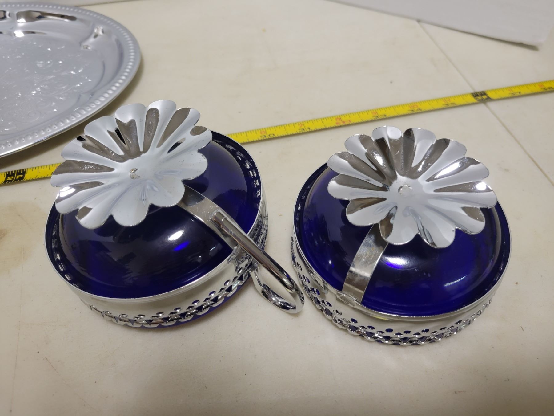 Silver & blue cream and sugar bowls on a tray