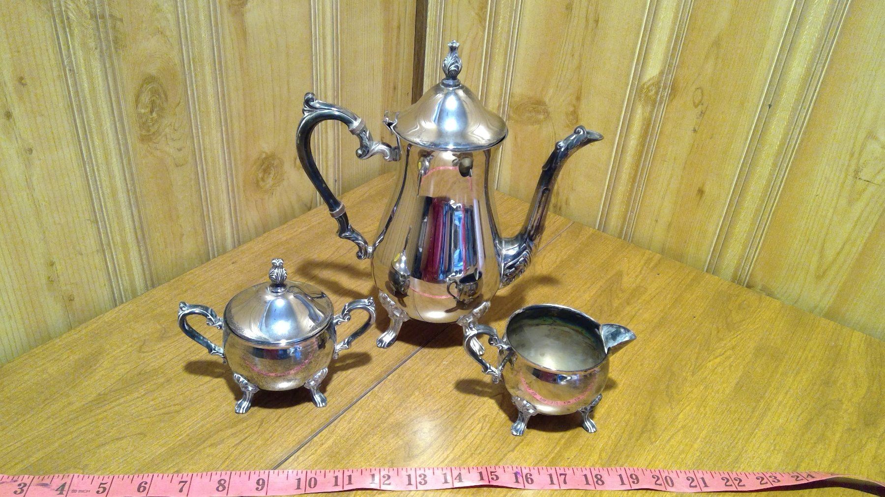 Silver plated tea set (tea pot, sugar, cream *missing lid*)