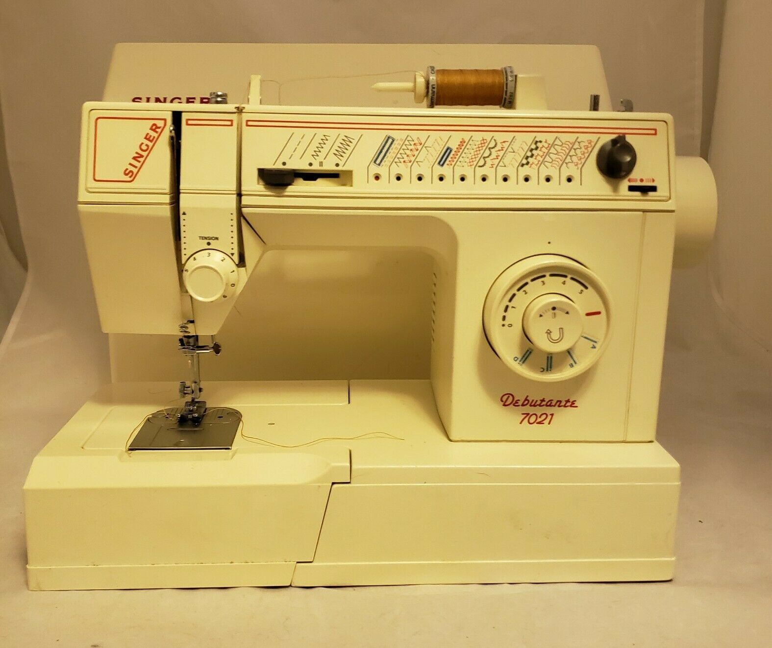 Singer Debutante Portable Sewing Machine Model 7021 With Peddle multi Stitch, excellent used condition includes extra parts and tools with original instructions