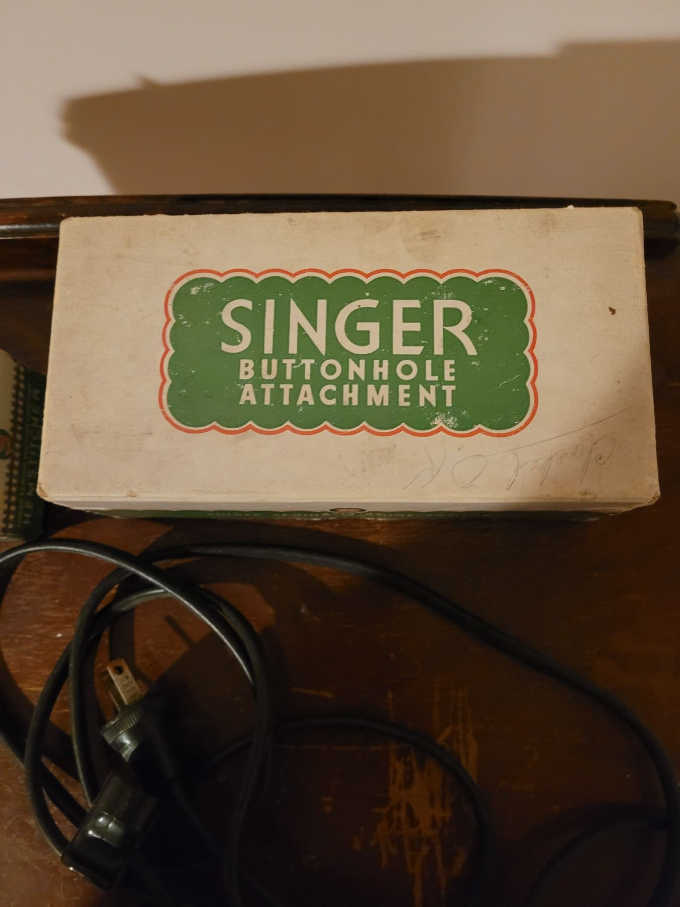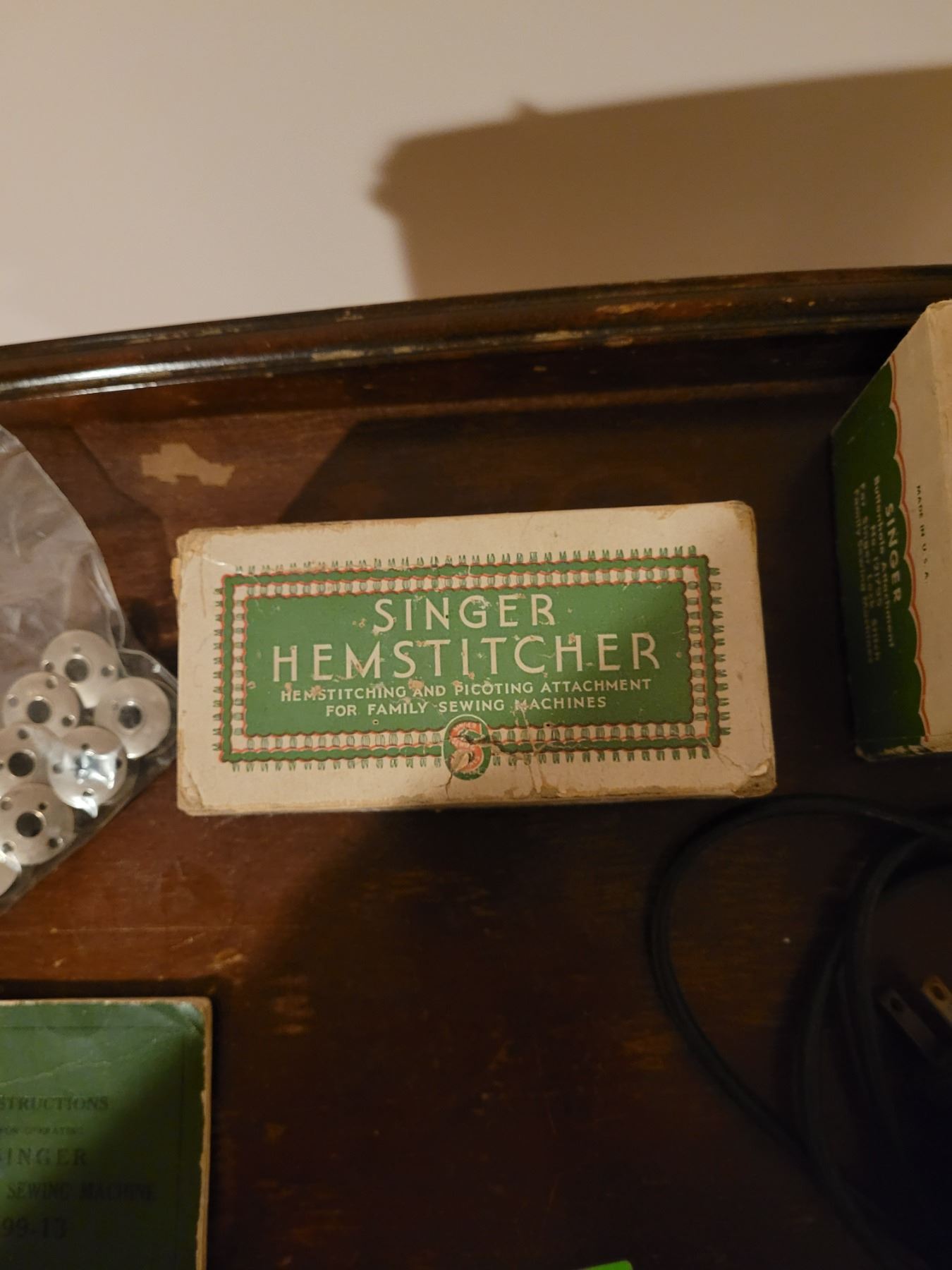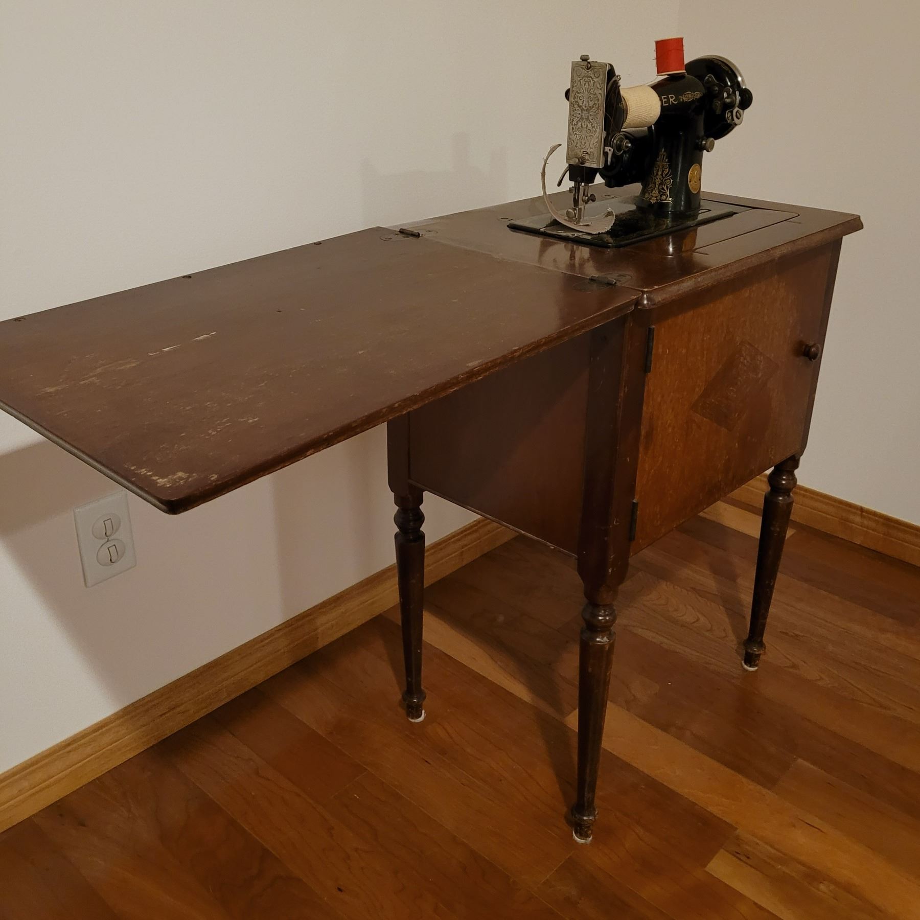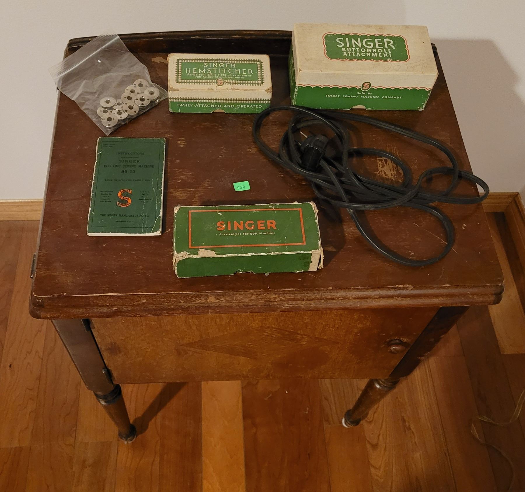 Singer electric sewing machine with all attachments in sewing cabinet - works