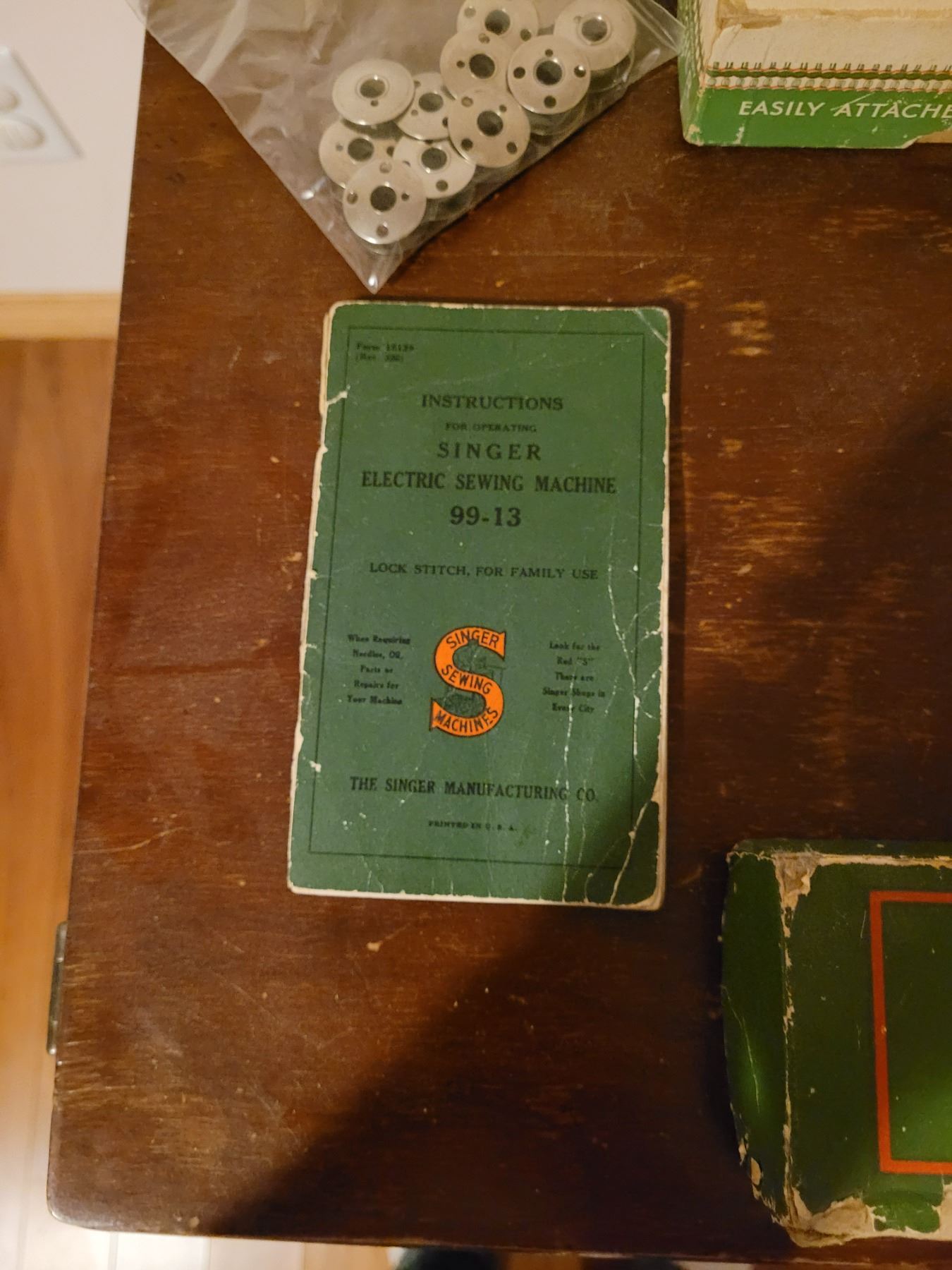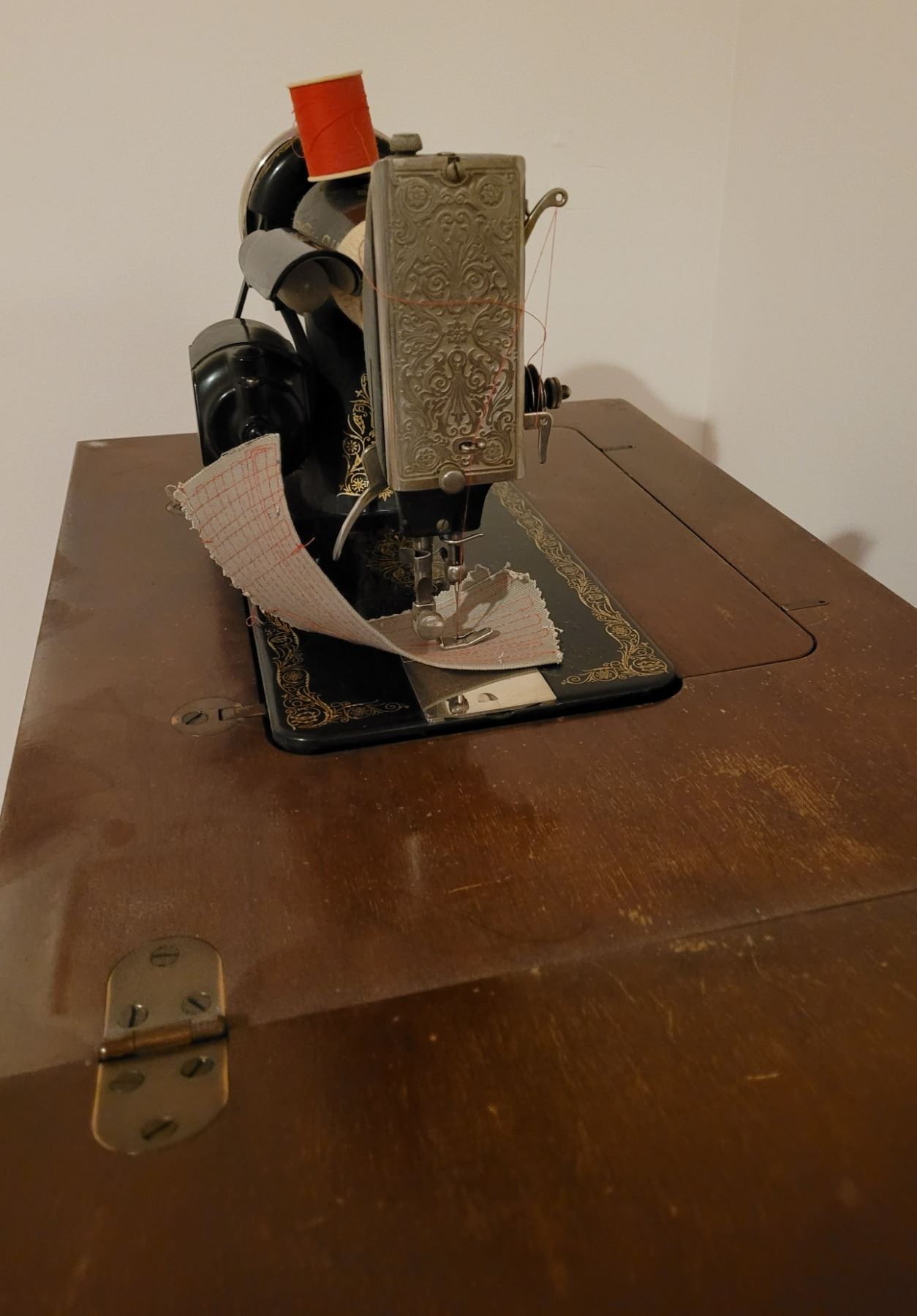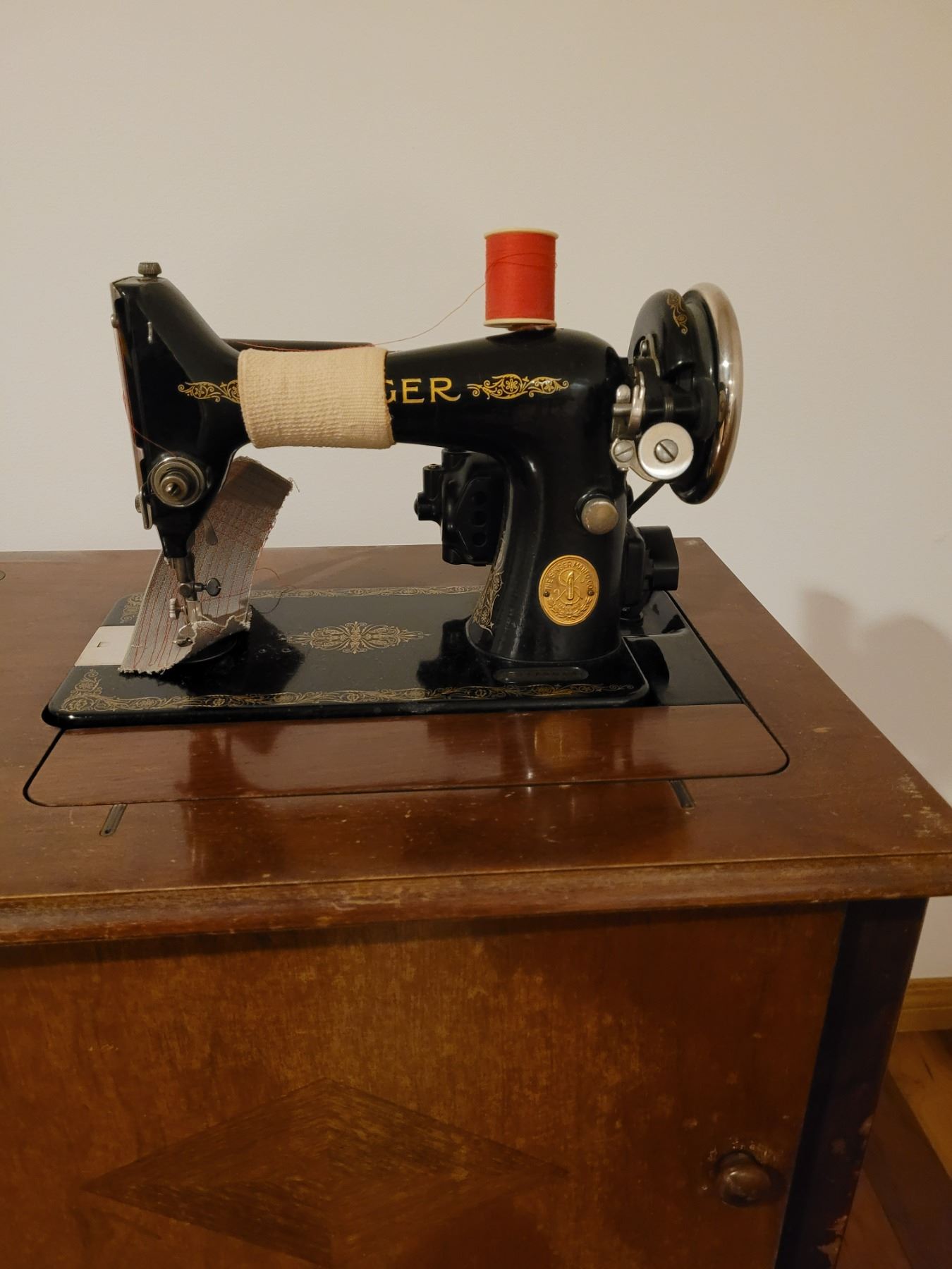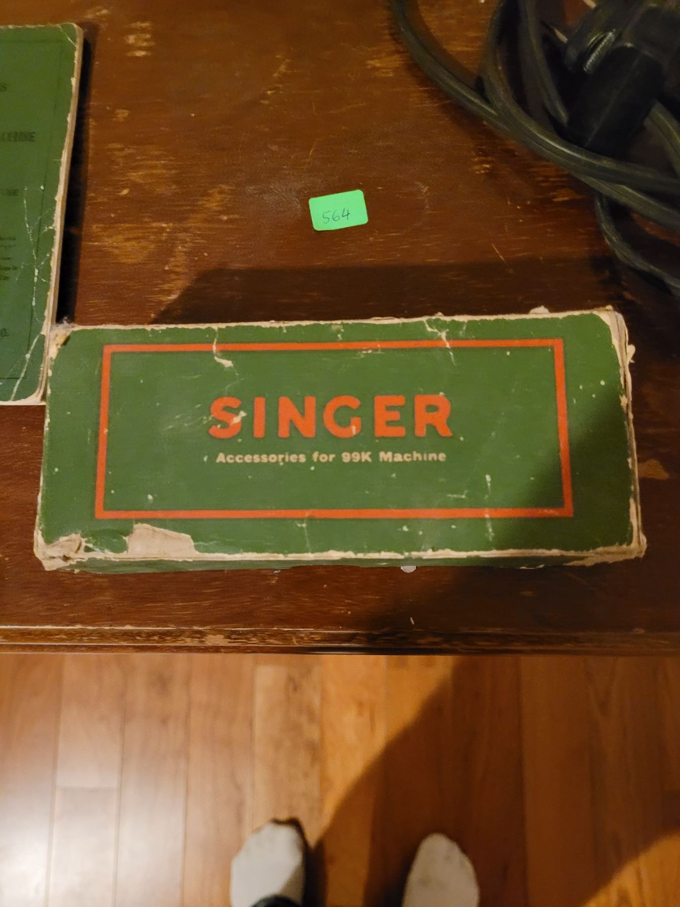 Singer electric sewing machine with all attachments in sewing cabinet - works