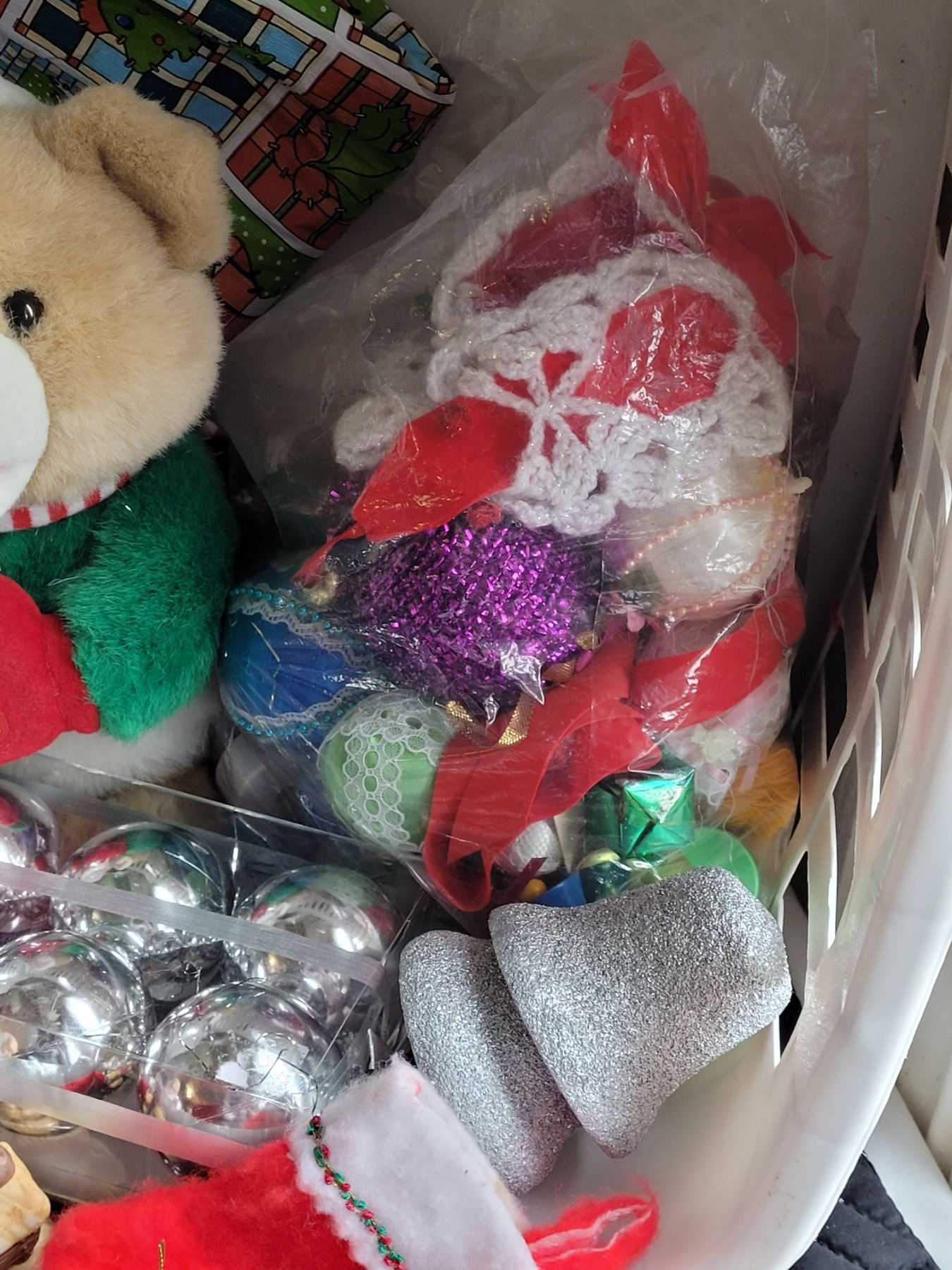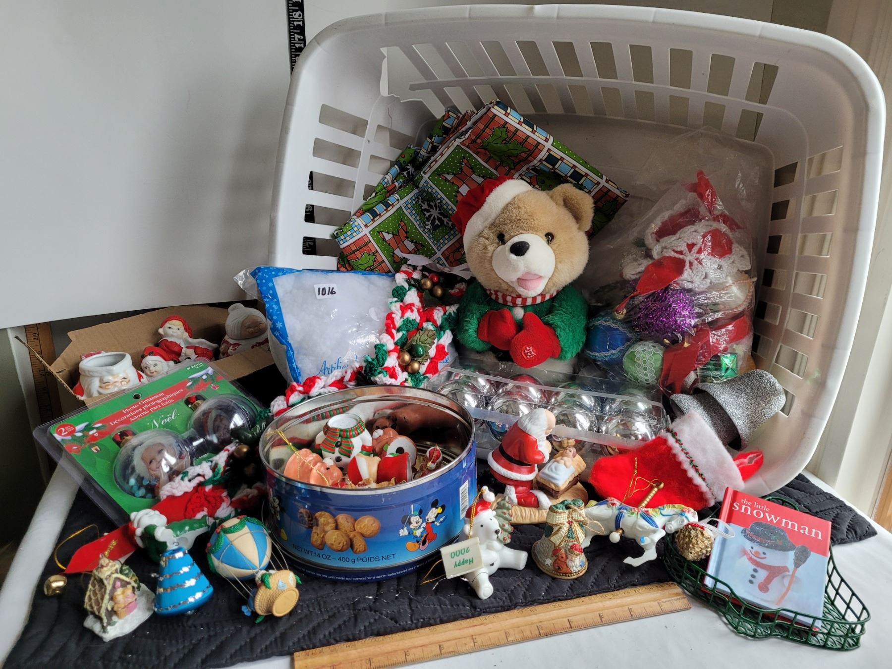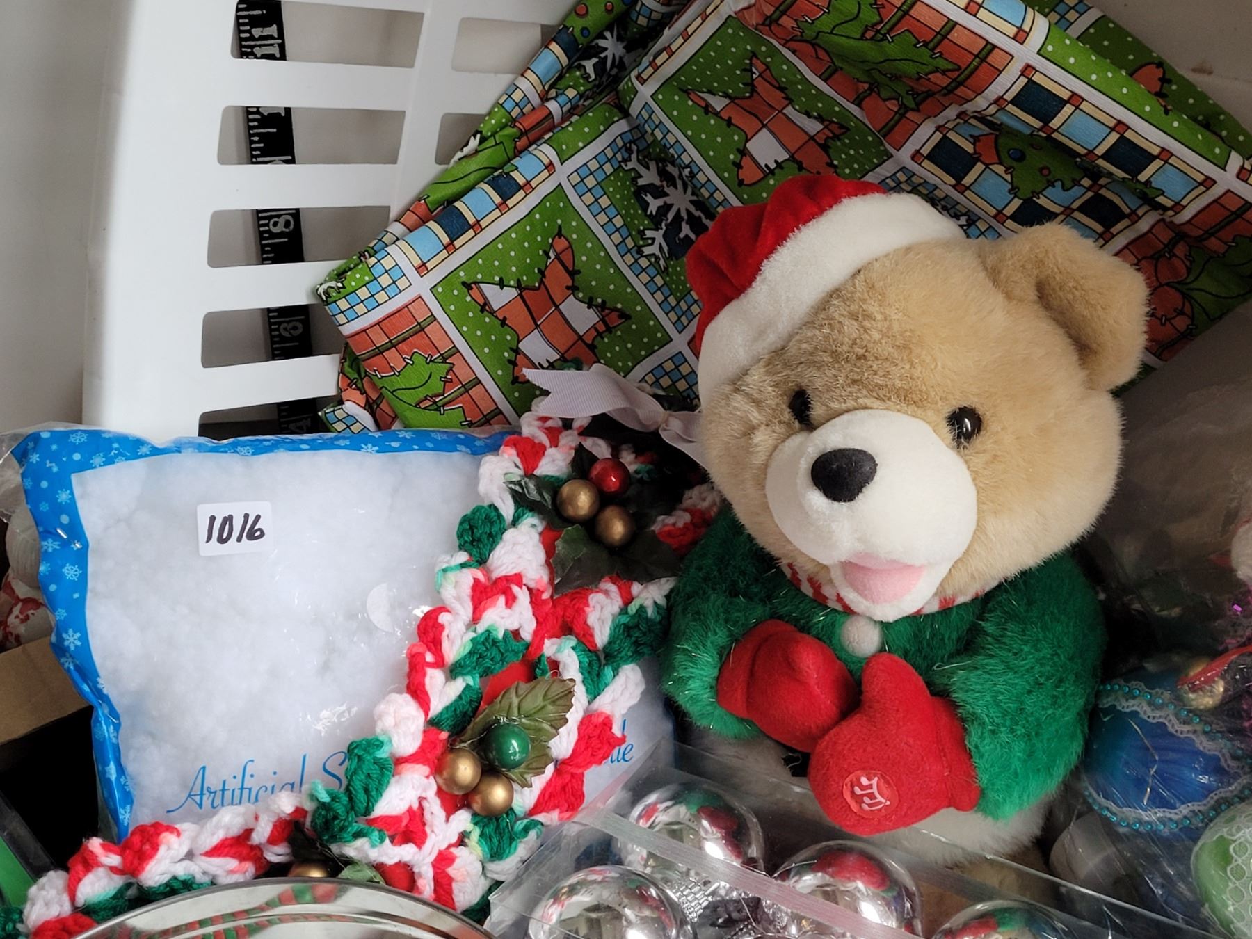 Singing Christmas Bear lot. Various decor & crafts in laundry basket.