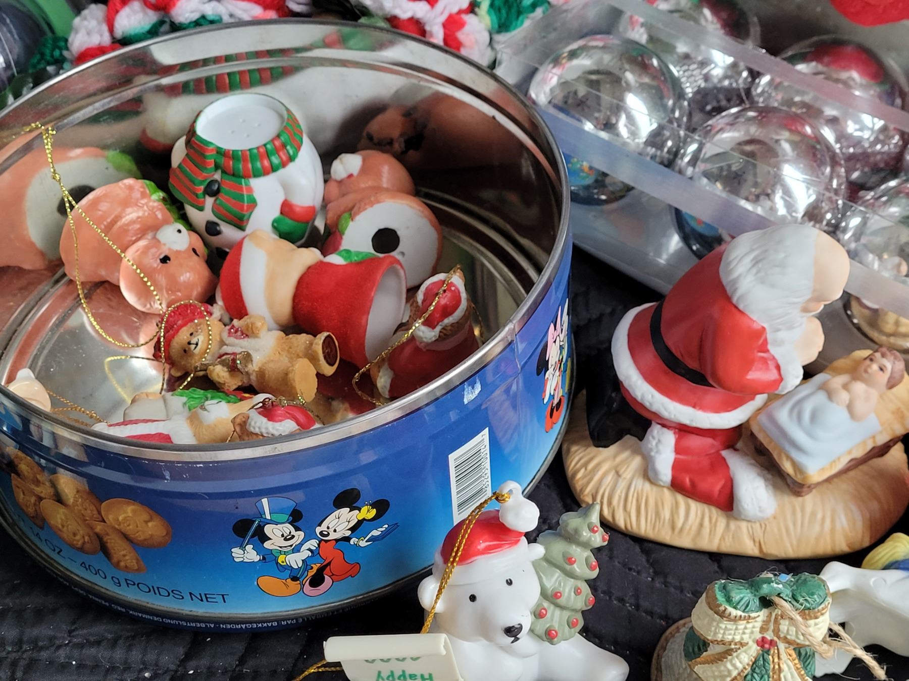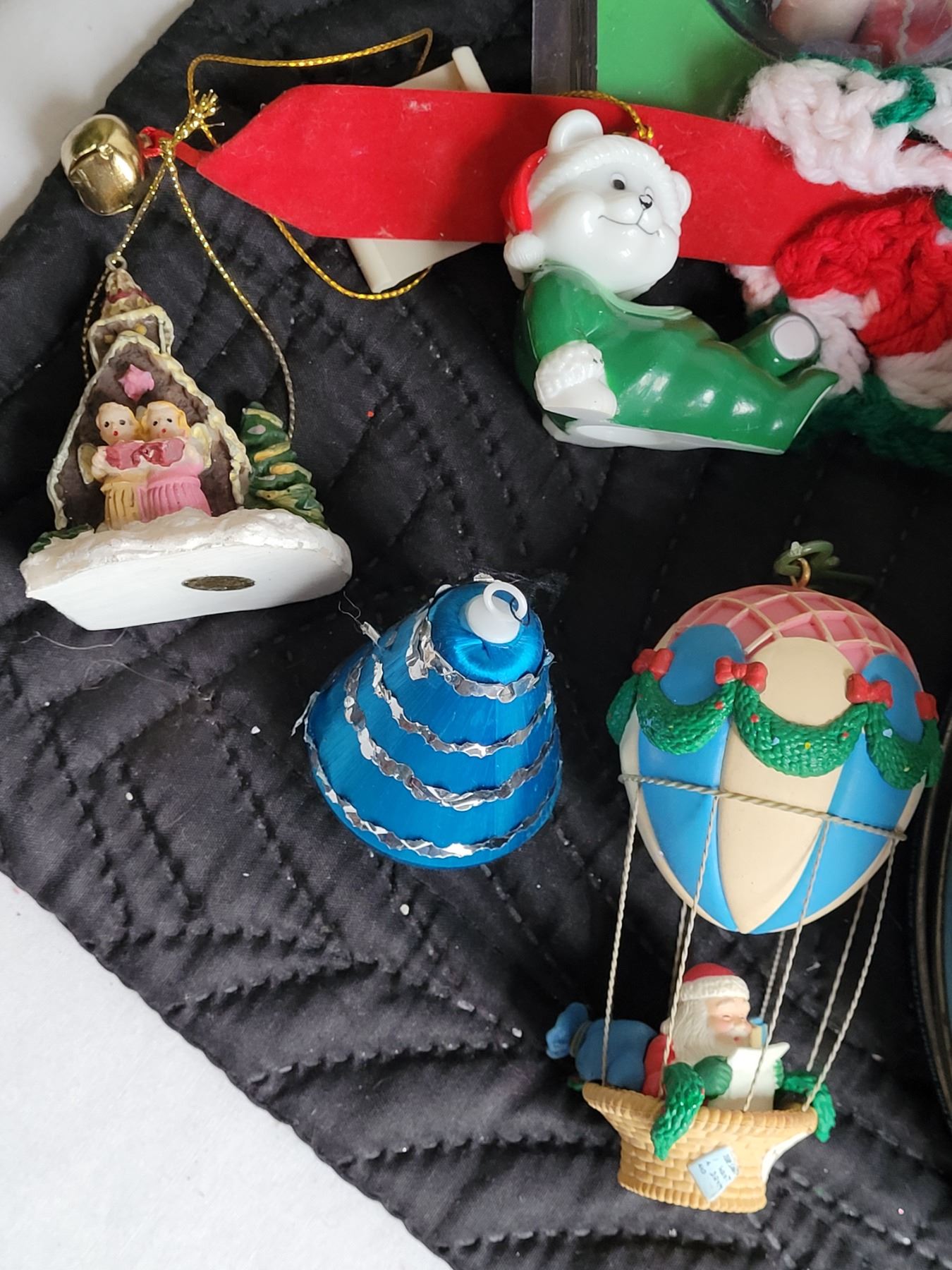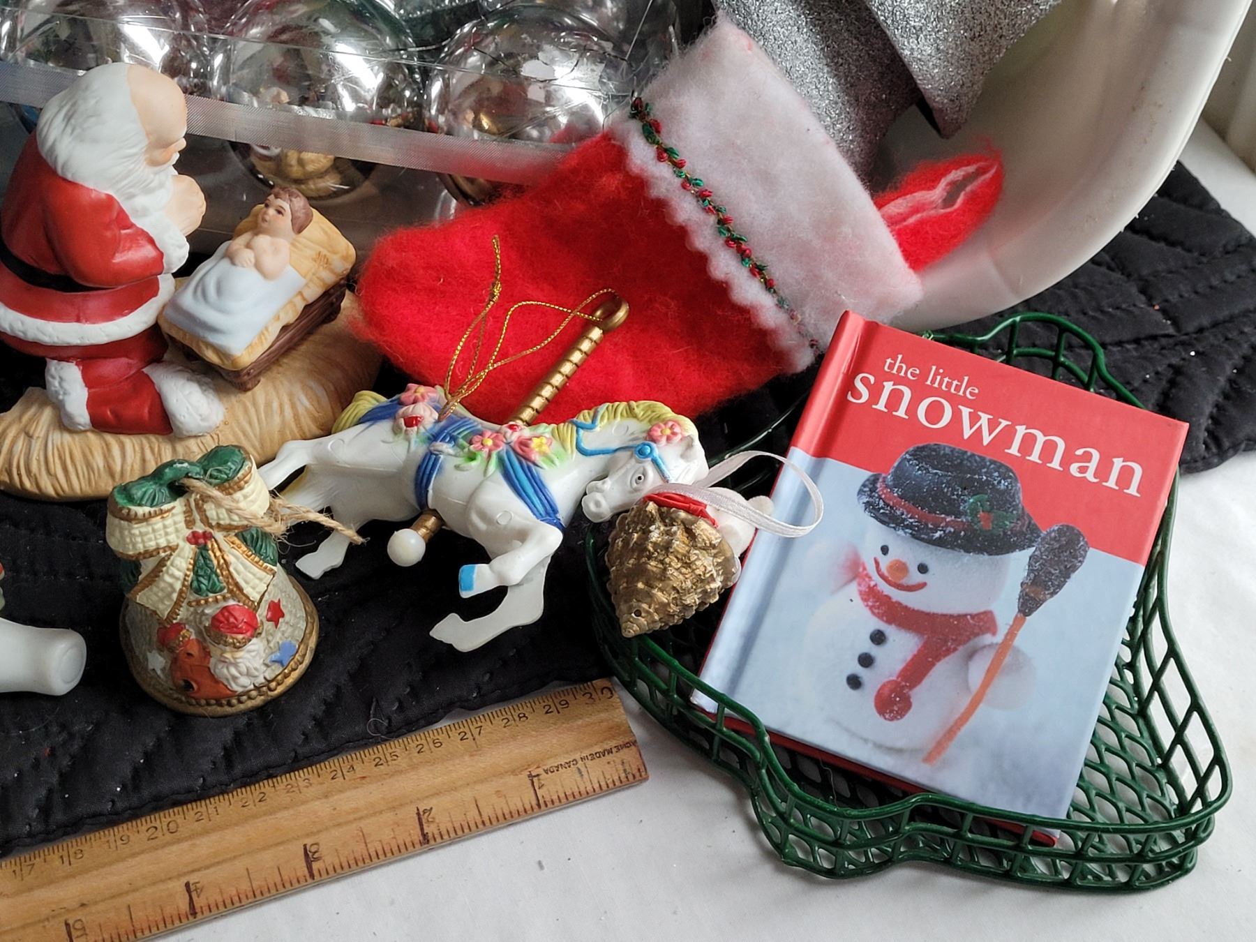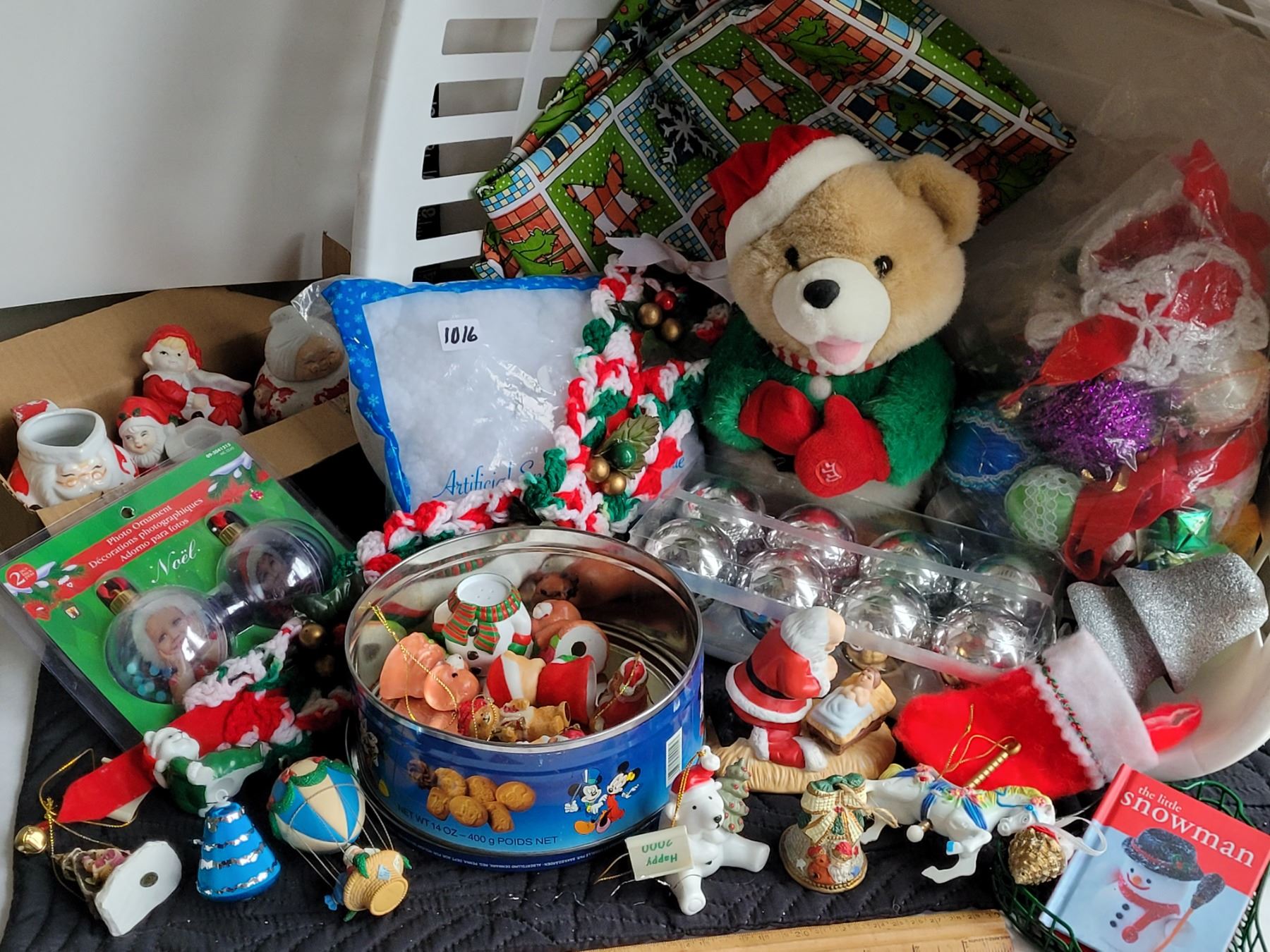 Singing Christmas Bear lot. Various decor & crafts in laundry basket.