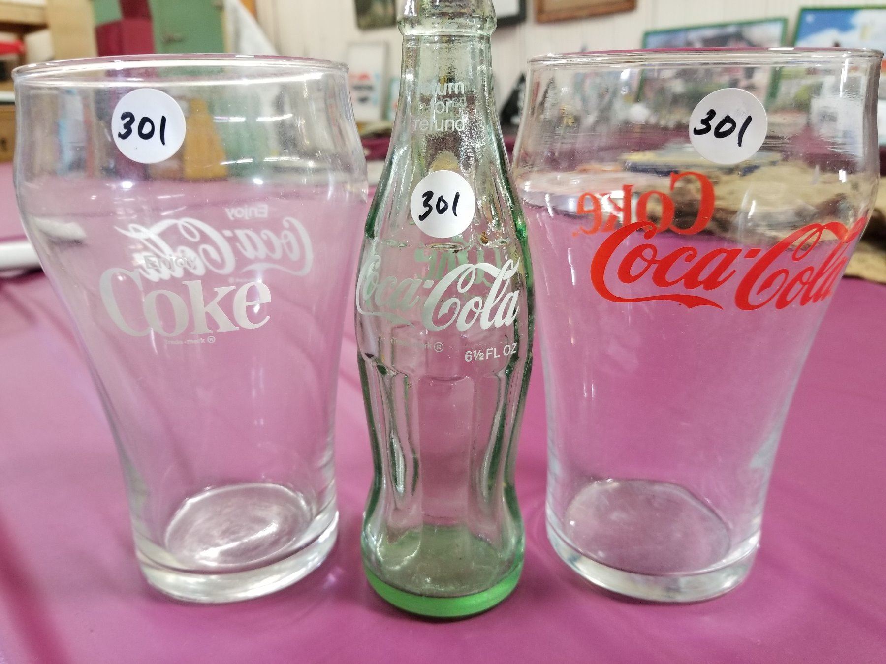 Single 1950s Green Coca Cola Bottle 6.5 oz with 2 large Coke soda glasses