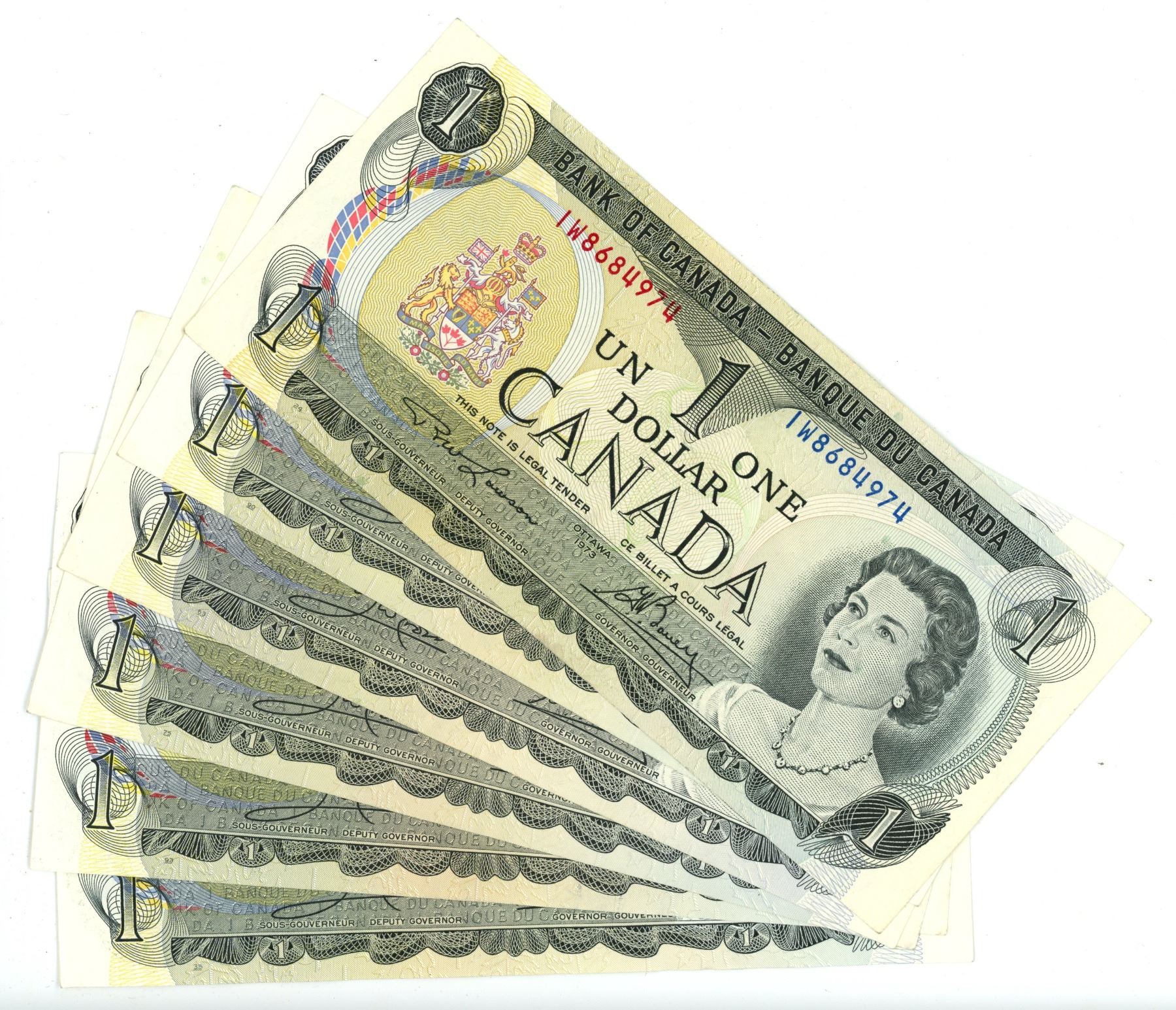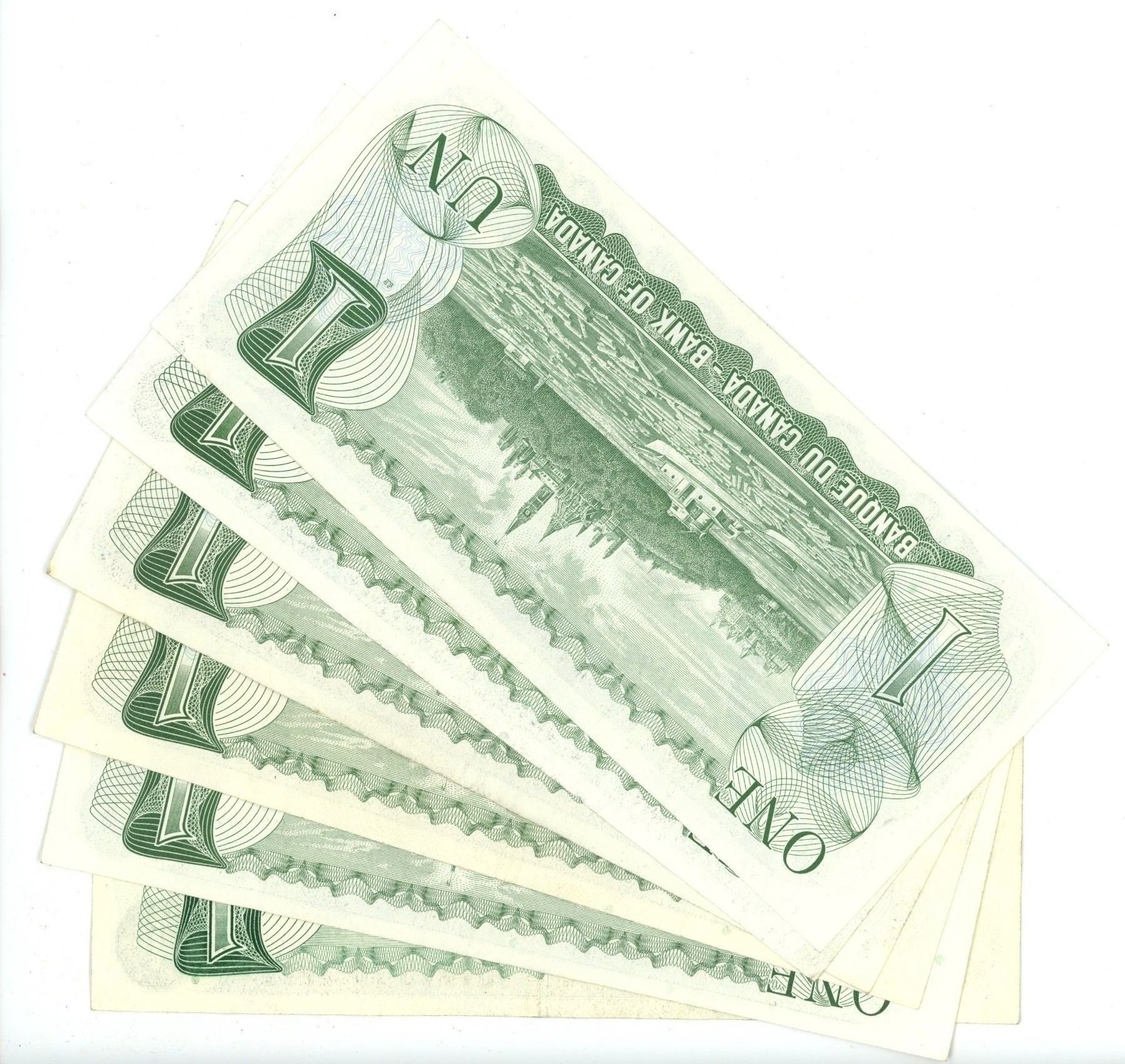 Six 1973 $1.00 A.U. Canadian bills